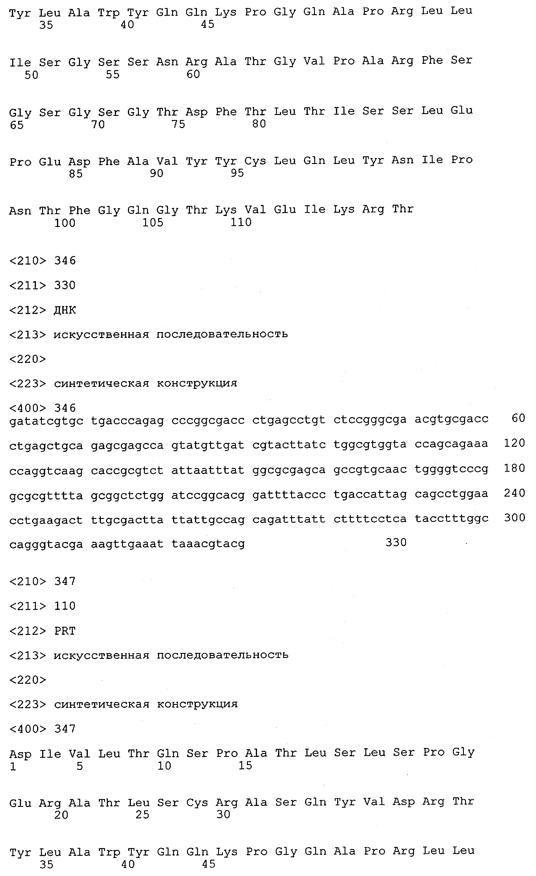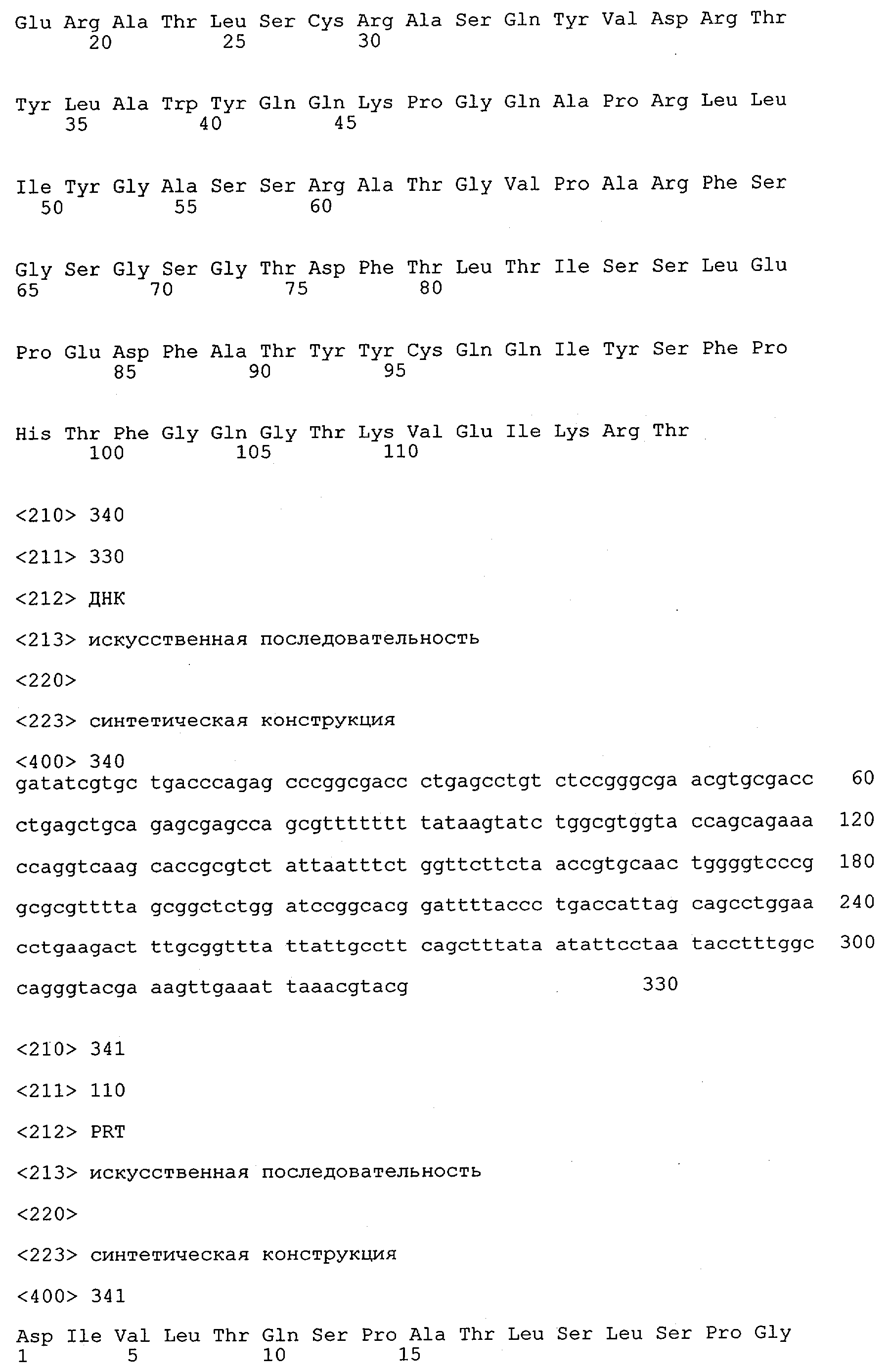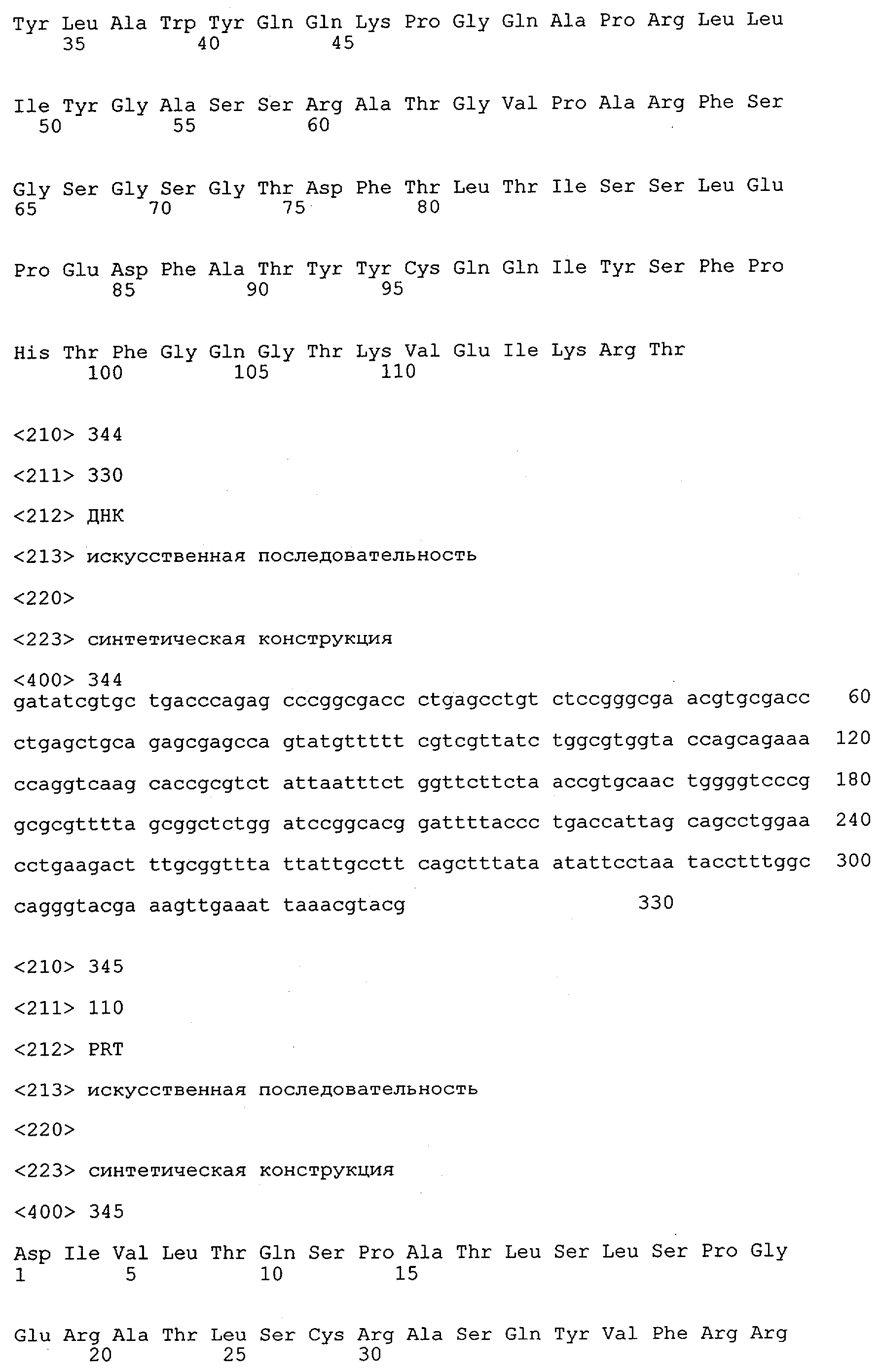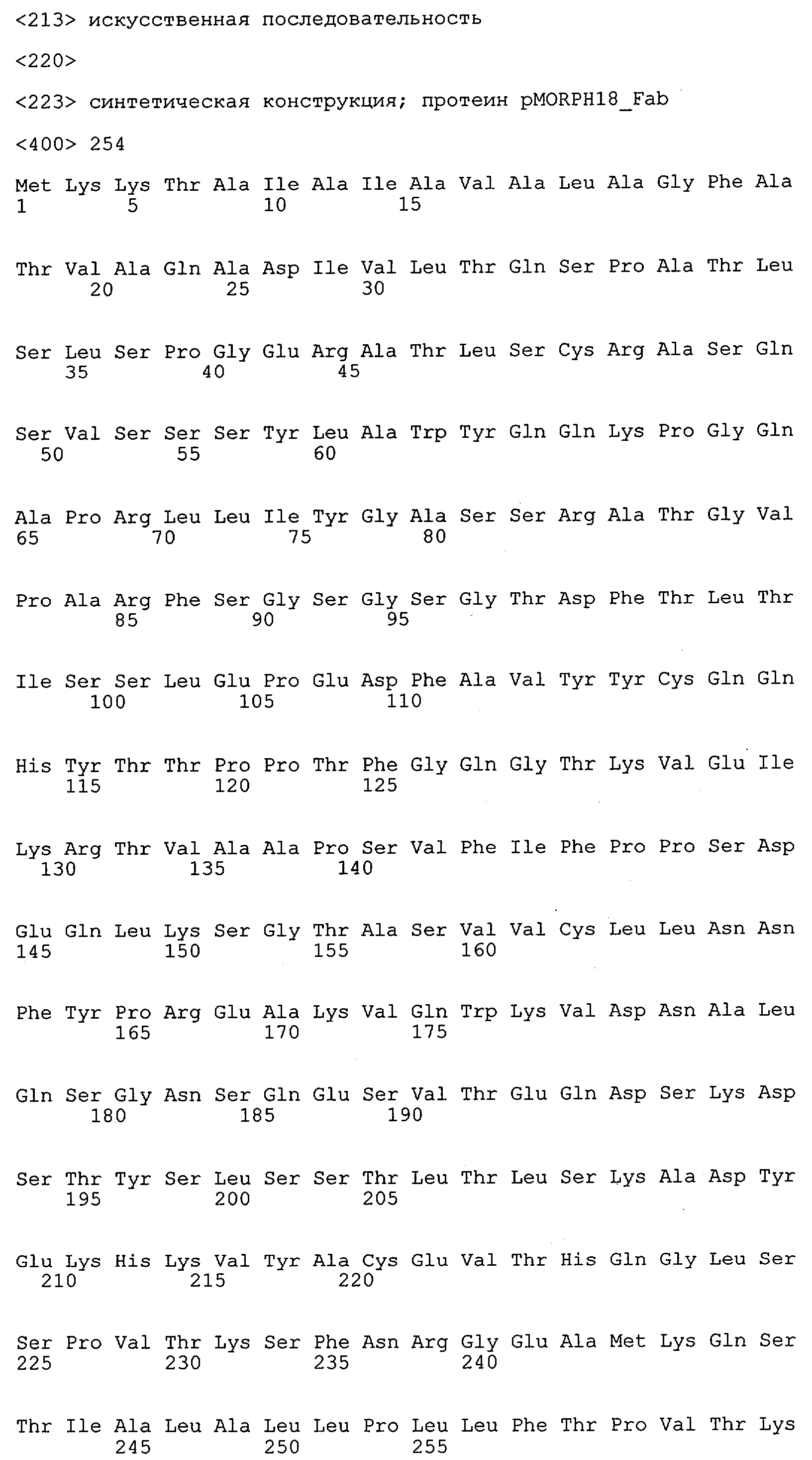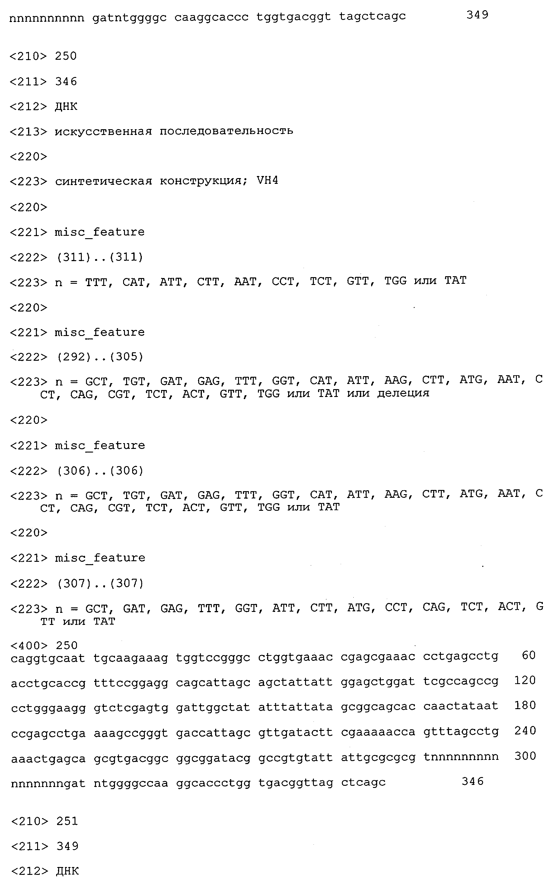 В противоположность этому отбор антител/молекул антител, предлагаемых в настоящем изобретении, обусловливается физической адгезией экспрессирующих Fab-фрагменты фагов с антигеном. В этом процессе отбора in vitro отсутствует стадия расщепления антигена. Фаги, экспрессирующие Fab-фрагмент, который обладает наиболее высокой аффинностью к антигену, отбирают и размножают. Синтетическая библиотека, применяемая в приведенных ниже примерах для отбора специфических молекул антител, предлагаемых в настоящем изобретении, наиболее пригодна для исключения любых стандартных ошибок, связанных с индивидуальными непрерывными эпитопами, которые часто встречаются в библиотеках, выведенных из иммунизированных В-клеток.