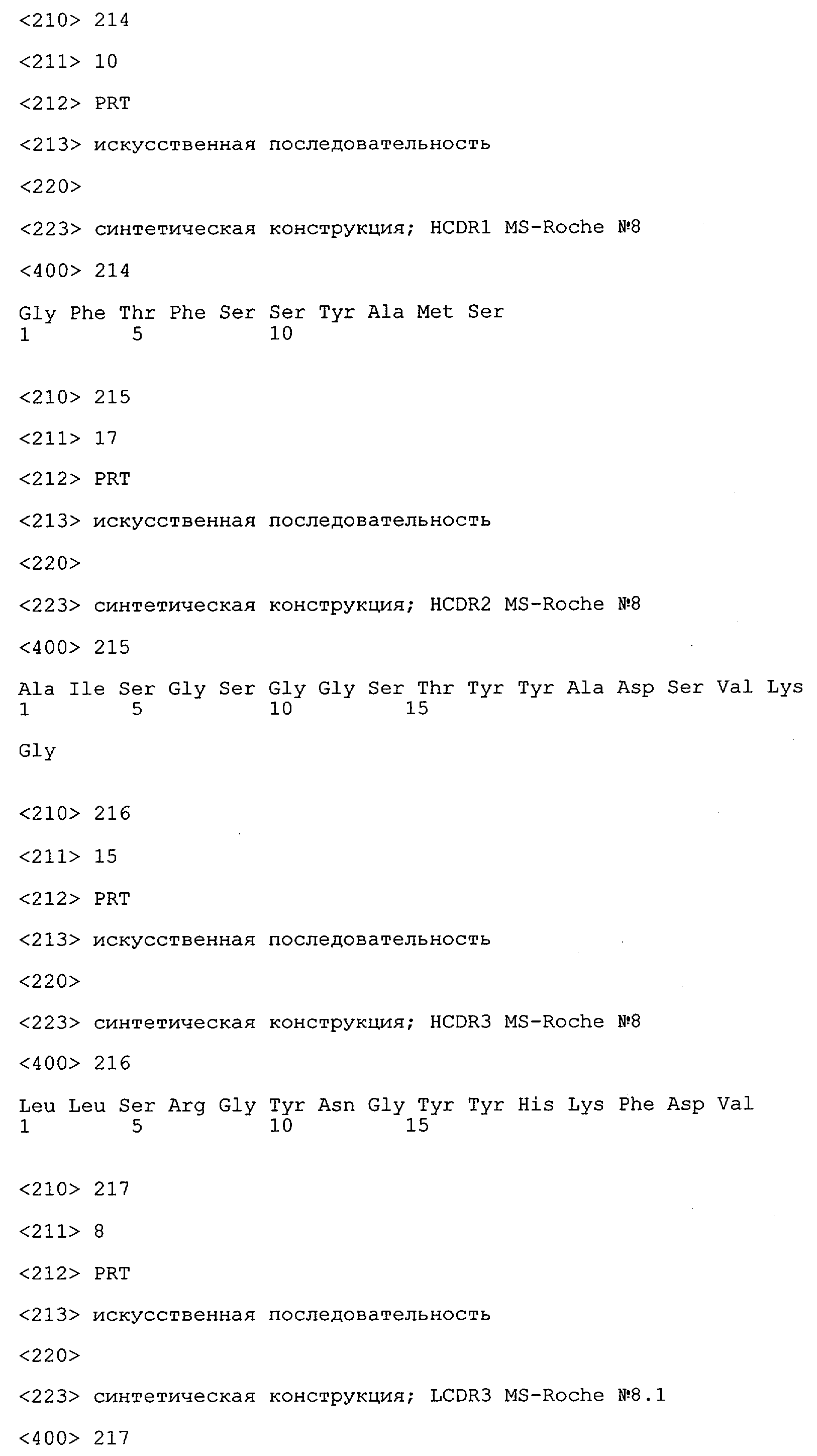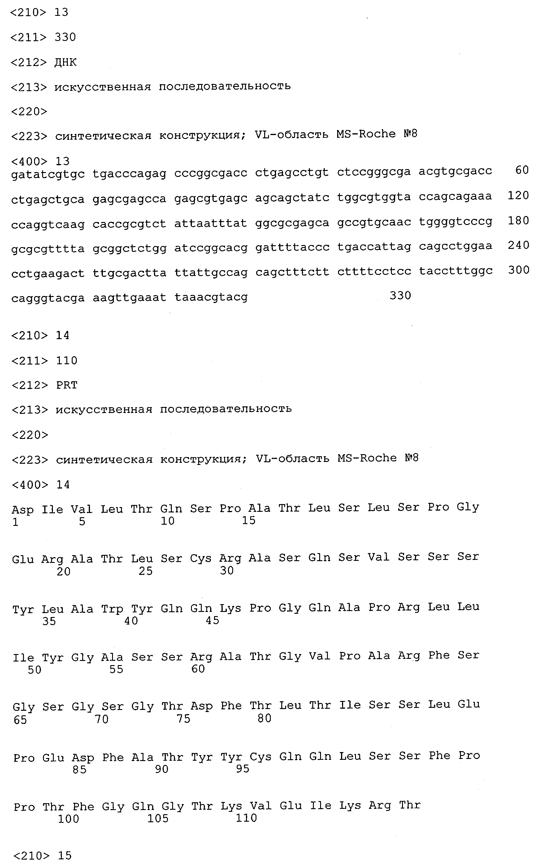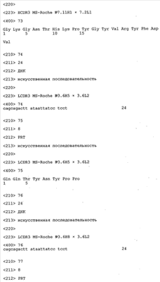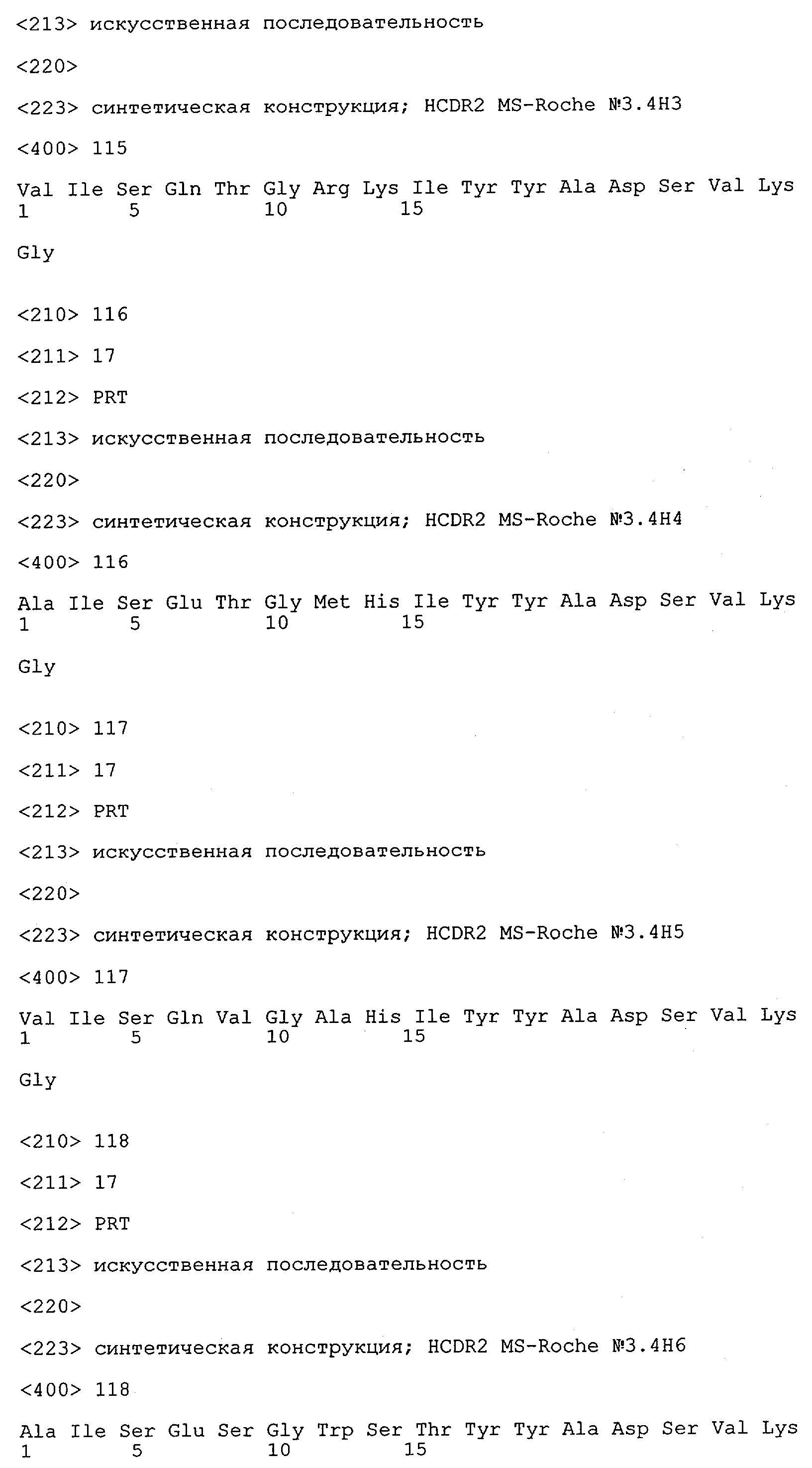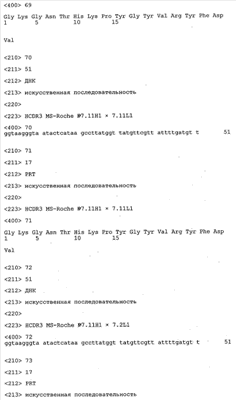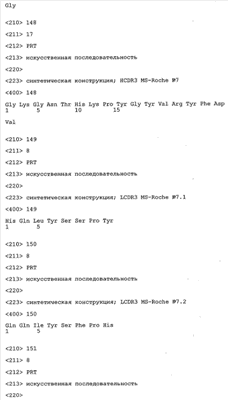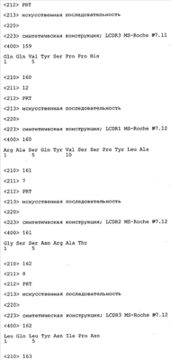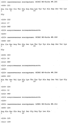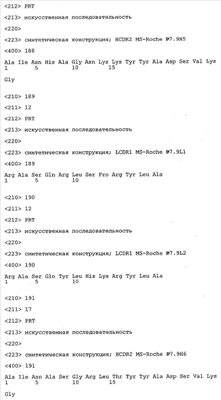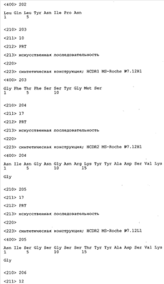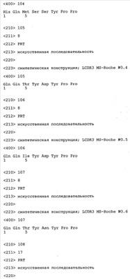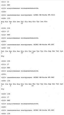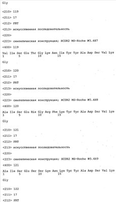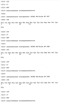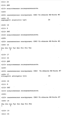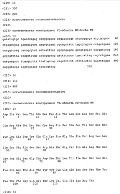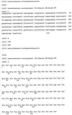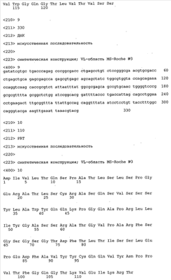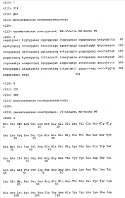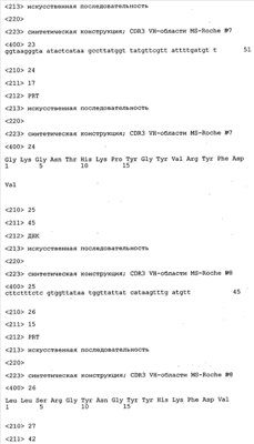 Особенно предпочтительно, когда молекула антитела, предлагаемая в изобретении, содержит вариабельную VH-область, кодируемую молекулой нуклеиновой кислоты, представленной в SEQ ID NO:3, 5 или 7, или вариабельную VH-область, которая имеет аминокислотные последовательности, представленные в SEQ ID NO:4, 6 или 8. Последовательности, представленные в SEQ ID NO:3 и 4, обозначают кодирующую область и аминокислотную последовательность соответственно VH-области предлагаемого в изобретении родительского антитела MSR-3 (MS-Roche 3), последовательности, представленные в SEQ ID NO:5 и 6, обозначают кодирующую область и аминокислотную последовательность соответственно VH-области предлагаемого в изобретении родительского антитела MSR-7 (MS-Roche 7), и SEQ ID NO:7 и 8 обозначают кодирующую область и аминокислотную последовательность соответственно VH-области предлагаемого в изобретении родительского антитела MSR-8 (MS-Roche 8). Таким образом, изобретение относится также к молекулам антител, которые содержат вариабельную VL-область, кодируемую молекулой нуклеиновой кислоты, которая имеет последовательность (SEQ ID NO), выбранную из ряда, включающего SEQ ID NO:9, 11 или 13, или вариабельную VL-область, имеющую аминокислотную последовательность, которая представлена в SEQ ID NO:10, 12 или 14. SEQ ID NO:9 и 10 соответствуют VL-области MSR-3, SEQ ID NO:11 и 12 соответствуют VL-области MSR-7 и SEQ ID NO:13 и 14 соответствуют VL-области MSR-8. Как описано в приведенных ниже примерах, родительские антитела MSR-3, -7 и -8 применяют для последующего создания оптимизированных молекул антител, которые обладают либо улучшенными свойствами и/или сродством к связыванию. Некоторые из соответствующих и возможных стратегий представлены в настоящем описании и приведены ниже в примерах.