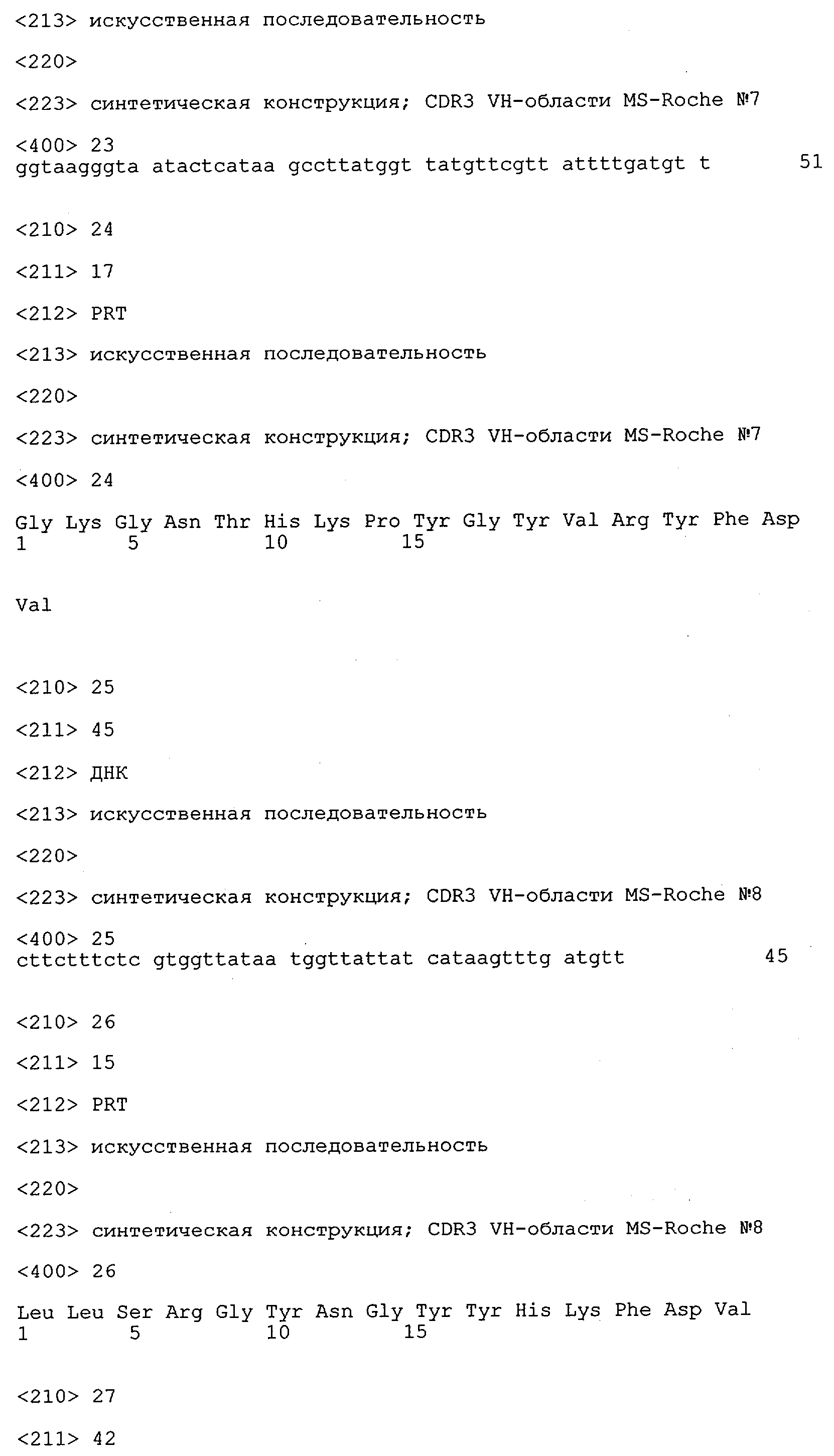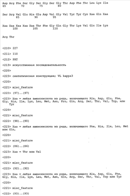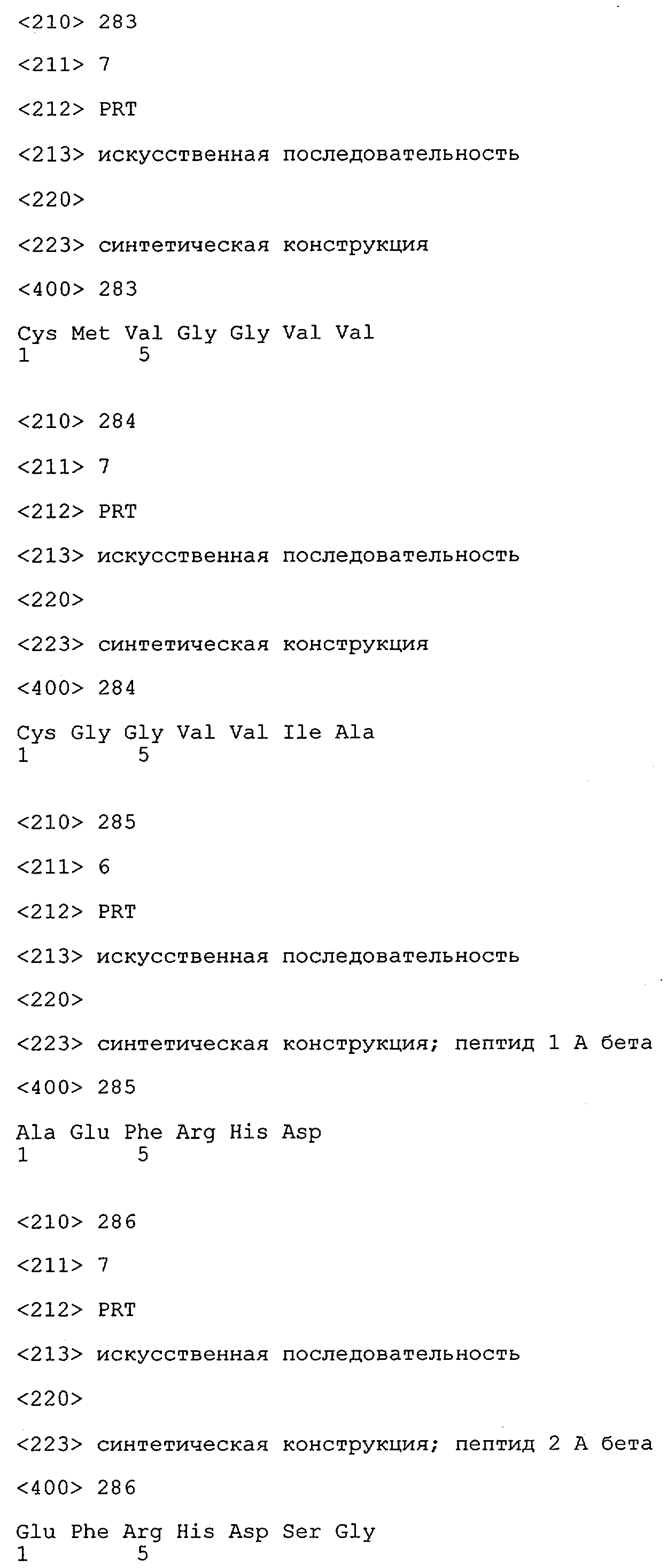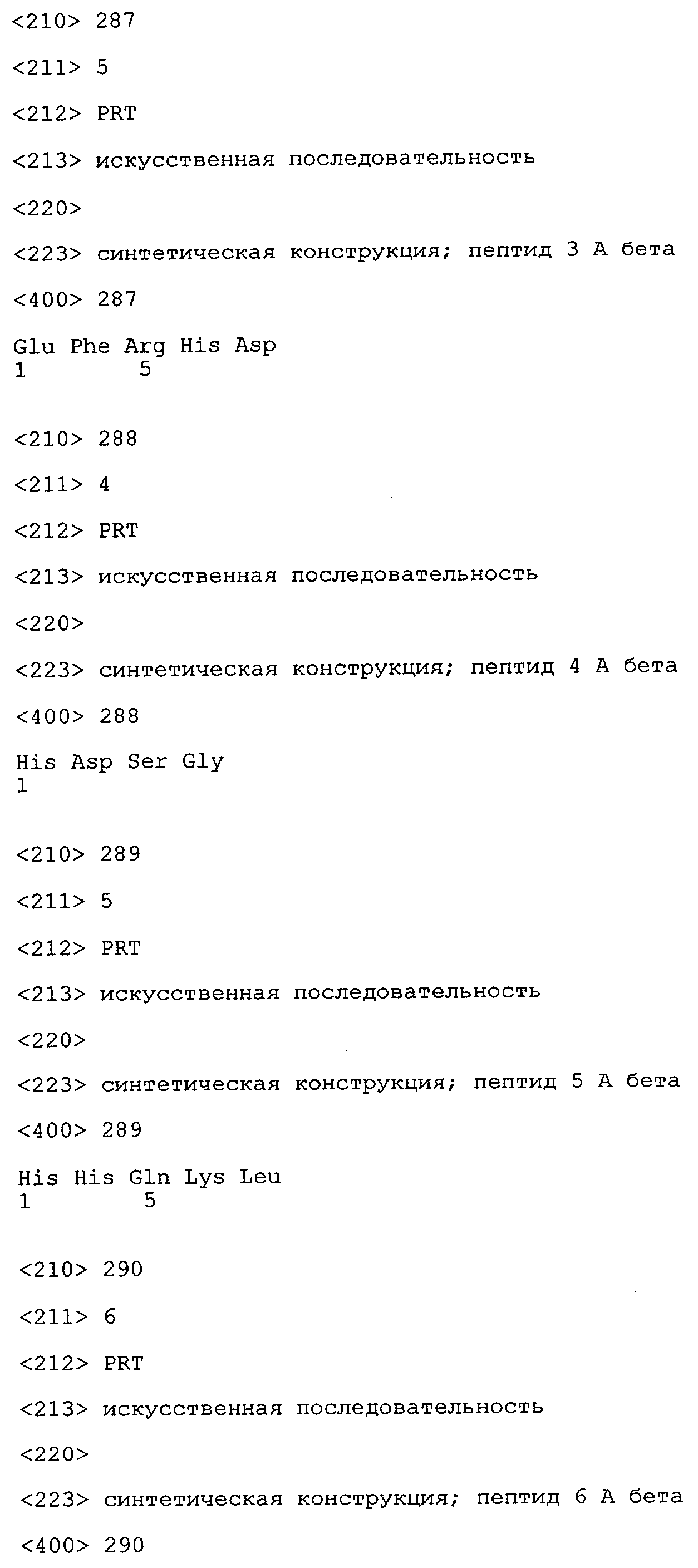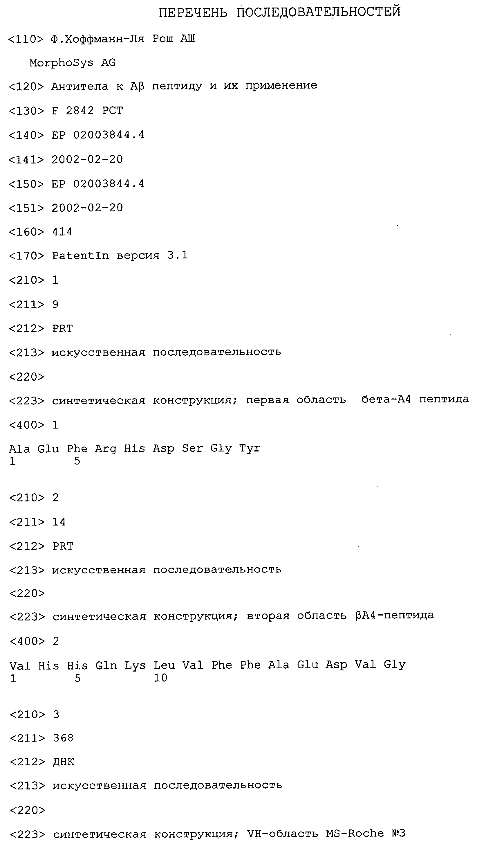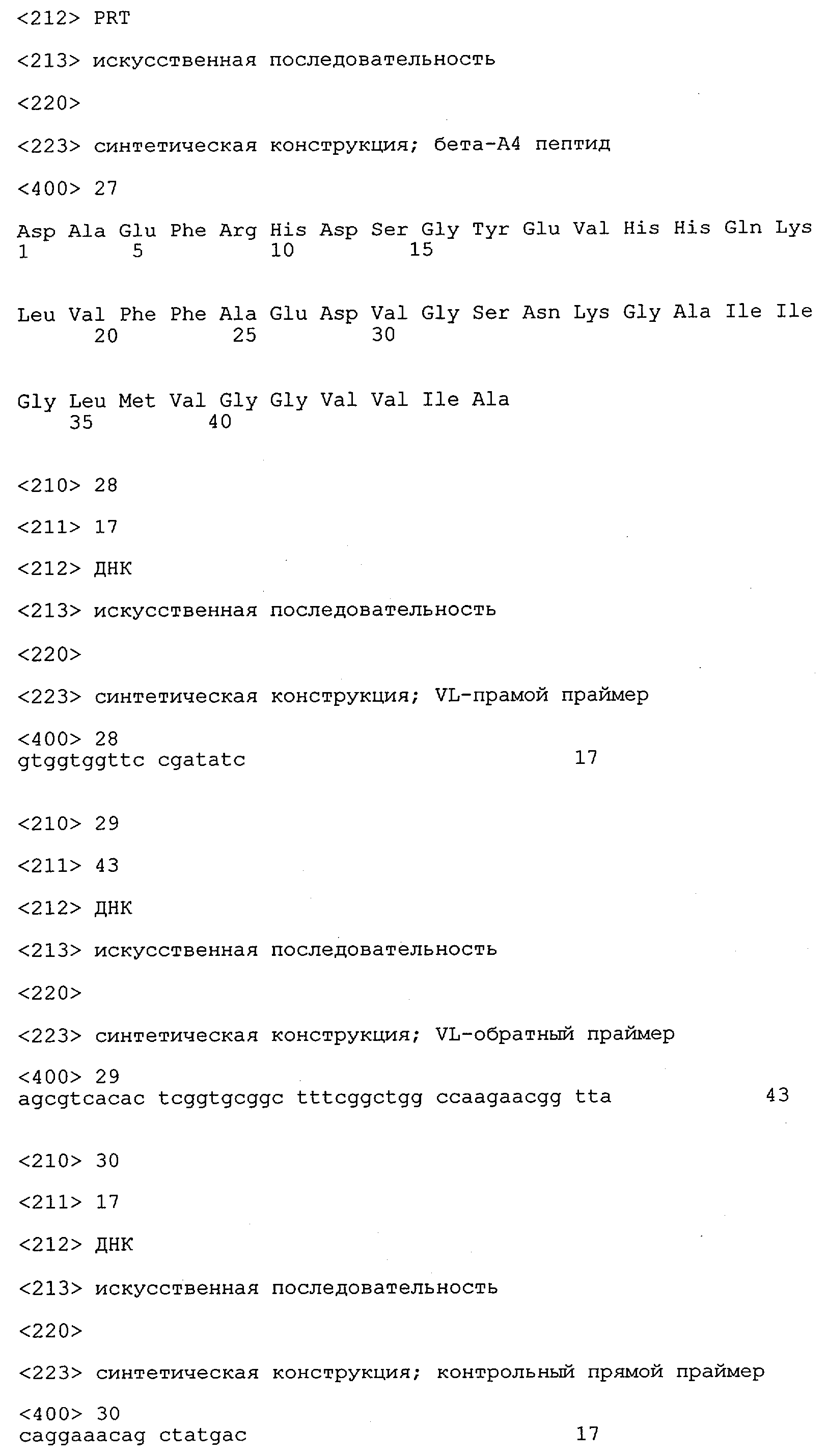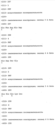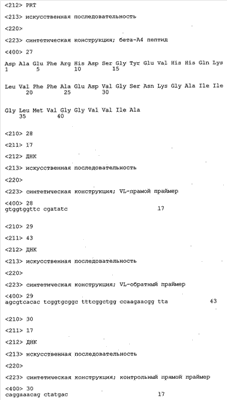 Понятие может относиться также к конформационному эпитопу, структурному эпитопу или к прерывистому эпитопу, состоящему из указанных двух областей или их фрагментов; см. также у Geysen (1986), loc. cit. В контексте настоящего описания конформационный эпитоп определен двумя или большим количеством дискретных аминокислотных последовательностей, разделенных на первичной последовательности, которые появляются вместе на поверхности, когда происходит укладка полипептида с образованием нативного протеина (Sela, Science 166, 1996, с.1365 и Laver, Cell 61, 1990, сс.553-556). Молекулы антител, предлагаемые в настоящем изобретении, вероятно, специфически связываются/взаимодействуют с конформационным(ыми)/структурным(и) эпитопом(ами), который(е) состоят из и/или содержат две описанные выше области -А4 или их фрагменты, что будет подробнее описано ниже. Считается, что «молекулы антител», предлагаемые в настоящем изобретении, обладают одновременно и независимо двойной специфичностью по отношению к (а) аминокислотному участку, содержащему аминокислоты 2-10 (или его фрагменту(ам)) пептида -А4, и (б) аминокислотному участку, содержащему аминокислоты 12-25 (или его фрагменту(ам)) пептида -А4 (SEQ ID NO.27). Фрагменты или части этих участков содержат по меньшей мере две, более предпочтительно по меньшей мере три аминокислоты. Предпочтительные фрагменты или части расположены в первой области/участке SEQ ID NO:27 и имеют аминокислотные последовательности AEFRHD, EF, EFR, FR, EFRHDSG, EFRHD или HDSG и во второй области/участке SEQ ID NO:27 и имеют аминокислотные последовательности HHQKL, LV, LVFFAE, VFFAED VFFA или FFAEDV. Как отмечалось выше, эти фрагменты могут содержать также дополнительные аминокислоты или могут представлять собой части указанных выше фрагментов. Их конкретными примерами являются DAE, DAEF, FRH или RHDSG.