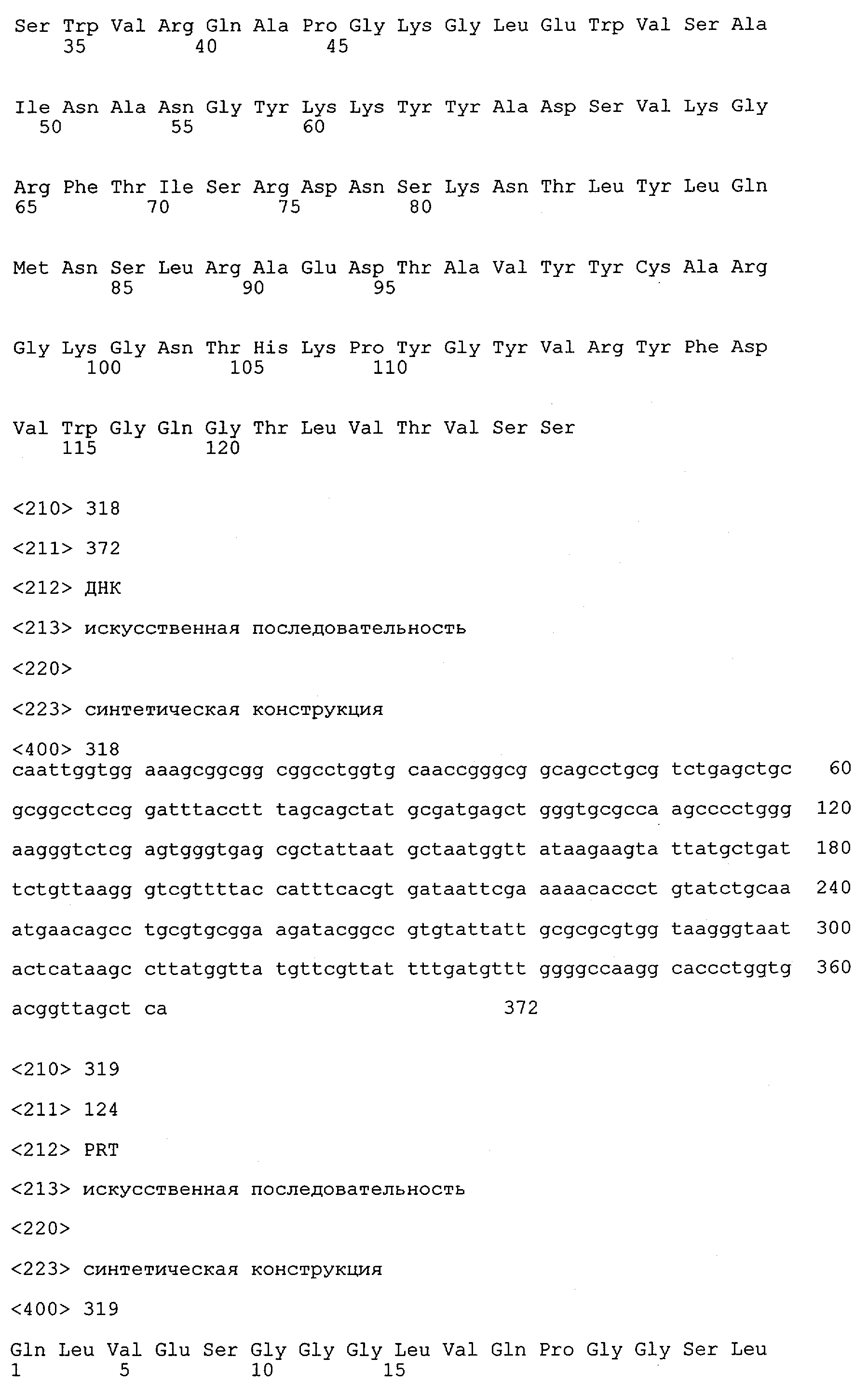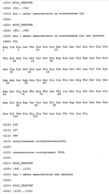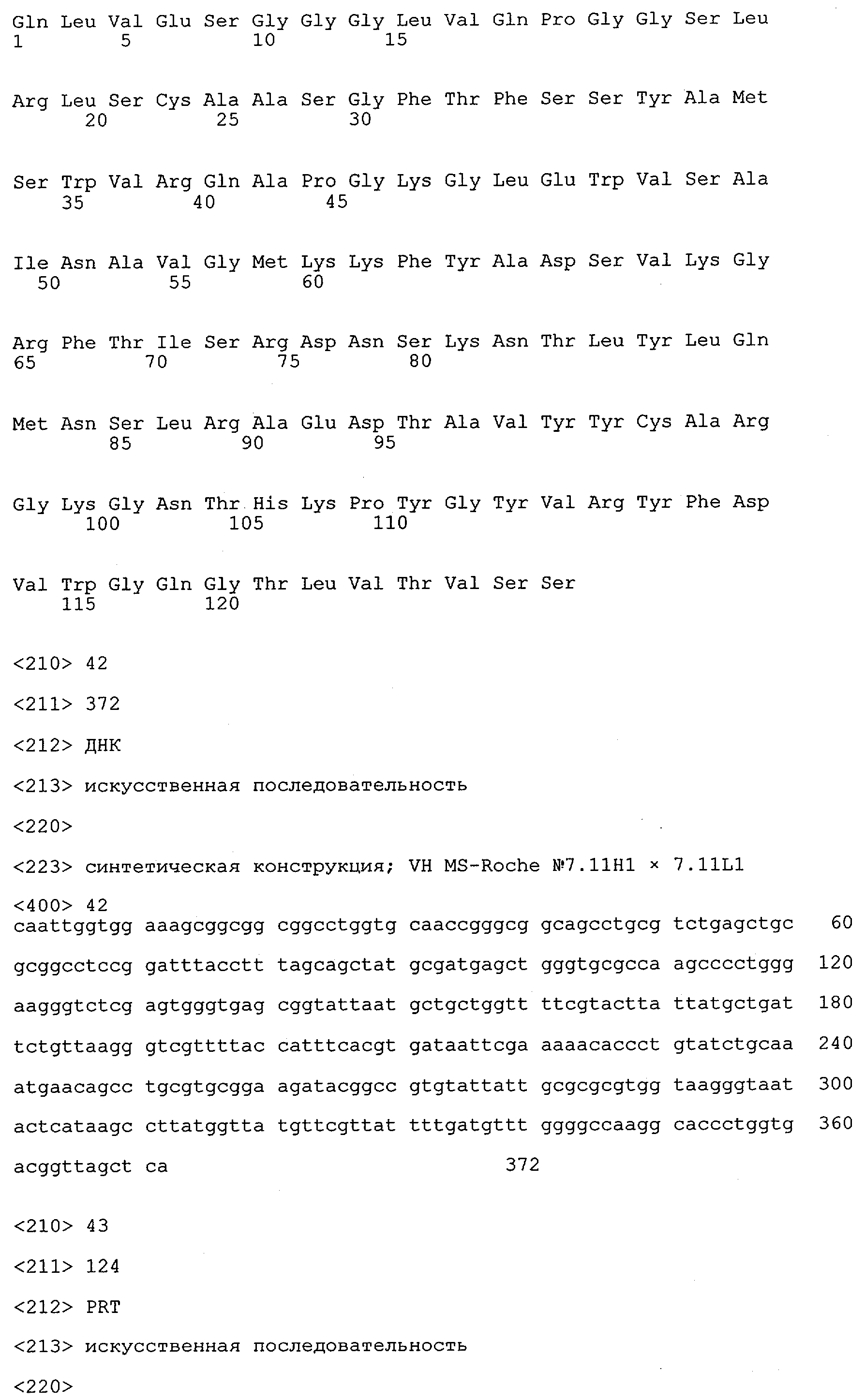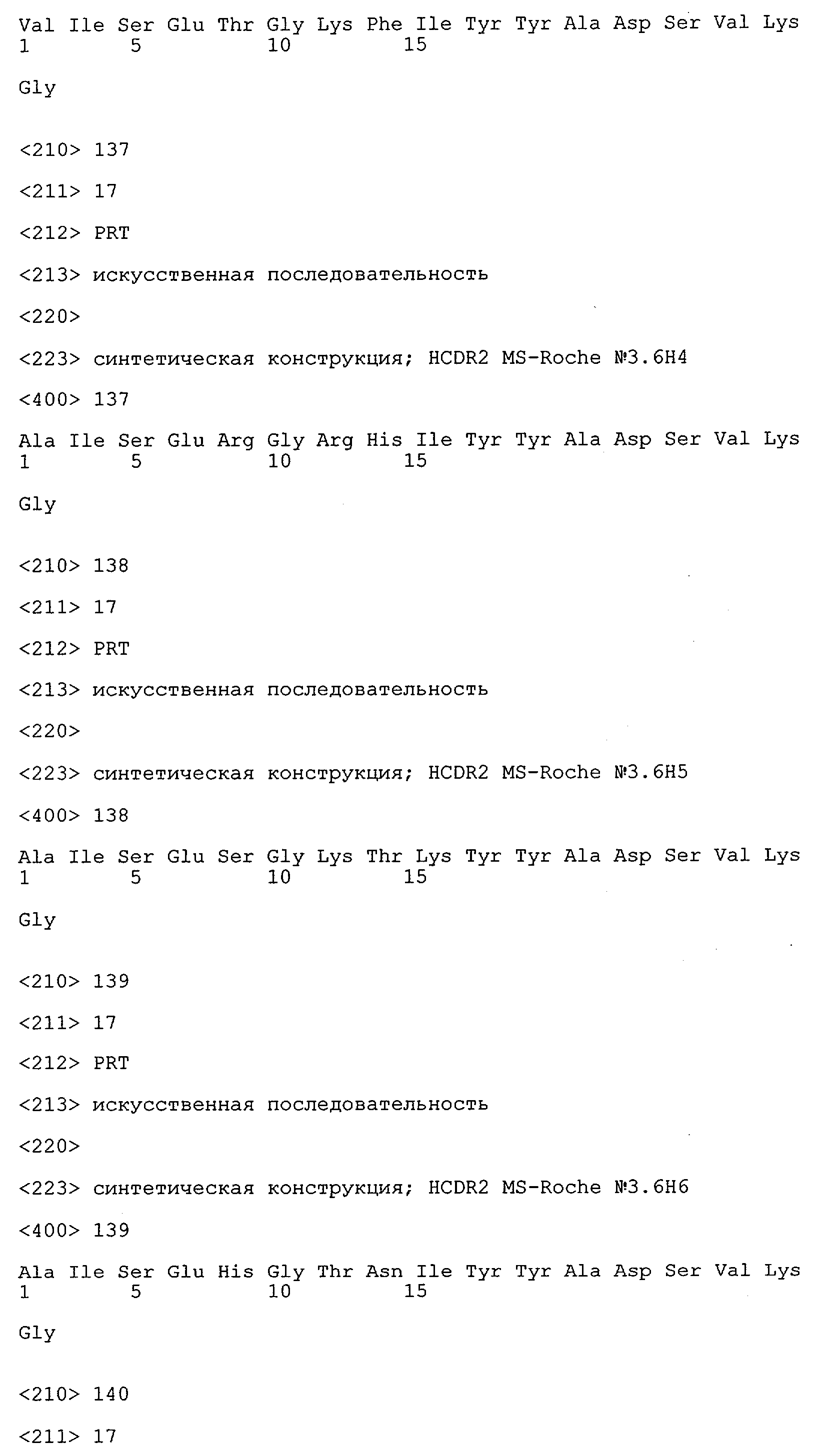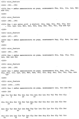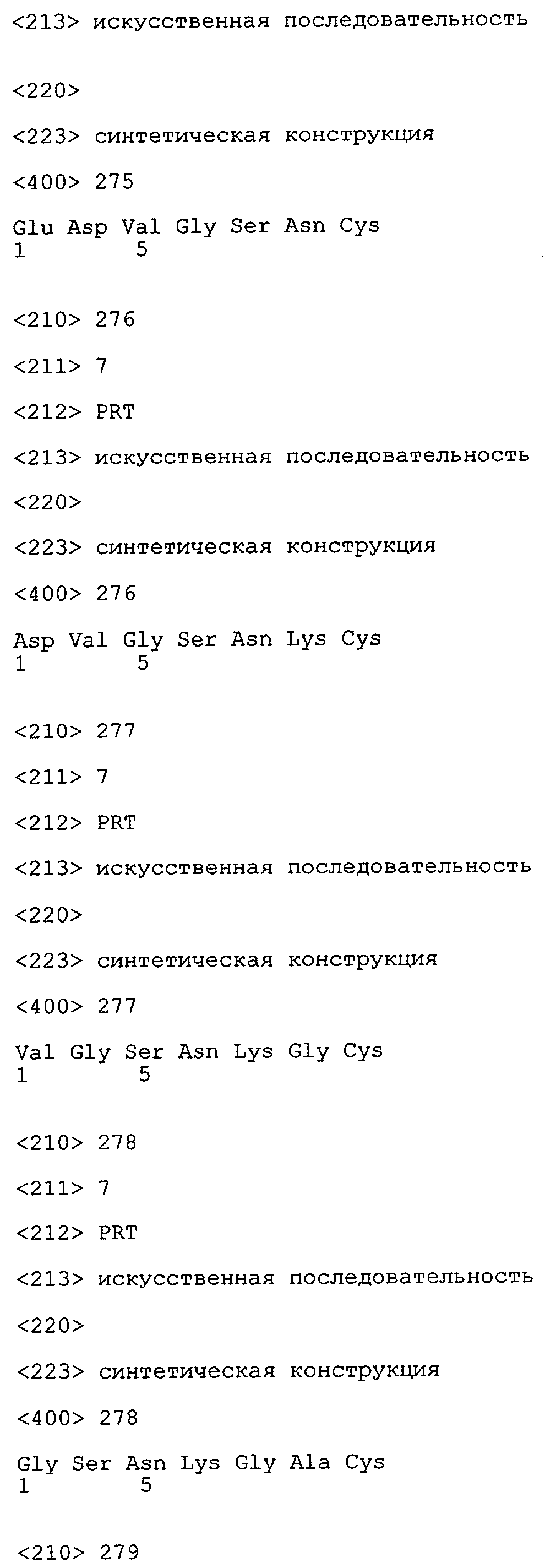Понятие может относиться также к конформационному эпитопу, структурному эпитопу или к прерывистому эпитопу, состоящему из указанных двух областей или их фрагментов; см. также у Geysen (1986), loc. cit. В контексте настоящего описания конформационный эпитоп определен двумя или большим количеством дискретных аминокислотных последовательностей, разделенных на первичной последовательности, которые появляются вместе на поверхности, когда происходит укладка полипептида с образованием нативного протеина (Sela, Science 166, 1996, с.1365 и Laver, Cell 61, 1990, сс.553-556). Молекулы антител, предлагаемые в настоящем изобретении, вероятно, специфически связываются/взаимодействуют с конформационным(ыми)/структурным(и) эпитопом(ами), который(е) состоят из и/или содержат две описанные выше области -А4 или их фрагменты, что будет подробнее описано ниже. Считается, что «молекулы антител», предлагаемые в настоящем изобретении, обладают одновременно и независимо двойной специфичностью по отношению к (а) аминокислотному участку, содержащему аминокислоты 2-10 (или его фрагменту(ам)) пептида -А4, и (б) аминокислотному участку, содержащему аминокислоты 12-25 (или его фрагменту(ам)) пептида -А4 (SEQ ID NO.27). Фрагменты или части этих участков содержат по меньшей мере две, более предпочтительно по меньшей мере три аминокислоты. Предпочтительные фрагменты или части расположены в первой области/участке SEQ ID NO:27 и имеют аминокислотные последовательности AEFRHD, EF, EFR, FR, EFRHDSG, EFRHD или HDSG и во второй области/участке SEQ ID NO:27 и имеют аминокислотные последовательности HHQKL, LV, LVFFAE, VFFAED VFFA или FFAEDV. Как отмечалось выше, эти фрагменты могут содержать также дополнительные аминокислоты или могут представлять собой части указанных выше фрагментов. Их конкретными примерами являются DAE, DAEF, FRH или RHDSG.