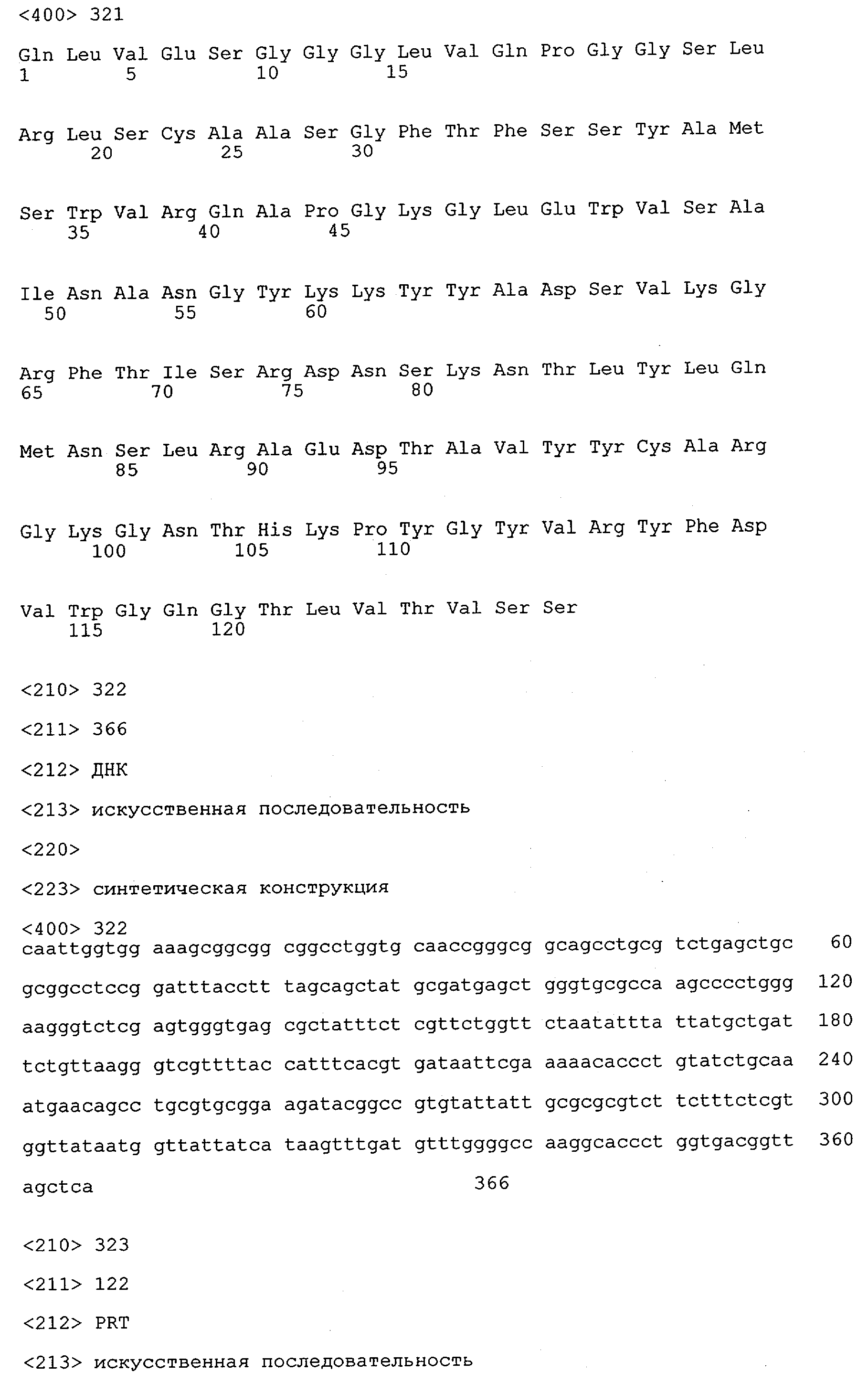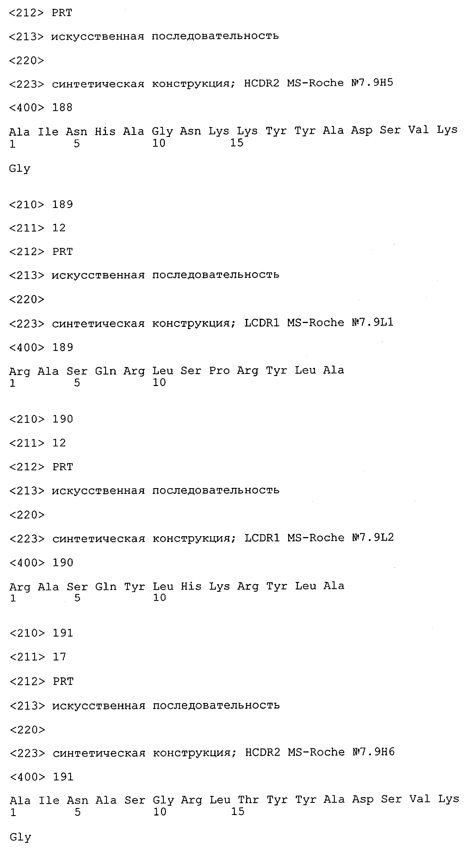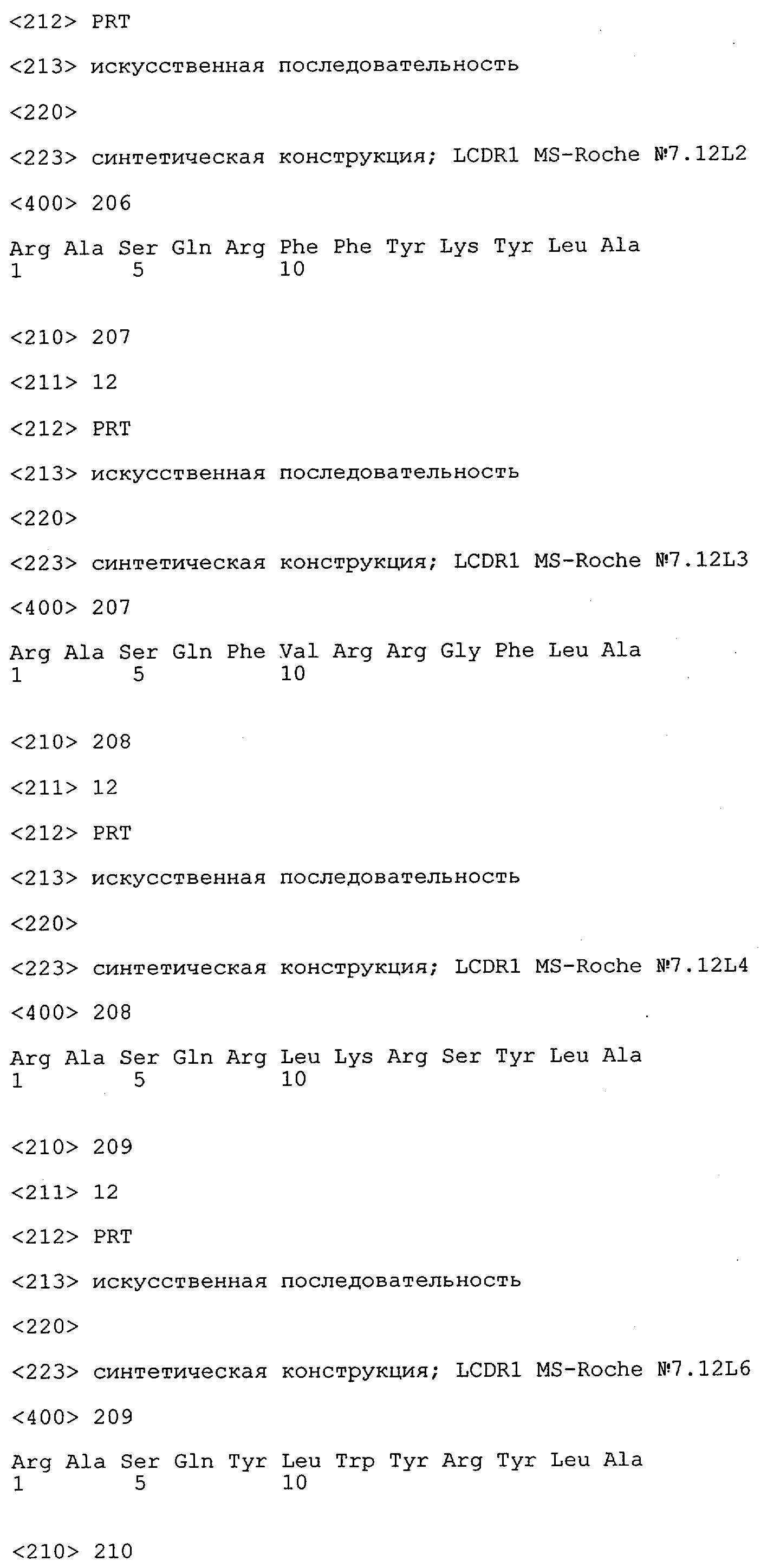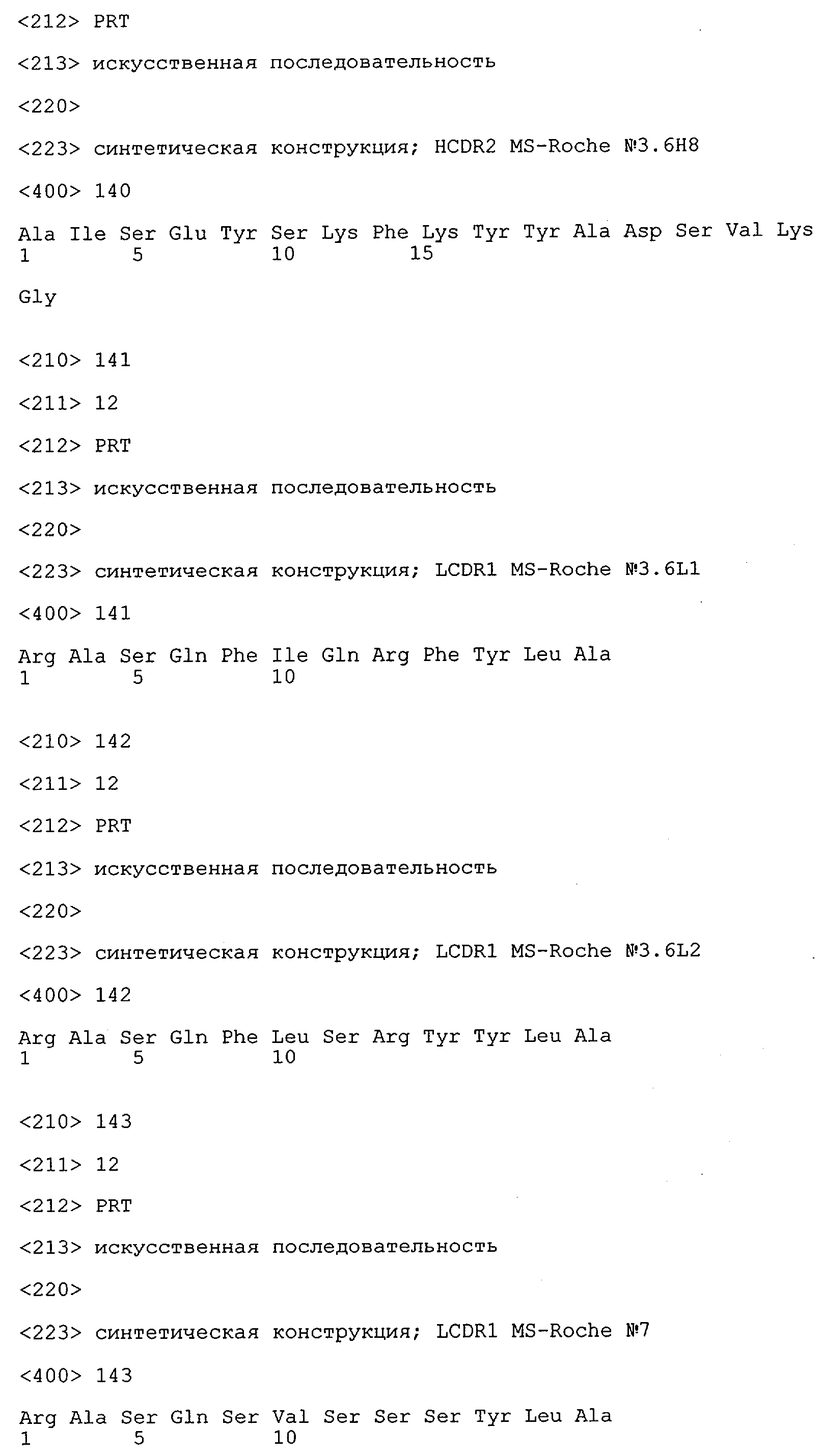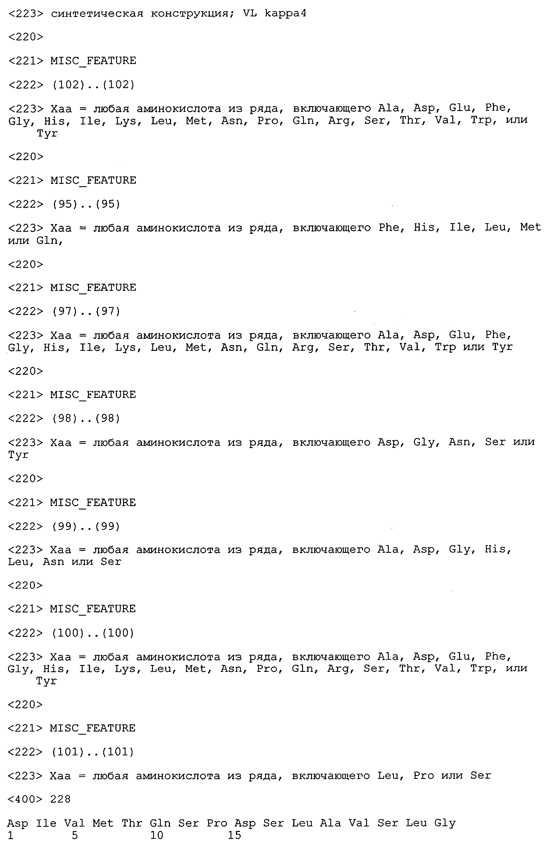 Понятие может относиться также к конформационному эпитопу, структурному эпитопу или к прерывистому эпитопу, состоящему из указанных двух областей или их фрагментов; см. также у Geysen (1986), loc. cit. В контексте настоящего описания конформационный эпитоп определен двумя или большим количеством дискретных аминокислотных последовательностей, разделенных на первичной последовательности, которые появляются вместе на поверхности, когда происходит укладка полипептида с образованием нативного протеина (Sela, Science 166, 1996, с.1365 и Laver, Cell 61, 1990, сс.553-556). Молекулы антител, предлагаемые в настоящем изобретении, вероятно, специфически связываются/взаимодействуют с конформационным(ыми)/структурным(и) эпитопом(ами), который(е) состоят из и/или содержат две описанные выше области -А4 или их фрагменты, что будет подробнее описано ниже. Считается, что «молекулы антител», предлагаемые в настоящем изобретении, обладают одновременно и независимо двойной специфичностью по отношению к (а) аминокислотному участку, содержащему аминокислоты 2-10 (или его фрагменту(ам)) пептида -А4, и (б) аминокислотному участку, содержащему аминокислоты 12-25 (или его фрагменту(ам)) пептида -А4 (SEQ ID NO.27). Фрагменты или части этих участков содержат по меньшей мере две, более предпочтительно по меньшей мере три аминокислоты. Предпочтительные фрагменты или части расположены в первой области/участке SEQ ID NO:27 и имеют аминокислотные последовательности AEFRHD, EF, EFR, FR, EFRHDSG, EFRHD или HDSG и во второй области/участке SEQ ID NO:27 и имеют аминокислотные последовательности HHQKL, LV, LVFFAE, VFFAED VFFA или FFAEDV. Как отмечалось выше, эти фрагменты могут содержать также дополнительные аминокислоты или могут представлять собой части указанных выше фрагментов. Их конкретными примерами являются DAE, DAEF, FRH или RHDSG.