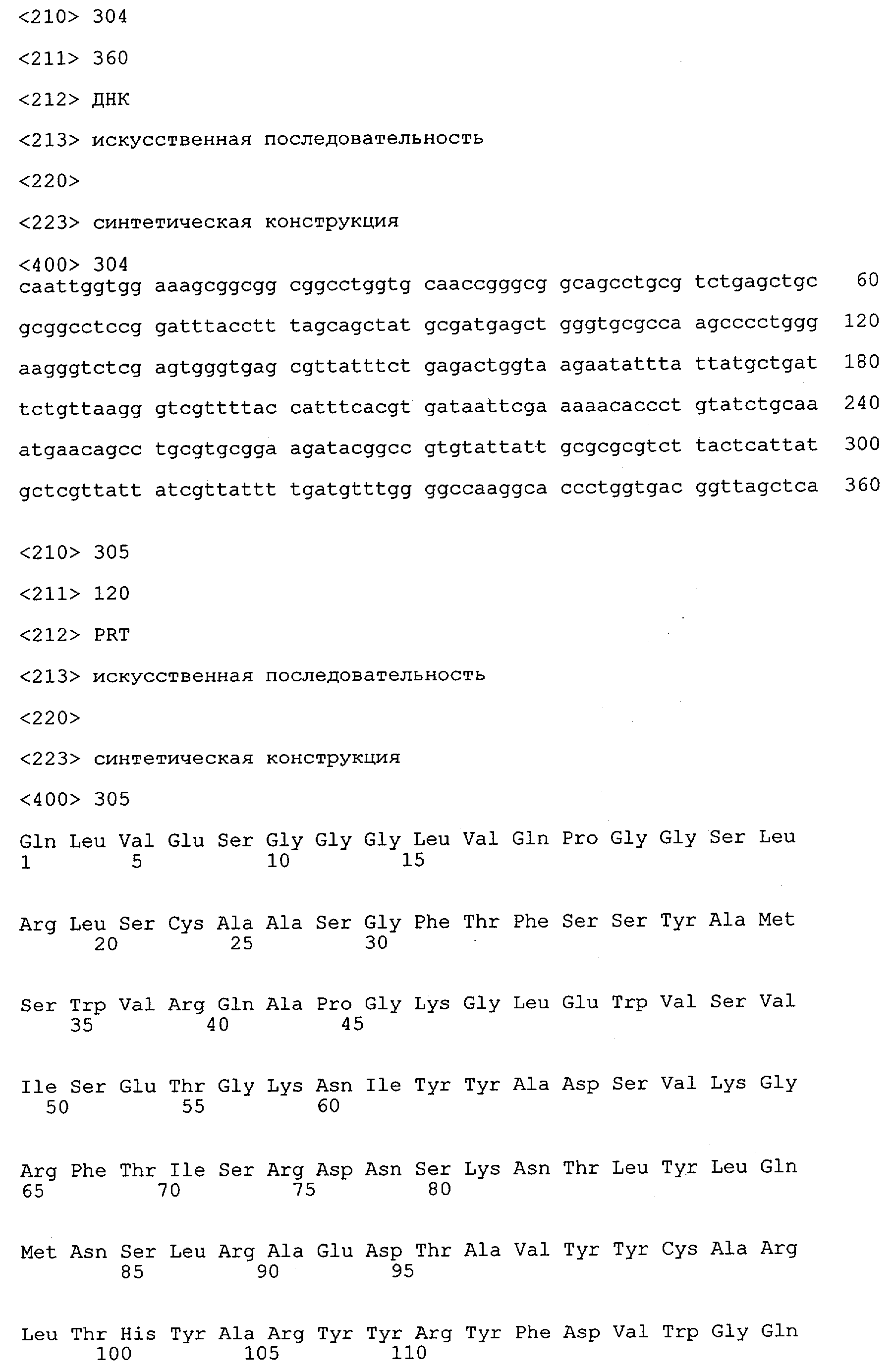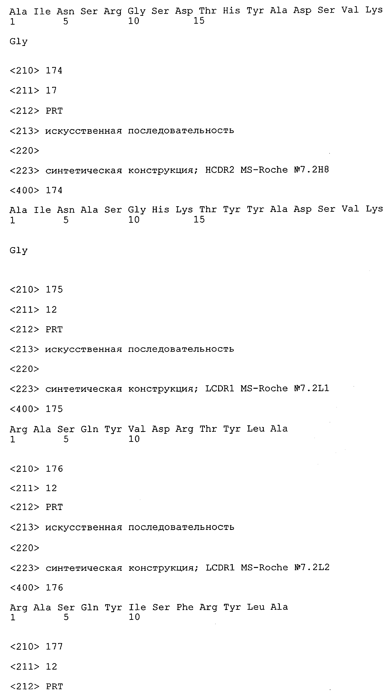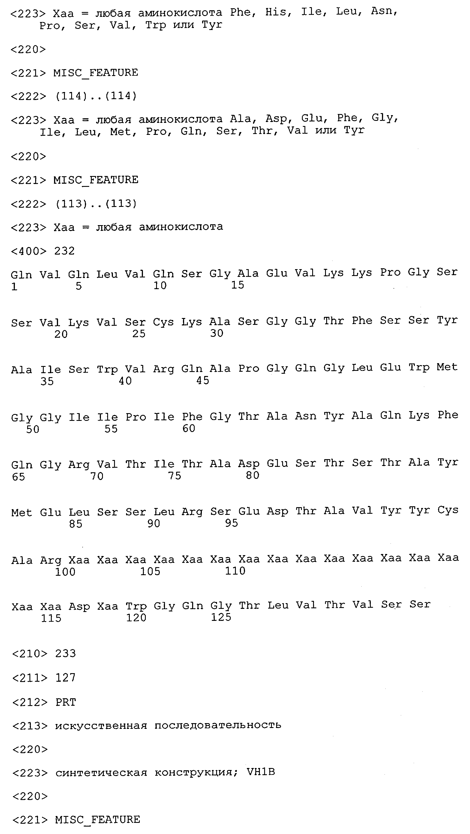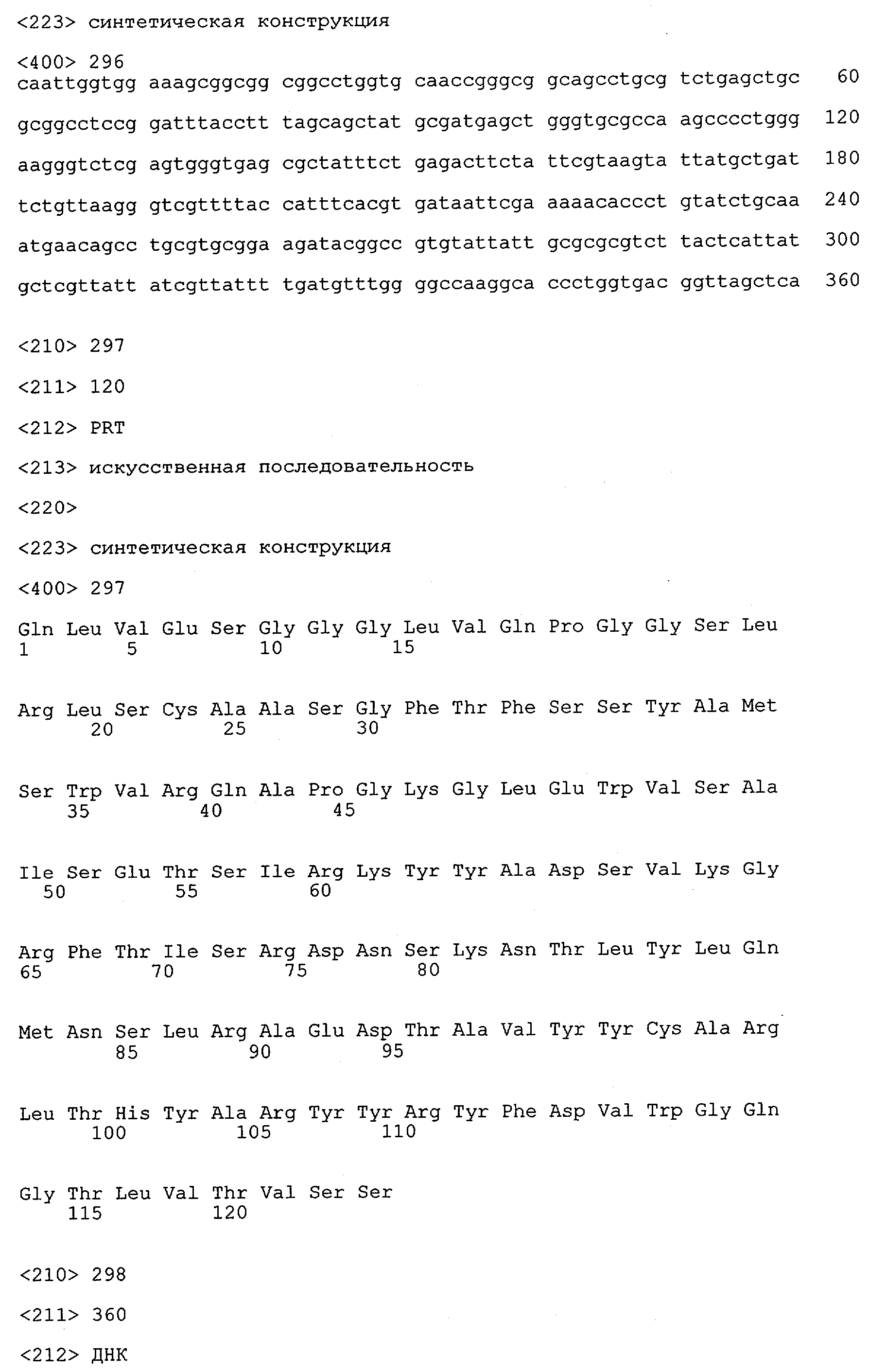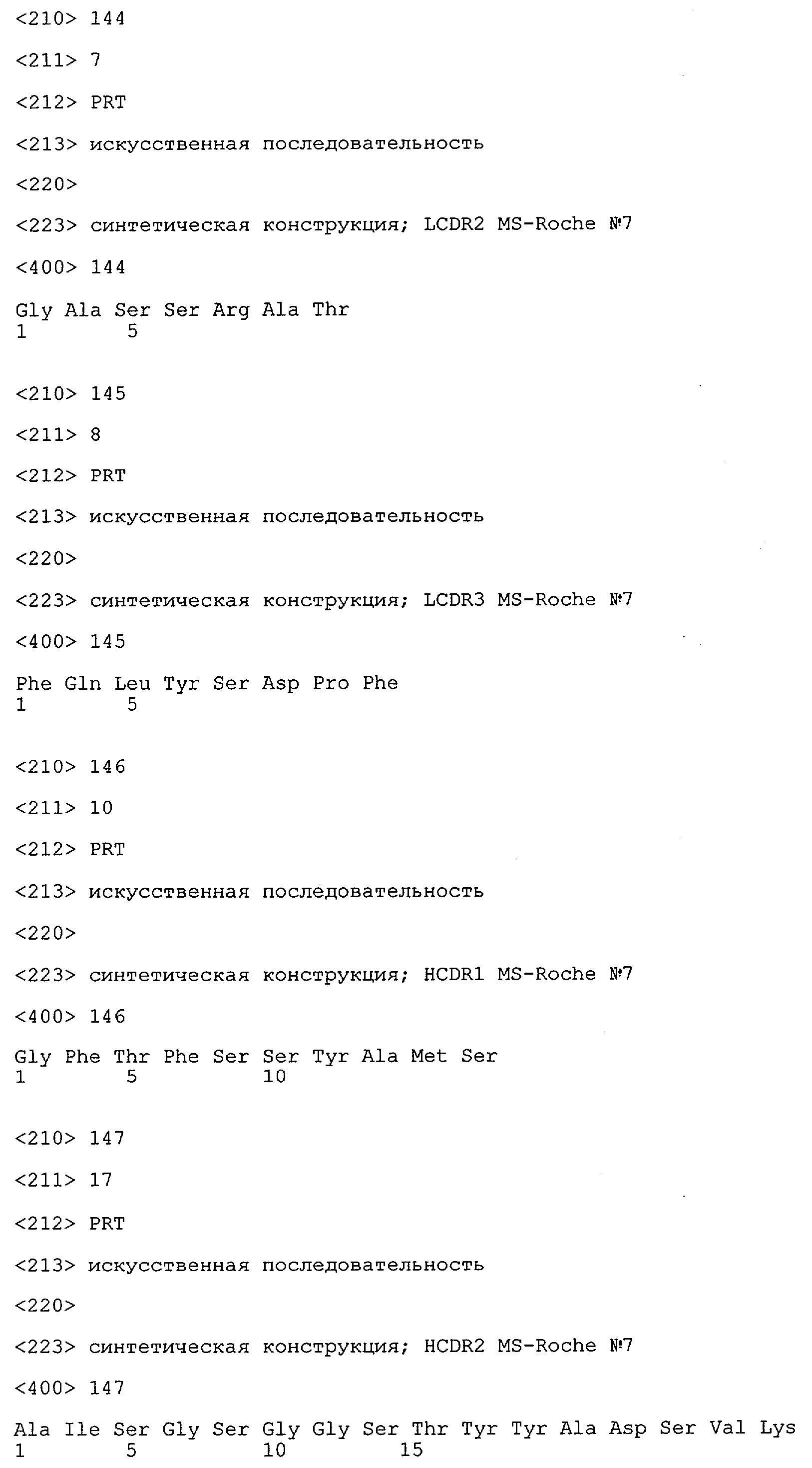 Понятие может относиться также к конформационному эпитопу, структурному эпитопу или к прерывистому эпитопу, состоящему из указанных двух областей или их фрагментов; см. также у Geysen (1986), loc. cit. В контексте настоящего описания конформационный эпитоп определен двумя или большим количеством дискретных аминокислотных последовательностей, разделенных на первичной последовательности, которые появляются вместе на поверхности, когда происходит укладка полипептида с образованием нативного протеина (Sela, Science 166, 1996, с.1365 и Laver, Cell 61, 1990, сс.553-556). Молекулы антител, предлагаемые в настоящем изобретении, вероятно, специфически связываются/взаимодействуют с конформационным(ыми)/структурным(и) эпитопом(ами), который(е) состоят из и/или содержат две описанные выше области -А4 или их фрагменты, что будет подробнее описано ниже. Считается, что «молекулы антител», предлагаемые в настоящем изобретении, обладают одновременно и независимо двойной специфичностью по отношению к (а) аминокислотному участку, содержащему аминокислоты 2-10 (или его фрагменту(ам)) пептида -А4, и (б) аминокислотному участку, содержащему аминокислоты 12-25 (или его фрагменту(ам)) пептида -А4 (SEQ ID NO.27). Фрагменты или части этих участков содержат по меньшей мере две, более предпочтительно по меньшей мере три аминокислоты. Предпочтительные фрагменты или части расположены в первой области/участке SEQ ID NO:27 и имеют аминокислотные последовательности AEFRHD, EF, EFR, FR, EFRHDSG, EFRHD или HDSG и во второй области/участке SEQ ID NO:27 и имеют аминокислотные последовательности HHQKL, LV, LVFFAE, VFFAED VFFA или FFAEDV. Как отмечалось выше, эти фрагменты могут содержать также дополнительные аминокислоты или могут представлять собой части указанных выше фрагментов. Их конкретными примерами являются DAE, DAEF, FRH или RHDSG.