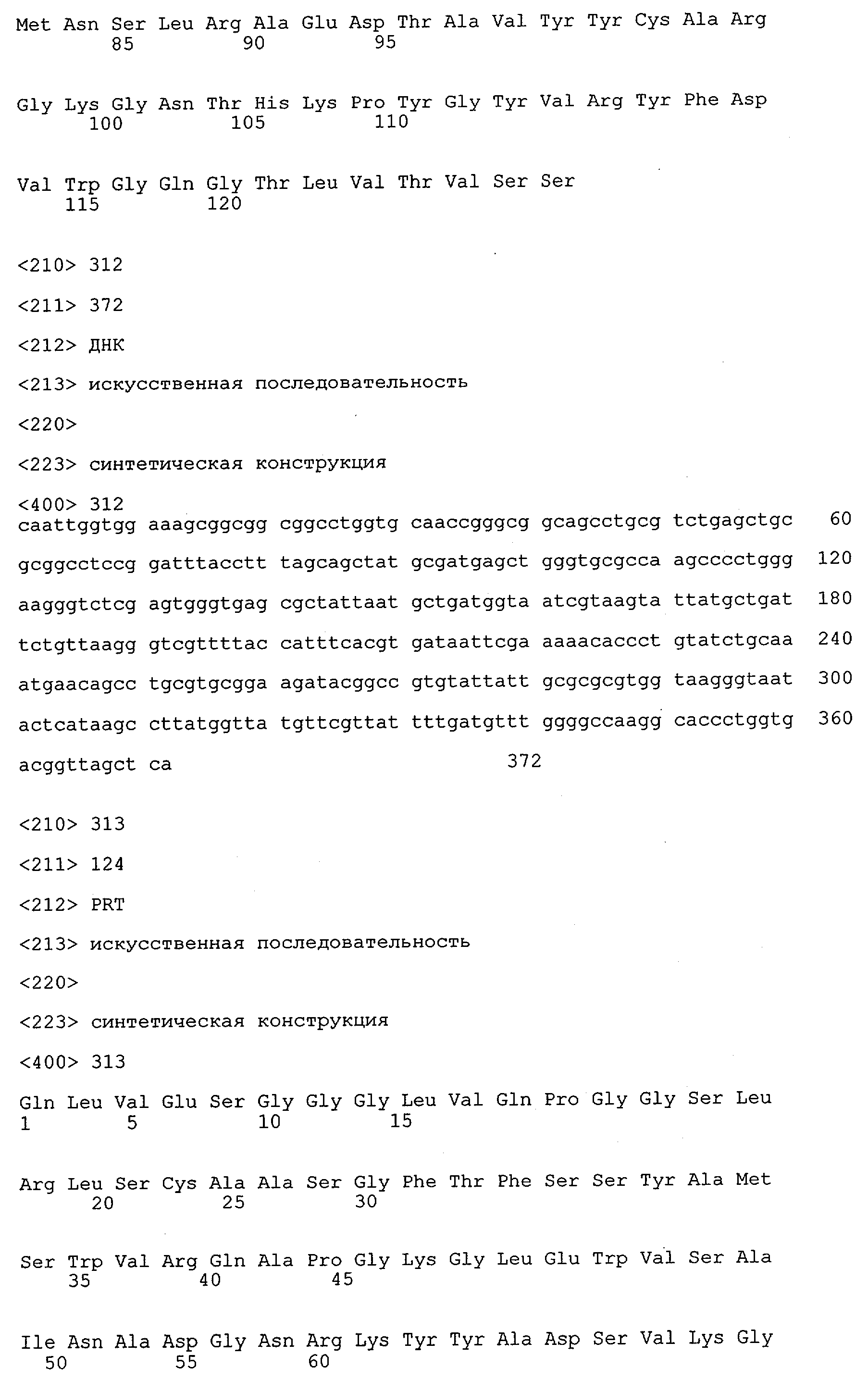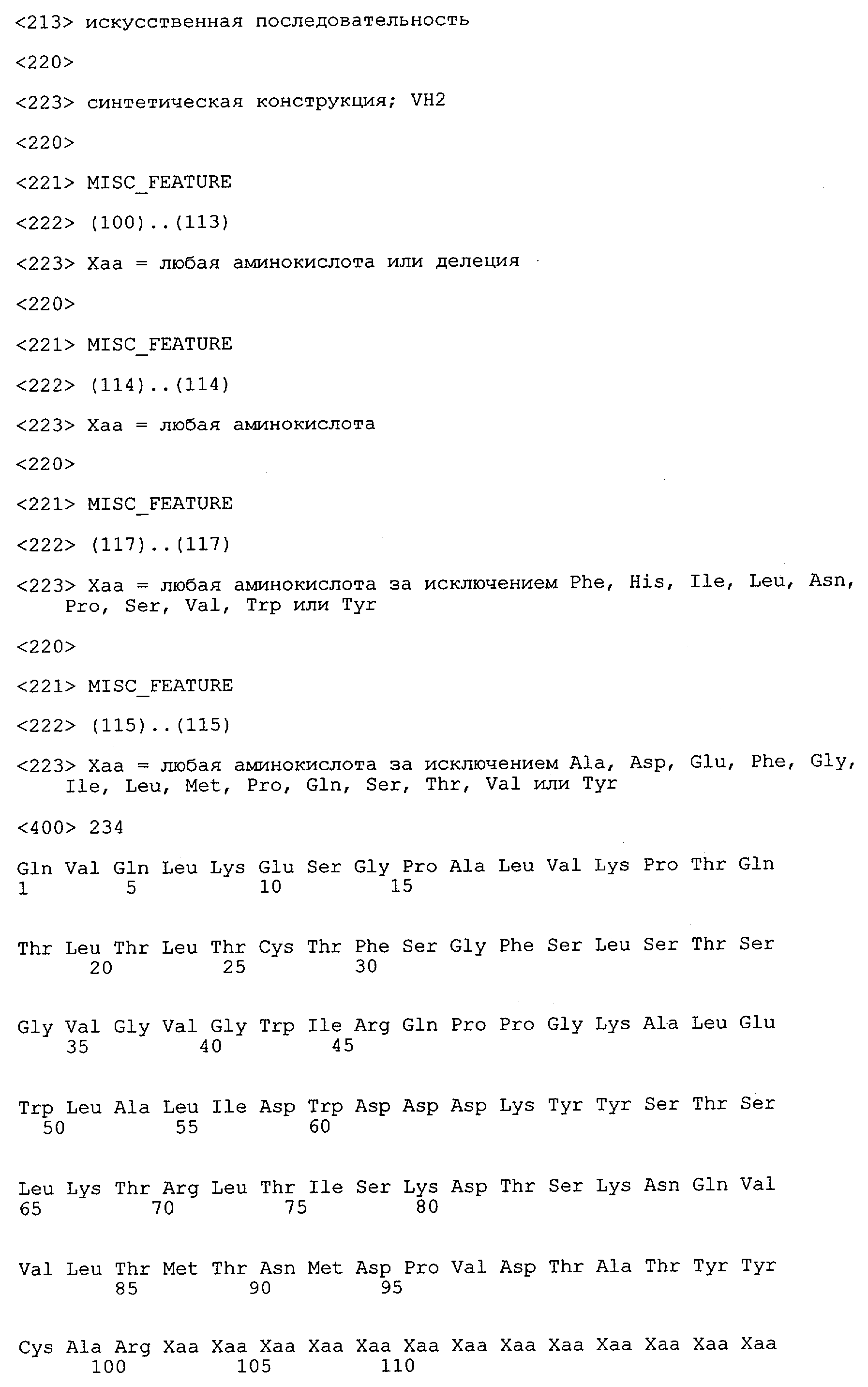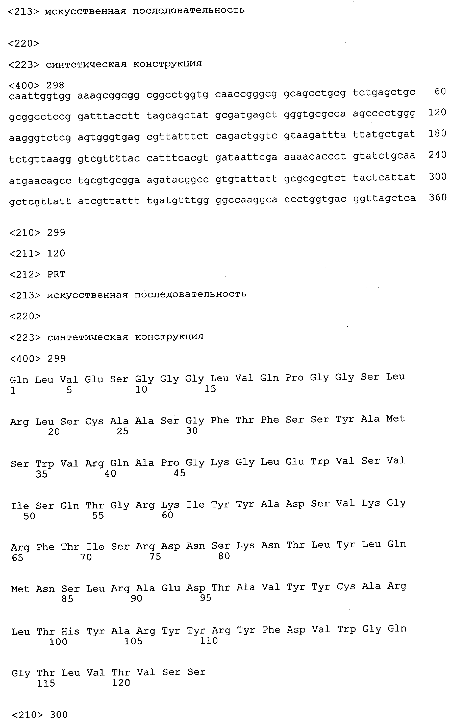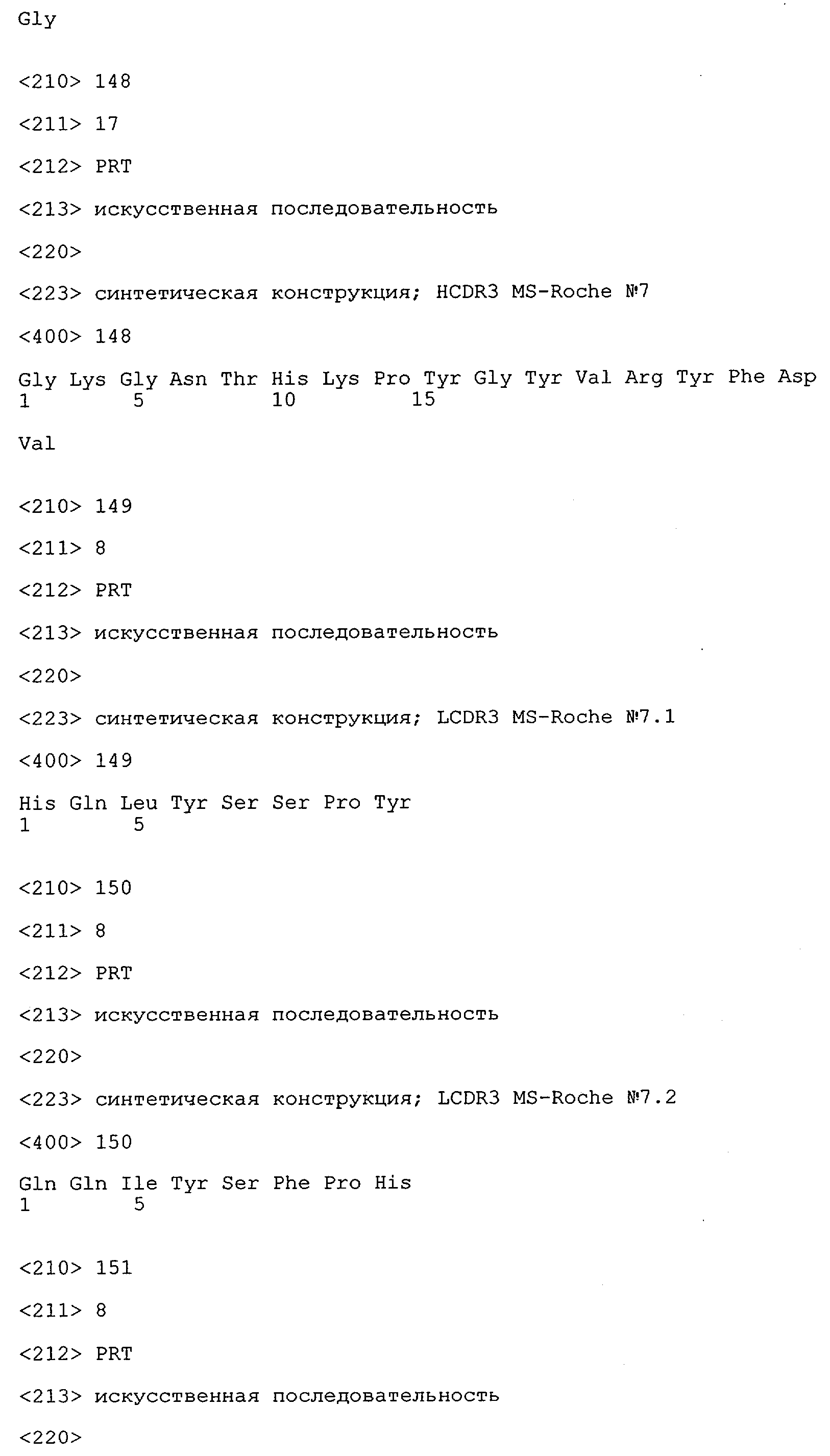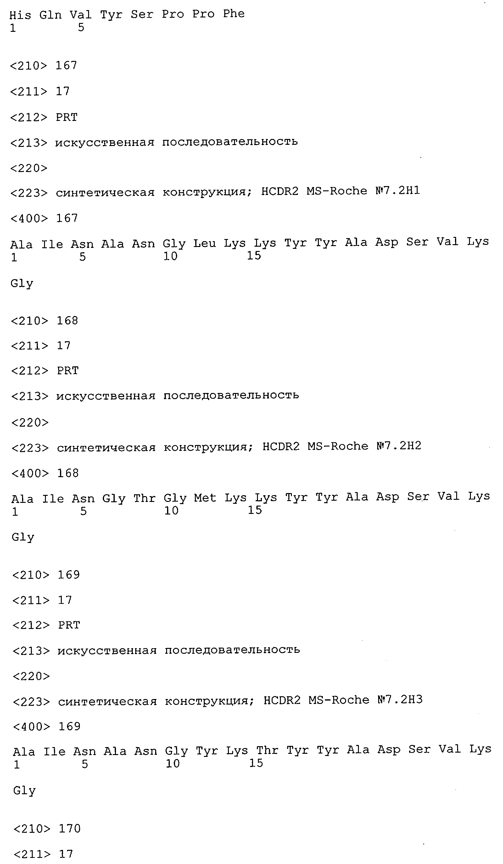 Понятие может относиться также к конформационному эпитопу, структурному эпитопу или к прерывистому эпитопу, состоящему из указанных двух областей или их фрагментов; см. также у Geysen (1986), loc. cit. В контексте настоящего описания конформационный эпитоп определен двумя или большим количеством дискретных аминокислотных последовательностей, разделенных на первичной последовательности, которые появляются вместе на поверхности, когда происходит укладка полипептида с образованием нативного протеина (Sela, Science 166, 1996, с.1365 и Laver, Cell 61, 1990, сс.553-556). Молекулы антител, предлагаемые в настоящем изобретении, вероятно, специфически связываются/взаимодействуют с конформационным(ыми)/структурным(и) эпитопом(ами), который(е) состоят из и/или содержат две описанные выше области -А4 или их фрагменты, что будет подробнее описано ниже. Считается, что «молекулы антител», предлагаемые в настоящем изобретении, обладают одновременно и независимо двойной специфичностью по отношению к (а) аминокислотному участку, содержащему аминокислоты 2-10 (или его фрагменту(ам)) пептида -А4, и (б) аминокислотному участку, содержащему аминокислоты 12-25 (или его фрагменту(ам)) пептида -А4 (SEQ ID NO.27). Фрагменты или части этих участков содержат по меньшей мере две, более предпочтительно по меньшей мере три аминокислоты. Предпочтительные фрагменты или части расположены в первой области/участке SEQ ID NO:27 и имеют аминокислотные последовательности AEFRHD, EF, EFR, FR, EFRHDSG, EFRHD или HDSG и во второй области/участке SEQ ID NO:27 и имеют аминокислотные последовательности HHQKL, LV, LVFFAE, VFFAED VFFA или FFAEDV. Как отмечалось выше, эти фрагменты могут содержать также дополнительные аминокислоты или могут представлять собой части указанных выше фрагментов. Их конкретными примерами являются DAE, DAEF, FRH или RHDSG.