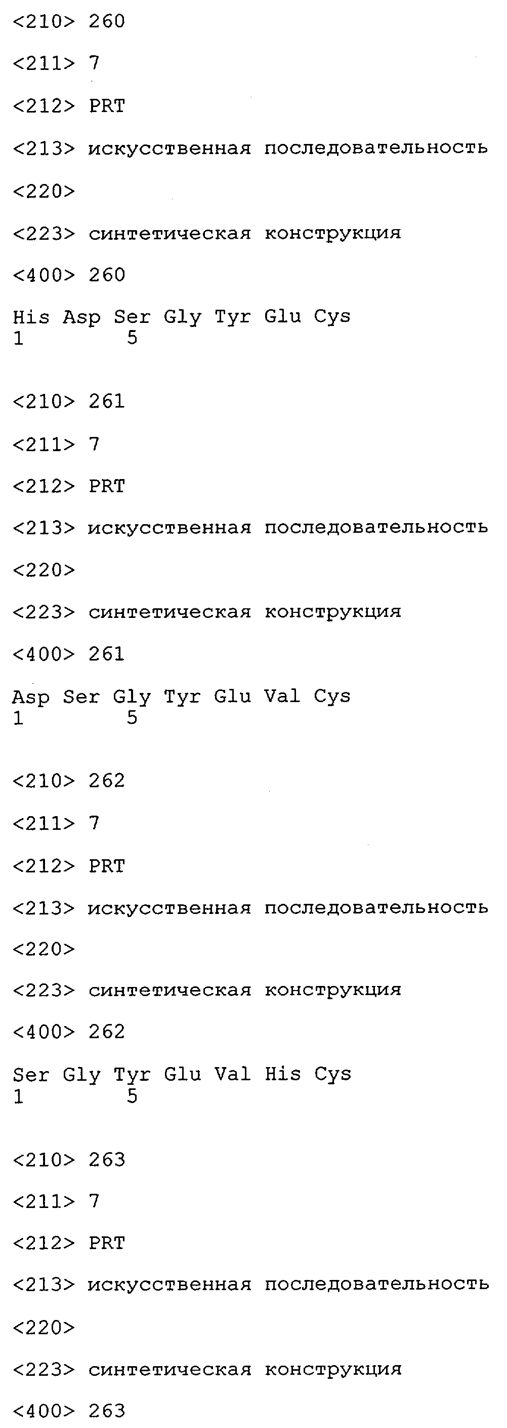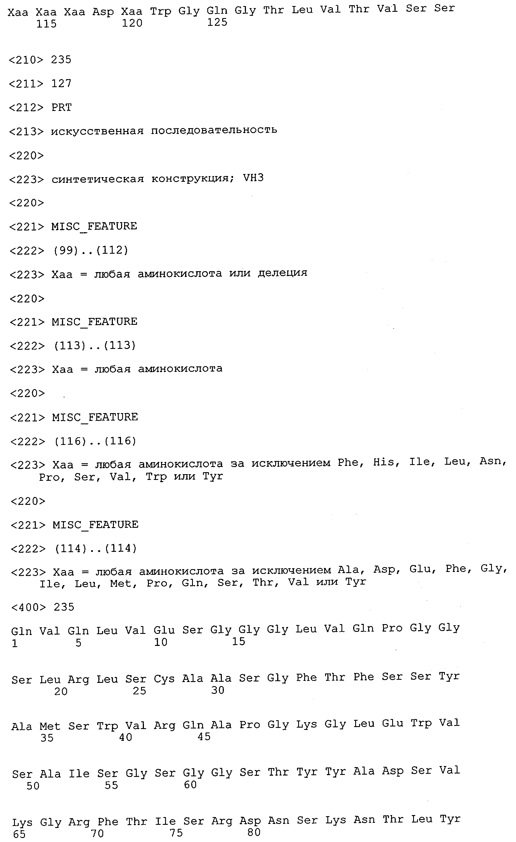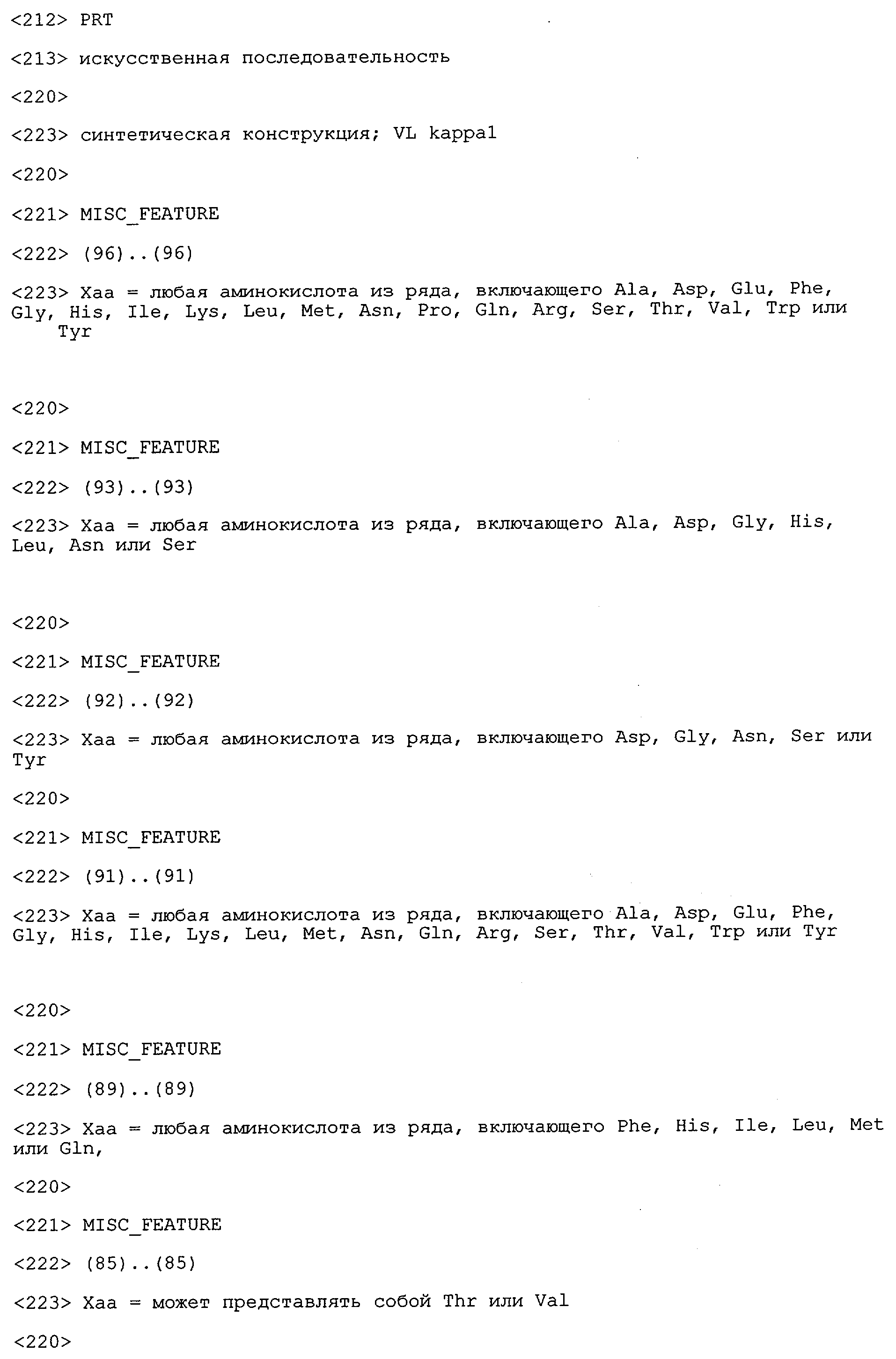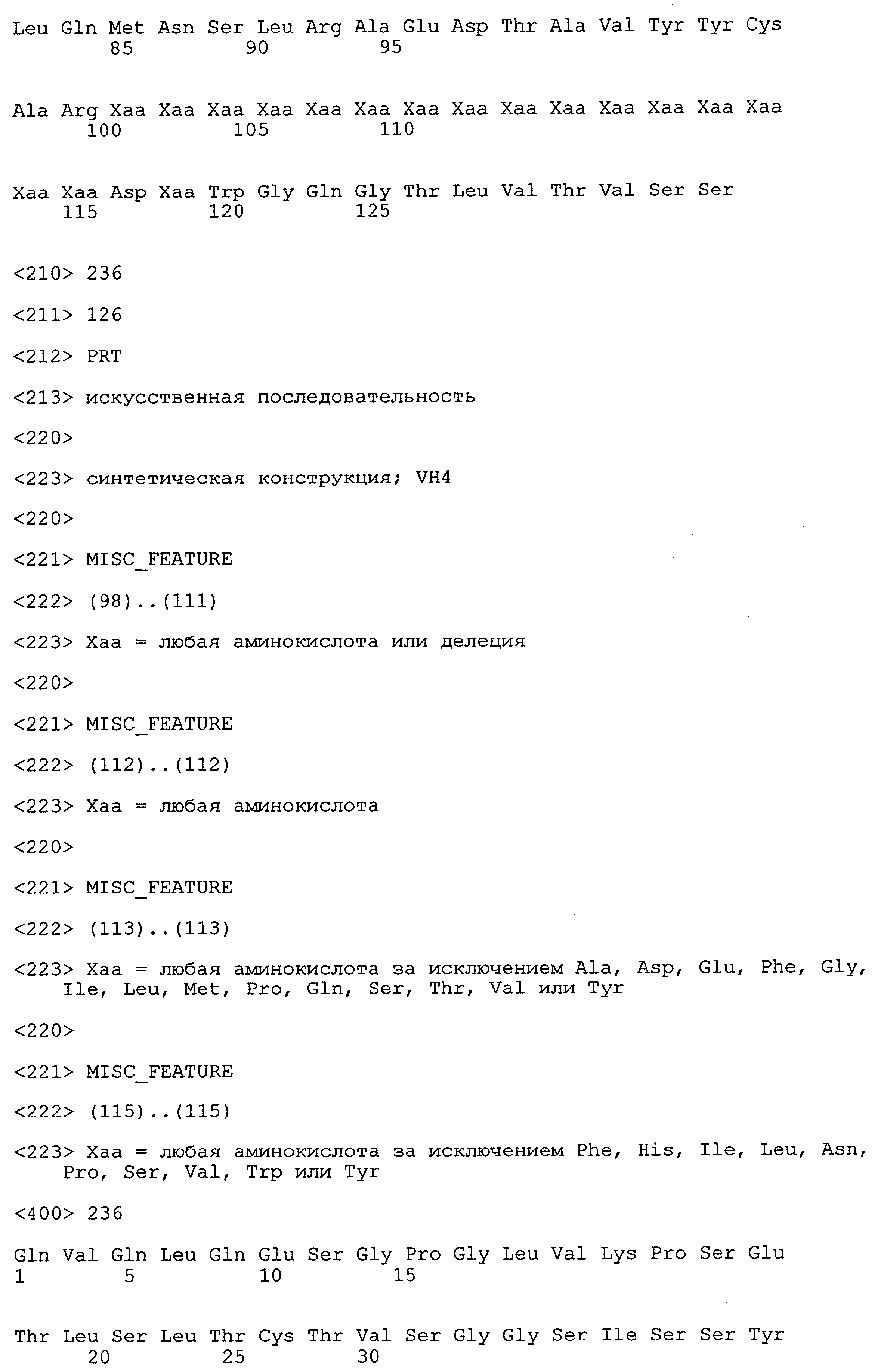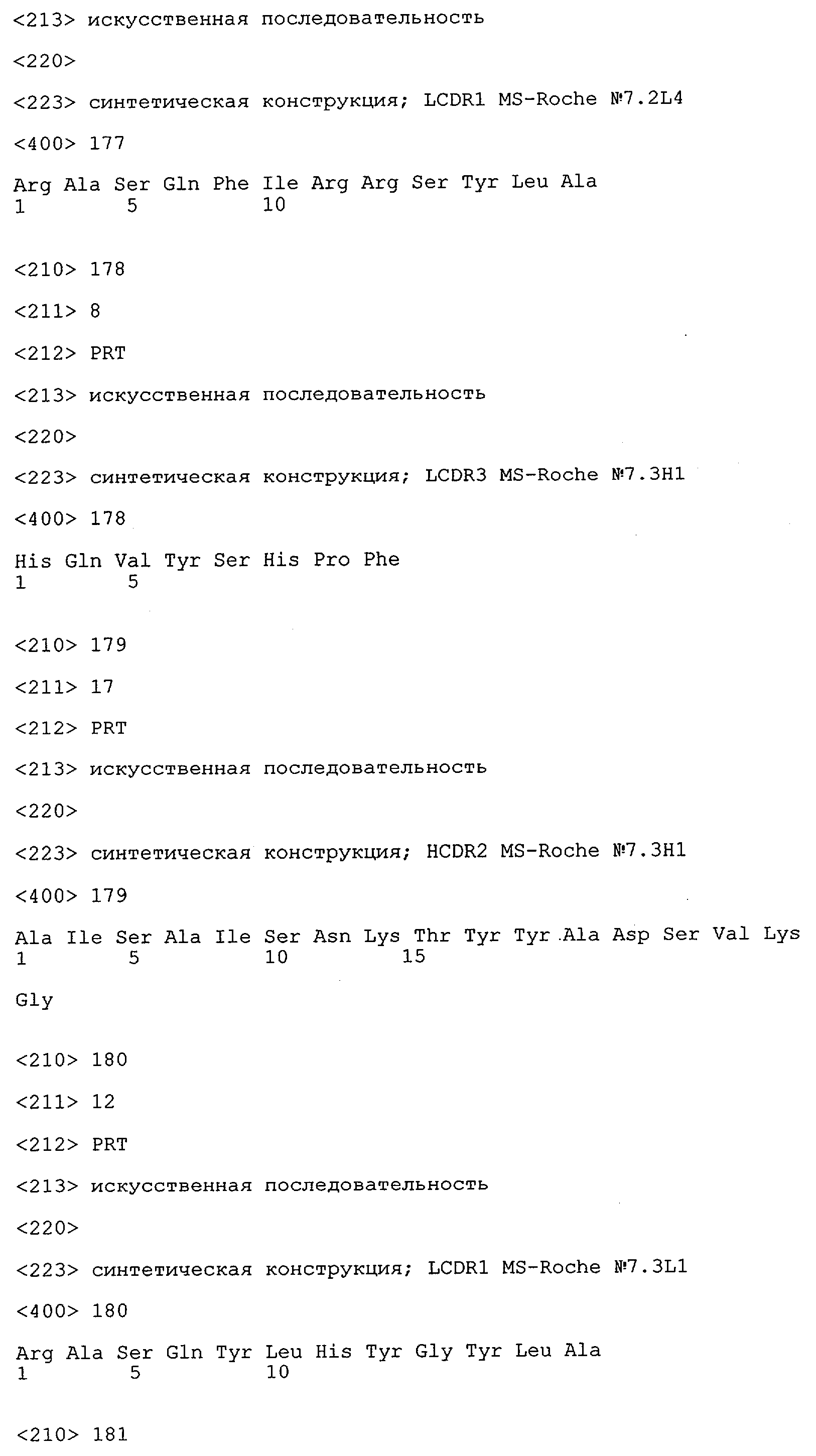 Понятие может относиться также к конформационному эпитопу, структурному эпитопу или к прерывистому эпитопу, состоящему из указанных двух областей или их фрагментов; см. также у Geysen (1986), loc. cit. В контексте настоящего описания конформационный эпитоп определен двумя или большим количеством дискретных аминокислотных последовательностей, разделенных на первичной последовательности, которые появляются вместе на поверхности, когда происходит укладка полипептида с образованием нативного протеина (Sela, Science 166, 1996, с.1365 и Laver, Cell 61, 1990, сс.553-556). Молекулы антител, предлагаемые в настоящем изобретении, вероятно, специфически связываются/взаимодействуют с конформационным(ыми)/структурным(и) эпитопом(ами), который(е) состоят из и/или содержат две описанные выше области -А4 или их фрагменты, что будет подробнее описано ниже. Считается, что «молекулы антител», предлагаемые в настоящем изобретении, обладают одновременно и независимо двойной специфичностью по отношению к (а) аминокислотному участку, содержащему аминокислоты 2-10 (или его фрагменту(ам)) пептида -А4, и (б) аминокислотному участку, содержащему аминокислоты 12-25 (или его фрагменту(ам)) пептида -А4 (SEQ ID NO.27). Фрагменты или части этих участков содержат по меньшей мере две, более предпочтительно по меньшей мере три аминокислоты. Предпочтительные фрагменты или части расположены в первой области/участке SEQ ID NO:27 и имеют аминокислотные последовательности AEFRHD, EF, EFR, FR, EFRHDSG, EFRHD или HDSG и во второй области/участке SEQ ID NO:27 и имеют аминокислотные последовательности HHQKL, LV, LVFFAE, VFFAED VFFA или FFAEDV. Как отмечалось выше, эти фрагменты могут содержать также дополнительные аминокислоты или могут представлять собой части указанных выше фрагментов. Их конкретными примерами являются DAE, DAEF, FRH или RHDSG.