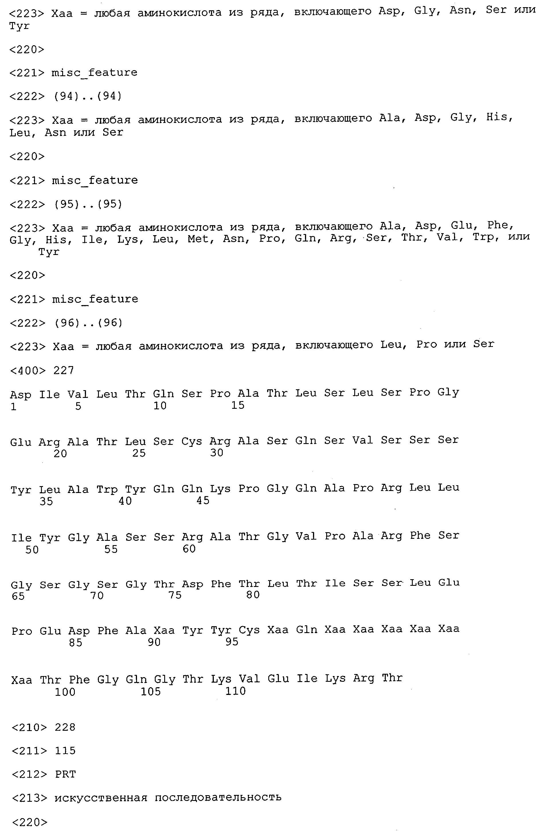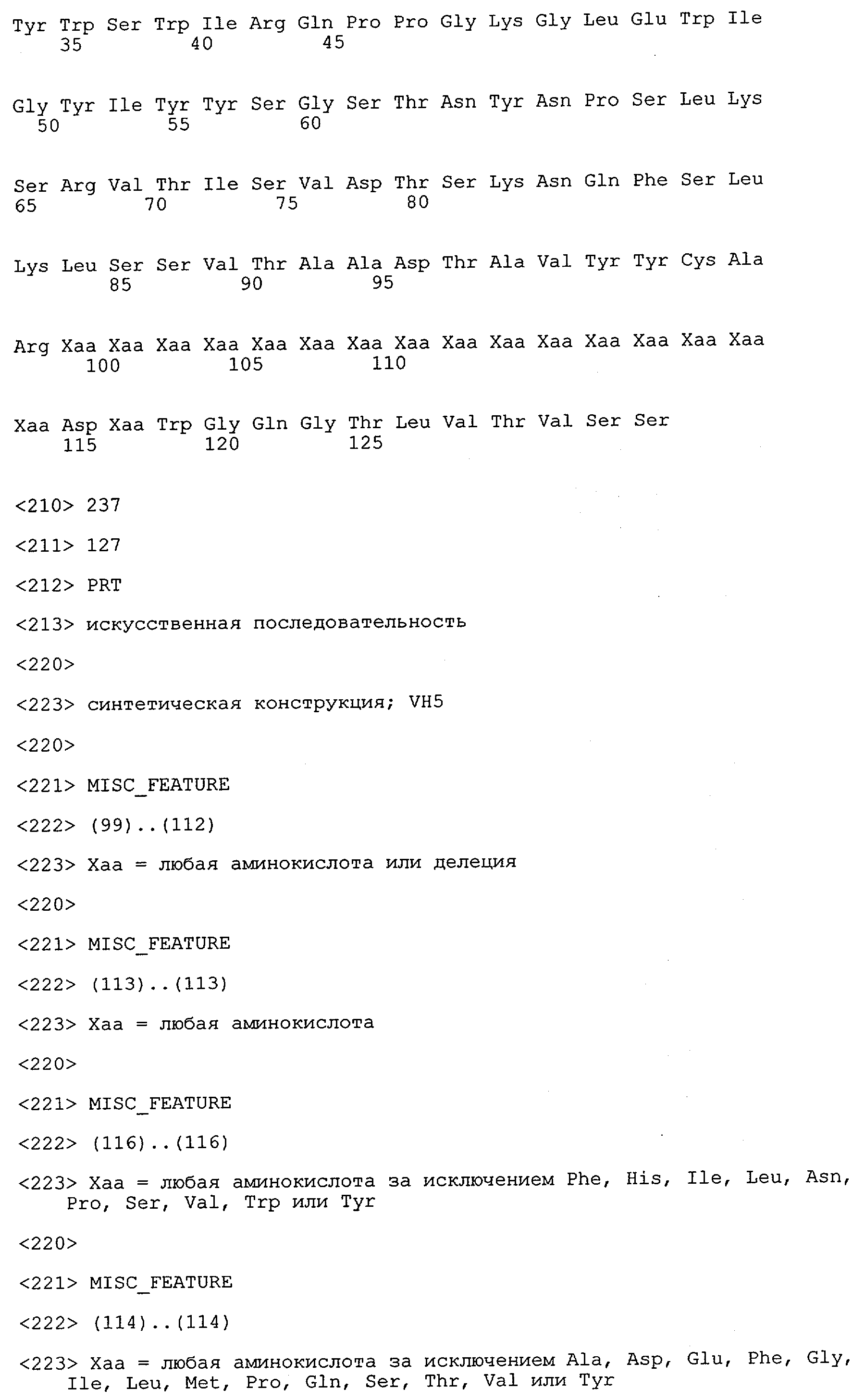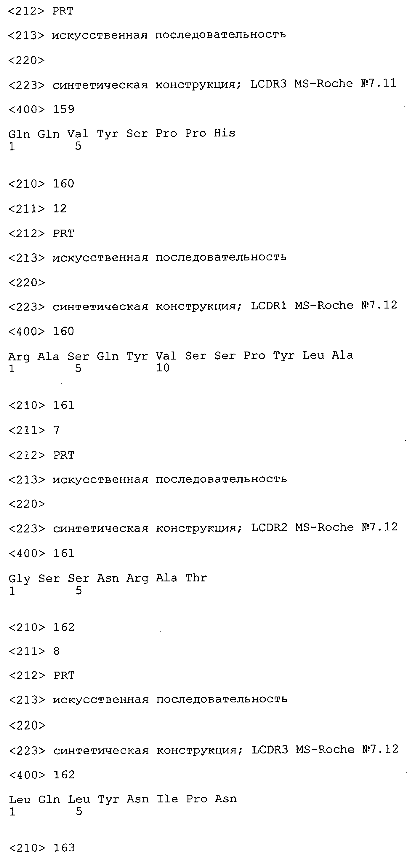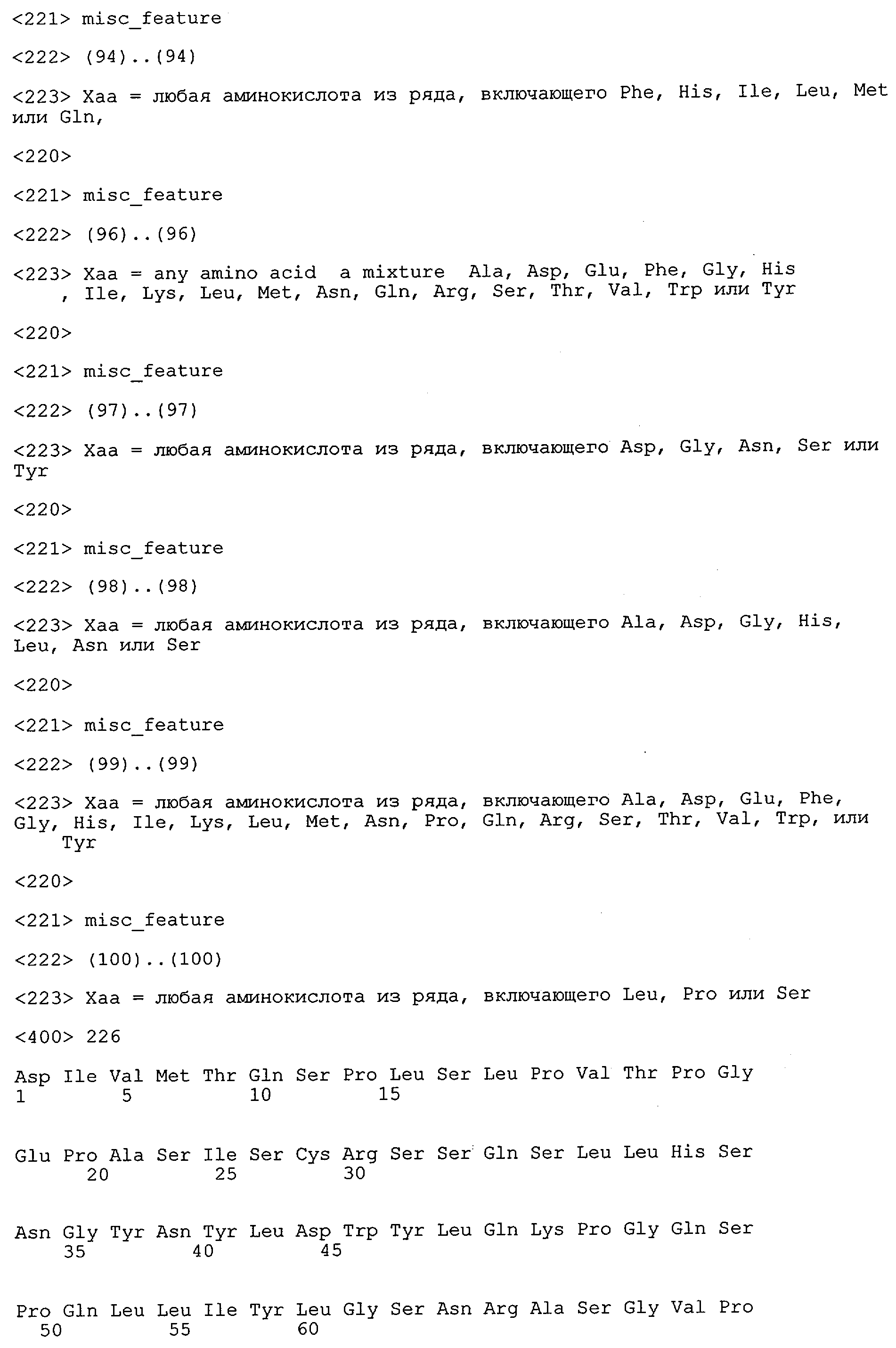 Понятие может относиться также к конформационному эпитопу, структурному эпитопу или к прерывистому эпитопу, состоящему из указанных двух областей или их фрагментов; см. также у Geysen (1986), loc. cit. В контексте настоящего описания конформационный эпитоп определен двумя или большим количеством дискретных аминокислотных последовательностей, разделенных на первичной последовательности, которые появляются вместе на поверхности, когда происходит укладка полипептида с образованием нативного протеина (Sela, Science 166, 1996, с.1365 и Laver, Cell 61, 1990, сс.553-556). Молекулы антител, предлагаемые в настоящем изобретении, вероятно, специфически связываются/взаимодействуют с конформационным(ыми)/структурным(и) эпитопом(ами), который(е) состоят из и/или содержат две описанные выше области -А4 или их фрагменты, что будет подробнее описано ниже. Считается, что «молекулы антител», предлагаемые в настоящем изобретении, обладают одновременно и независимо двойной специфичностью по отношению к (а) аминокислотному участку, содержащему аминокислоты 2-10 (или его фрагменту(ам)) пептида -А4, и (б) аминокислотному участку, содержащему аминокислоты 12-25 (или его фрагменту(ам)) пептида -А4 (SEQ ID NO.27). Фрагменты или части этих участков содержат по меньшей мере две, более предпочтительно по меньшей мере три аминокислоты. Предпочтительные фрагменты или части расположены в первой области/участке SEQ ID NO:27 и имеют аминокислотные последовательности AEFRHD, EF, EFR, FR, EFRHDSG, EFRHD или HDSG и во второй области/участке SEQ ID NO:27 и имеют аминокислотные последовательности HHQKL, LV, LVFFAE, VFFAED VFFA или FFAEDV. Как отмечалось выше, эти фрагменты могут содержать также дополнительные аминокислоты или могут представлять собой части указанных выше фрагментов. Их конкретными примерами являются DAE, DAEF, FRH или RHDSG.