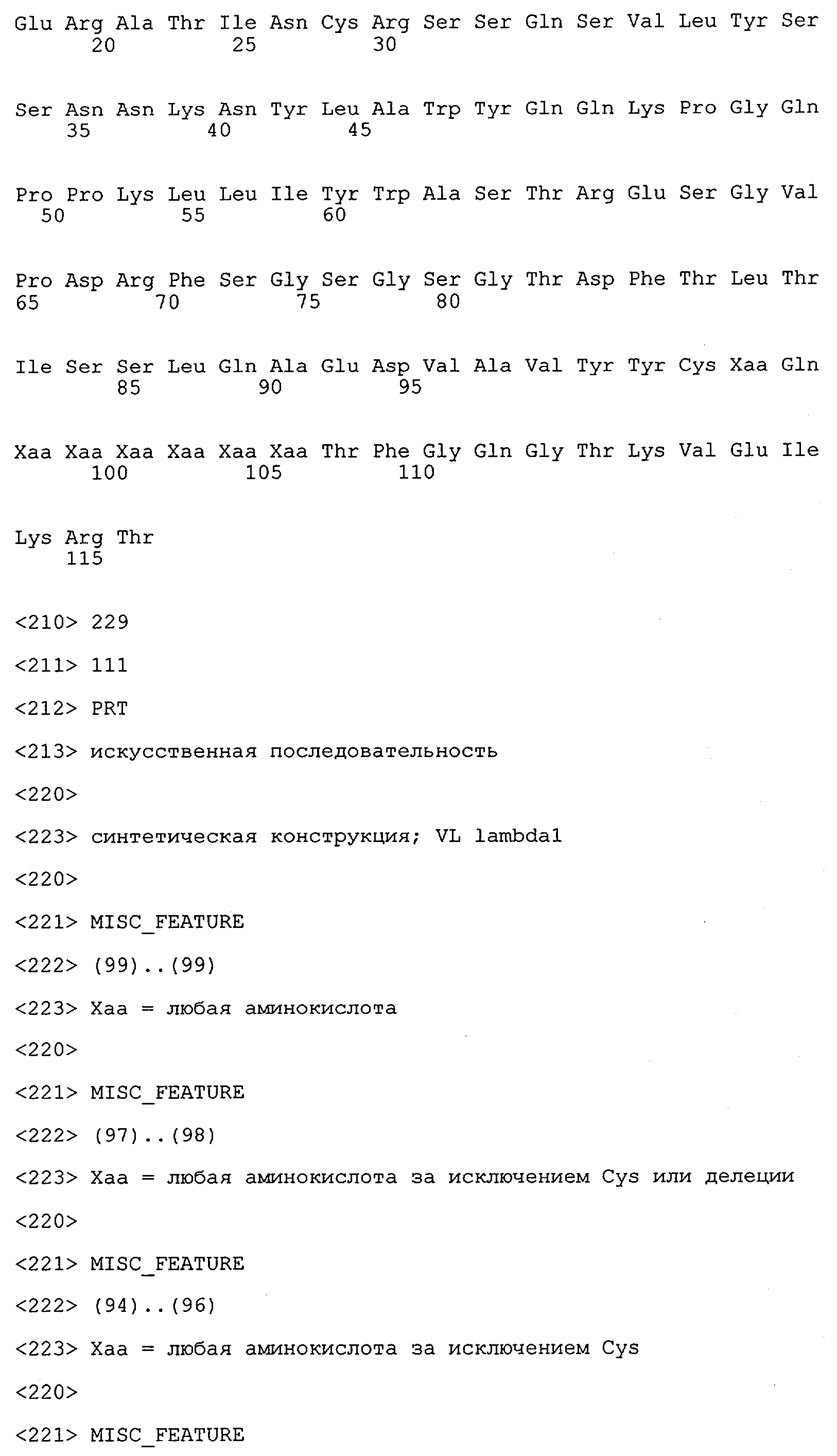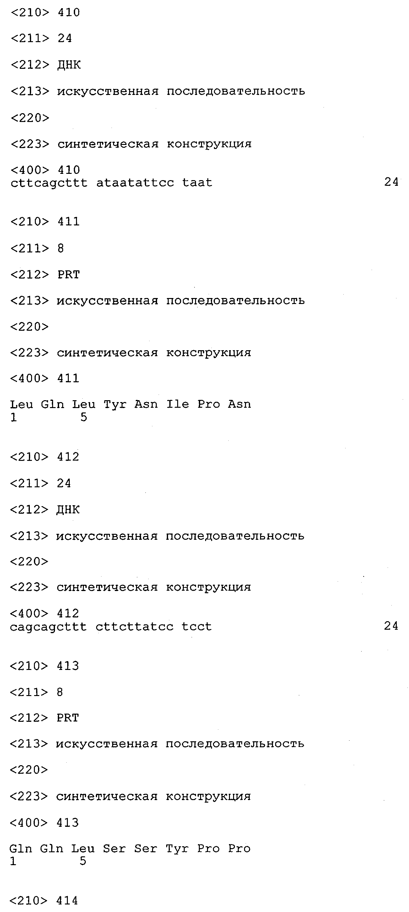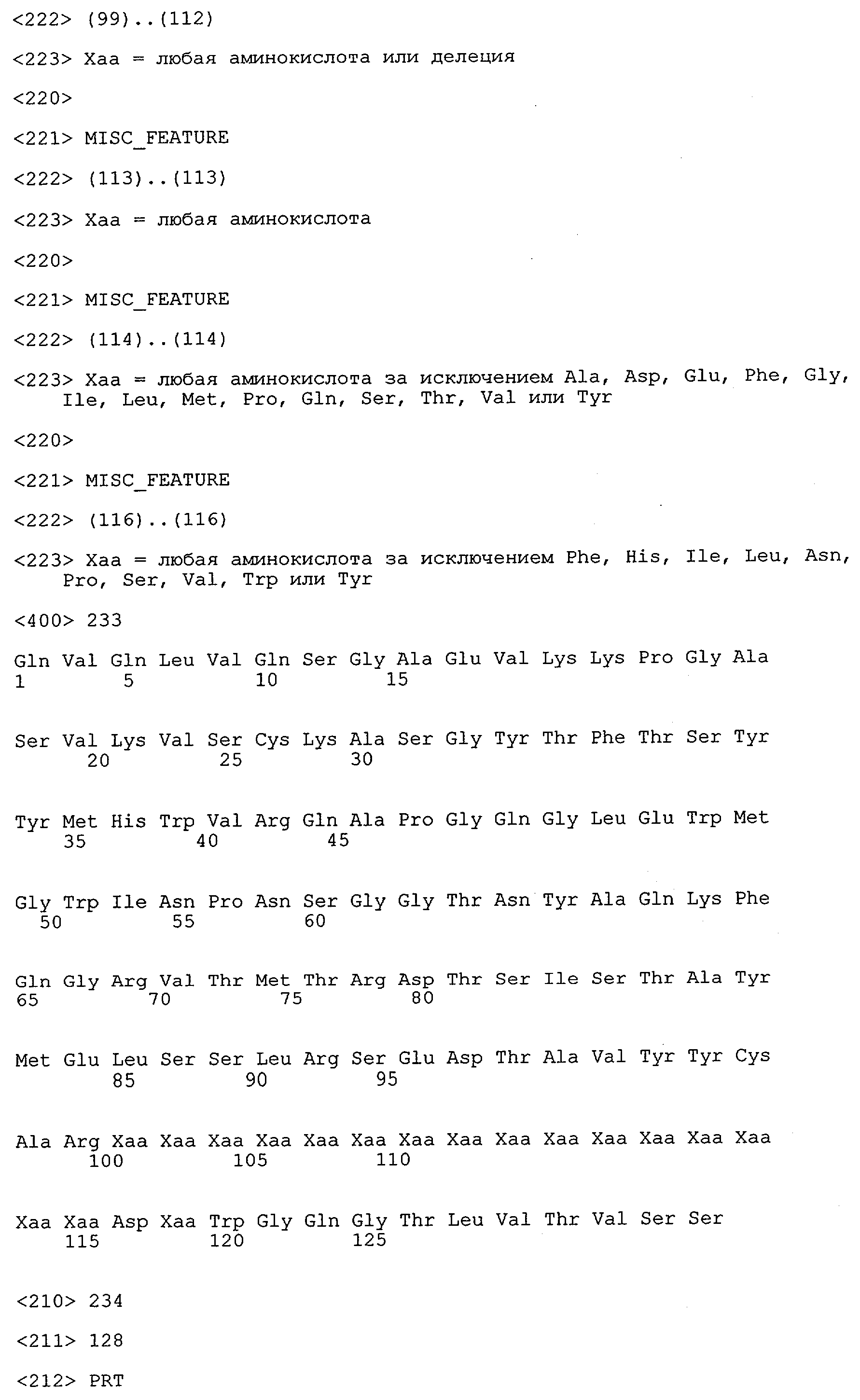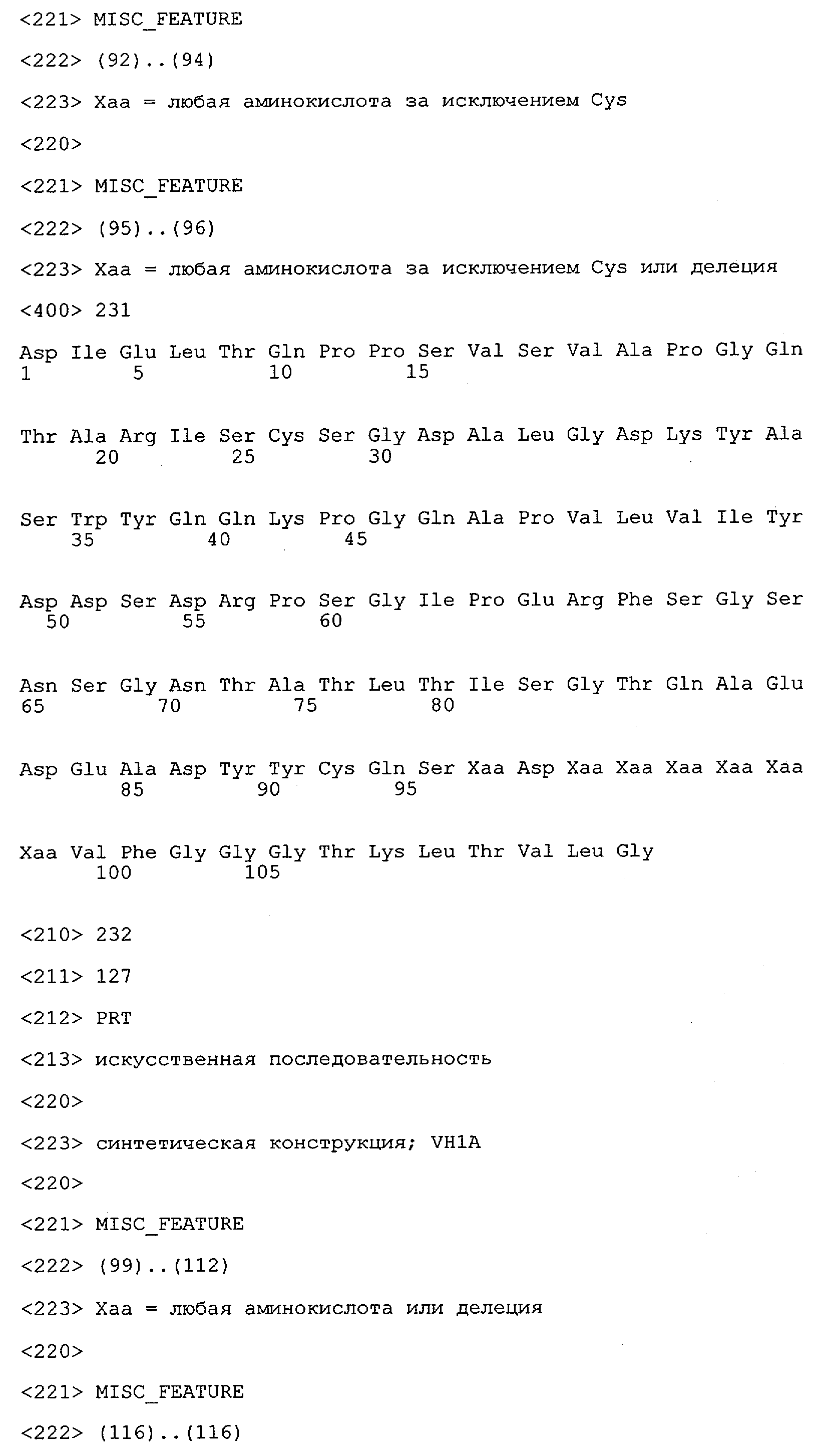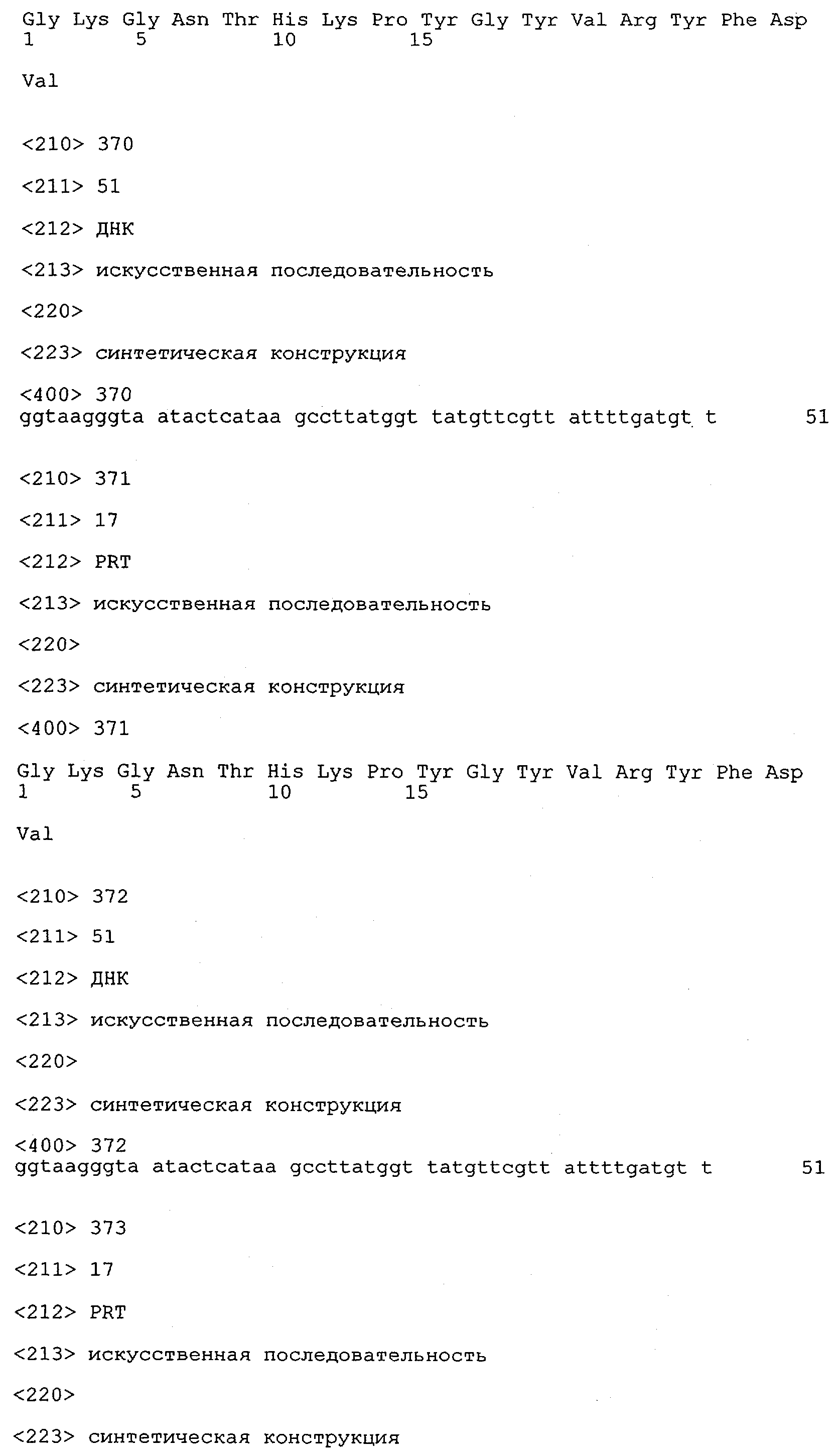 Понятие может относиться также к конформационному эпитопу, структурному эпитопу или к прерывистому эпитопу, состоящему из указанных двух областей или их фрагментов; см. также у Geysen (1986), loc. cit. В контексте настоящего описания конформационный эпитоп определен двумя или большим количеством дискретных аминокислотных последовательностей, разделенных на первичной последовательности, которые появляются вместе на поверхности, когда происходит укладка полипептида с образованием нативного протеина (Sela, Science 166, 1996, с.1365 и Laver, Cell 61, 1990, сс.553-556). Молекулы антител, предлагаемые в настоящем изобретении, вероятно, специфически связываются/взаимодействуют с конформационным(ыми)/структурным(и) эпитопом(ами), который(е) состоят из и/или содержат две описанные выше области -А4 или их фрагменты, что будет подробнее описано ниже. Считается, что «молекулы антител», предлагаемые в настоящем изобретении, обладают одновременно и независимо двойной специфичностью по отношению к (а) аминокислотному участку, содержащему аминокислоты 2-10 (или его фрагменту(ам)) пептида -А4, и (б) аминокислотному участку, содержащему аминокислоты 12-25 (или его фрагменту(ам)) пептида -А4 (SEQ ID NO.27). Фрагменты или части этих участков содержат по меньшей мере две, более предпочтительно по меньшей мере три аминокислоты. Предпочтительные фрагменты или части расположены в первой области/участке SEQ ID NO:27 и имеют аминокислотные последовательности AEFRHD, EF, EFR, FR, EFRHDSG, EFRHD или HDSG и во второй области/участке SEQ ID NO:27 и имеют аминокислотные последовательности HHQKL, LV, LVFFAE, VFFAED VFFA или FFAEDV. Как отмечалось выше, эти фрагменты могут содержать также дополнительные аминокислоты или могут представлять собой части указанных выше фрагментов. Их конкретными примерами являются DAE, DAEF, FRH или RHDSG.