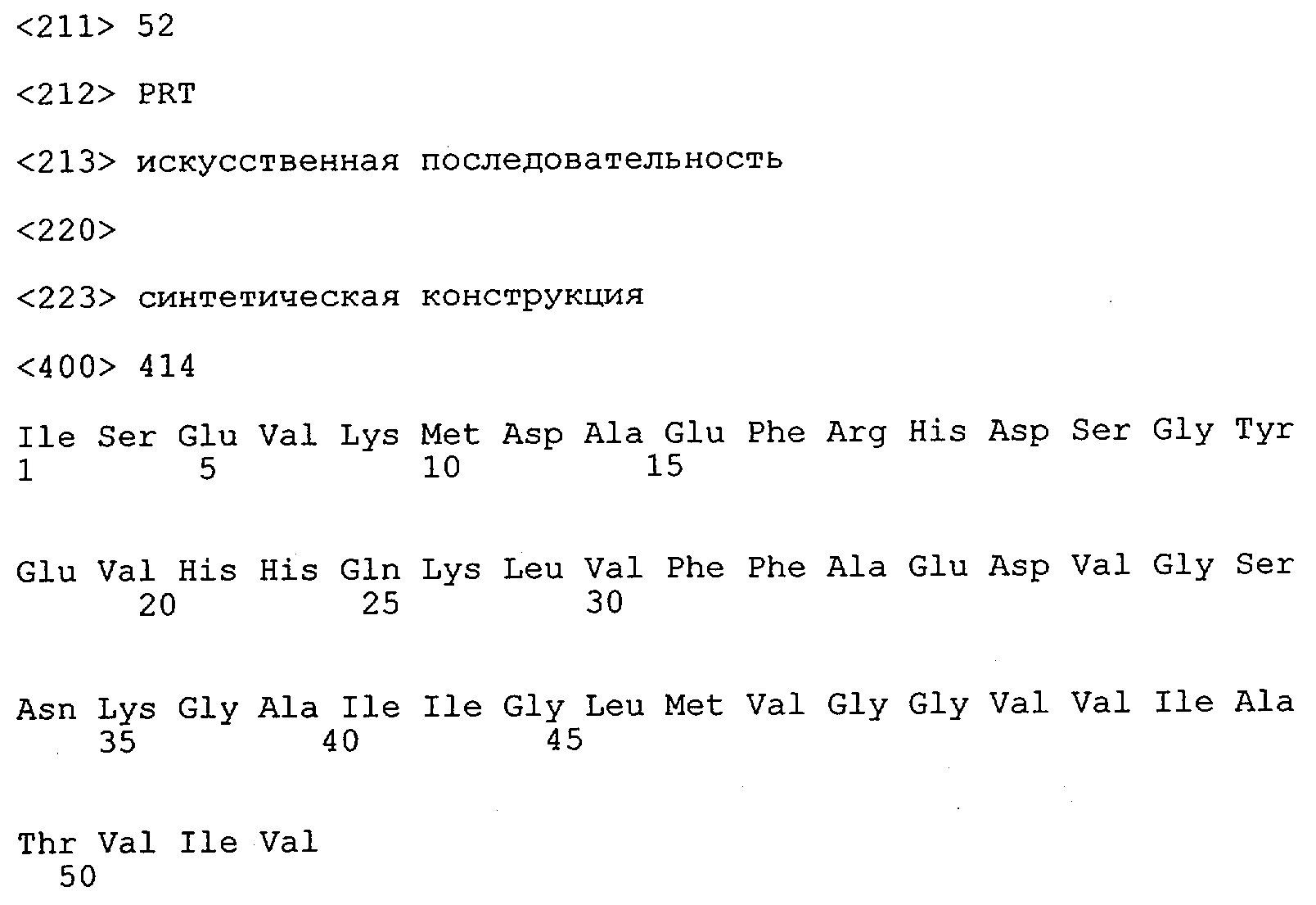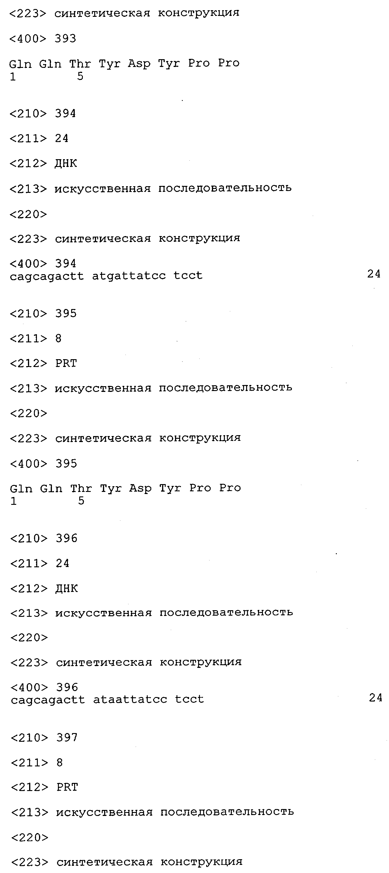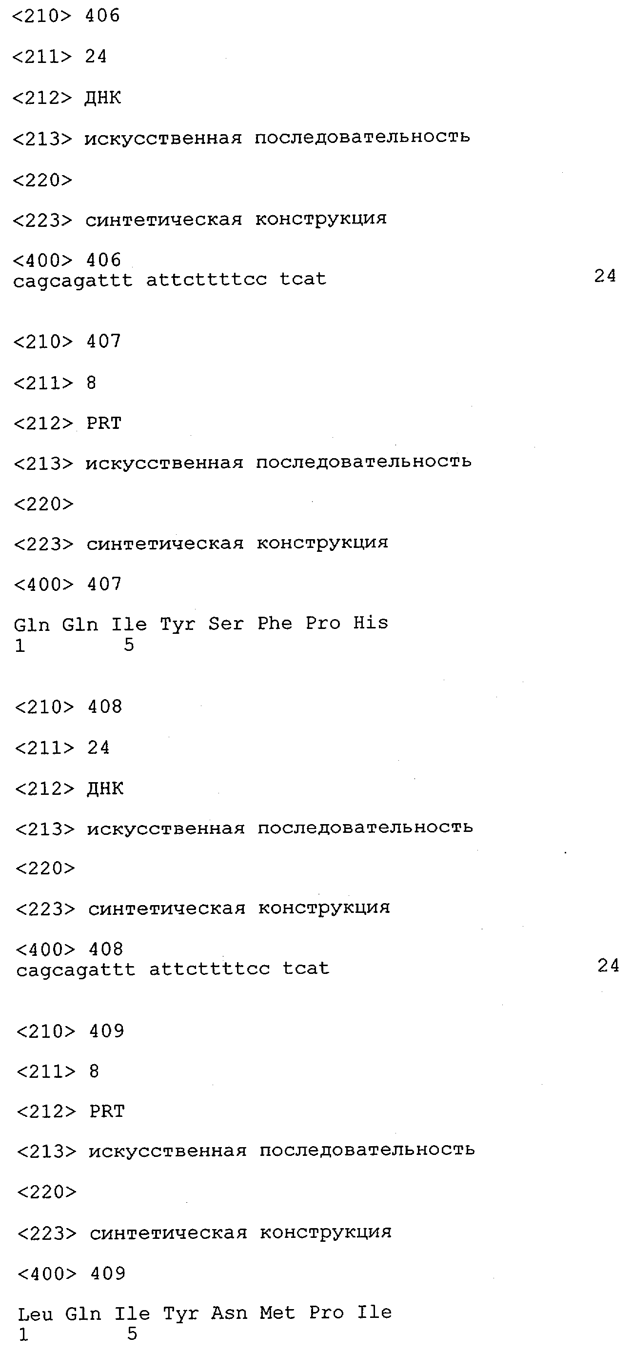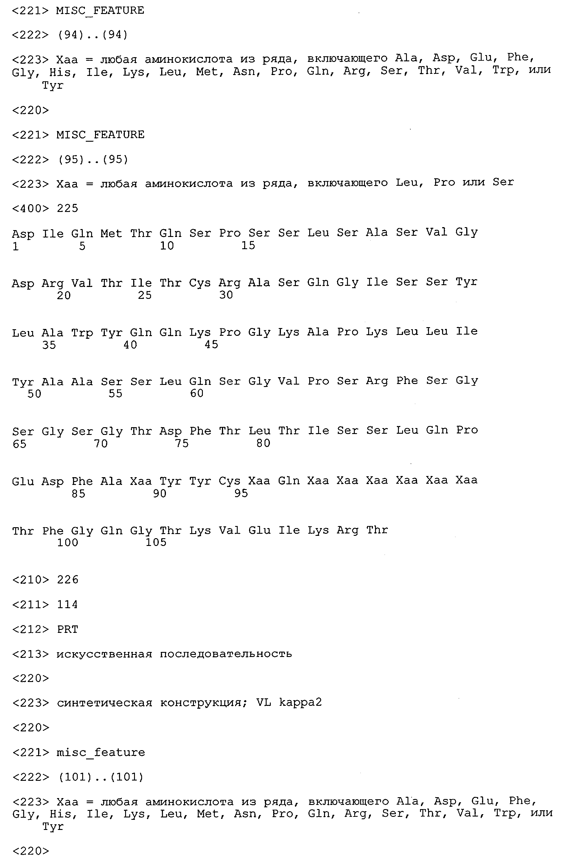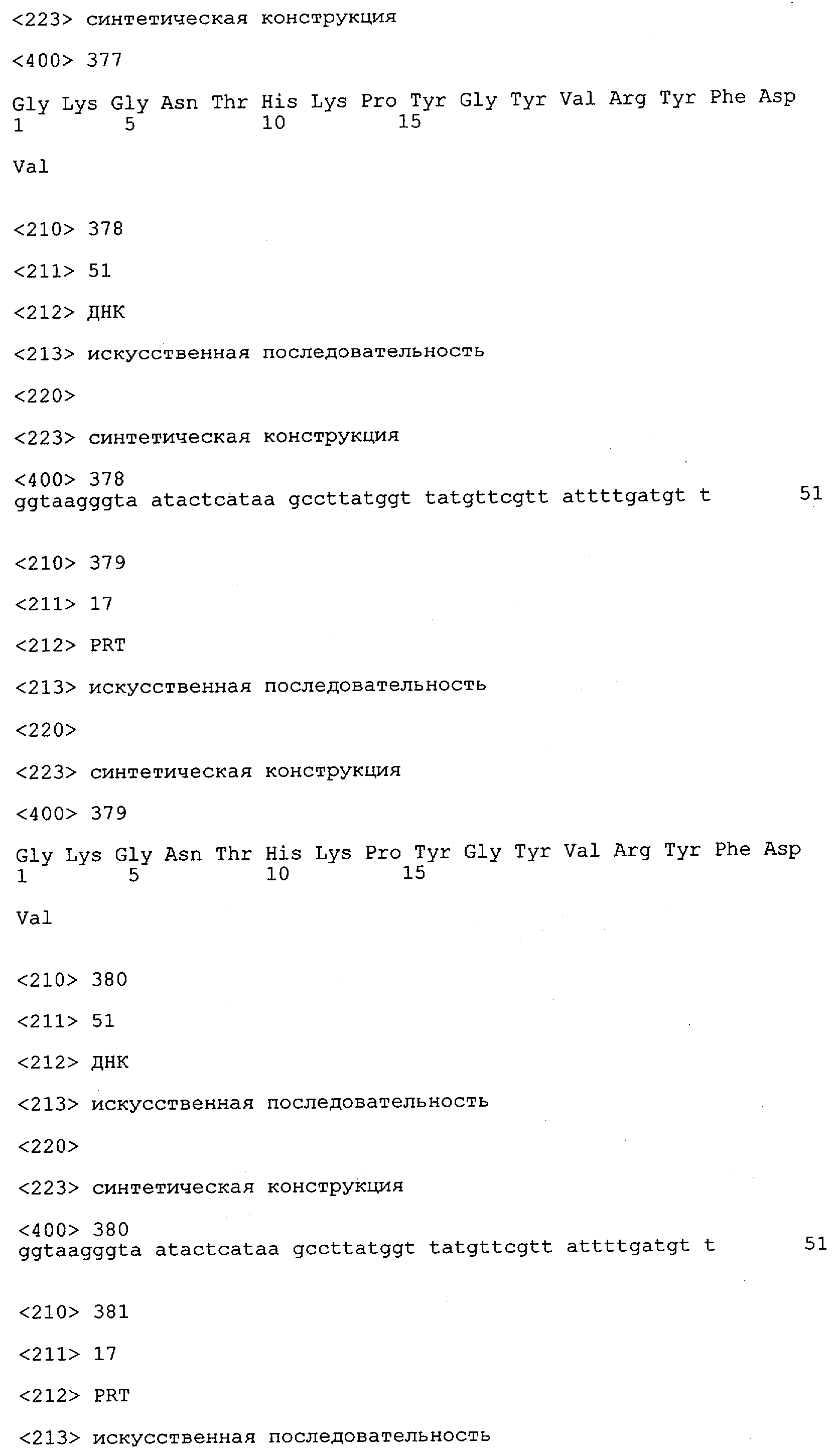 Понятие может относиться также к конформационному эпитопу, структурному эпитопу или к прерывистому эпитопу, состоящему из указанных двух областей или их фрагментов; см. также у Geysen (1986), loc. cit. В контексте настоящего описания конформационный эпитоп определен двумя или большим количеством дискретных аминокислотных последовательностей, разделенных на первичной последовательности, которые появляются вместе на поверхности, когда происходит укладка полипептида с образованием нативного протеина (Sela, Science 166, 1996, с.1365 и Laver, Cell 61, 1990, сс.553-556). Молекулы антител, предлагаемые в настоящем изобретении, вероятно, специфически связываются/взаимодействуют с конформационным(ыми)/структурным(и) эпитопом(ами), который(е) состоят из и/или содержат две описанные выше области -А4 или их фрагменты, что будет подробнее описано ниже. Считается, что «молекулы антител», предлагаемые в настоящем изобретении, обладают одновременно и независимо двойной специфичностью по отношению к (а) аминокислотному участку, содержащему аминокислоты 2-10 (или его фрагменту(ам)) пептида -А4, и (б) аминокислотному участку, содержащему аминокислоты 12-25 (или его фрагменту(ам)) пептида -А4 (SEQ ID NO.27). Фрагменты или части этих участков содержат по меньшей мере две, более предпочтительно по меньшей мере три аминокислоты. Предпочтительные фрагменты или части расположены в первой области/участке SEQ ID NO:27 и имеют аминокислотные последовательности AEFRHD, EF, EFR, FR, EFRHDSG, EFRHD или HDSG и во второй области/участке SEQ ID NO:27 и имеют аминокислотные последовательности HHQKL, LV, LVFFAE, VFFAED VFFA или FFAEDV. Как отмечалось выше, эти фрагменты могут содержать также дополнительные аминокислоты или могут представлять собой части указанных выше фрагментов. Их конкретными примерами являются DAE, DAEF, FRH или RHDSG.