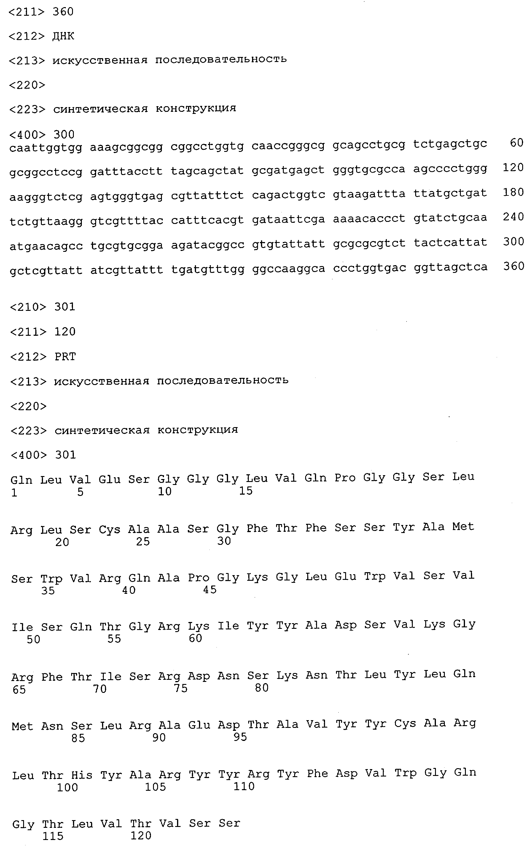 Таким образом, настоящее изобретение относится к молекуле антитела, которая обладает способностью специфически распознавать две области пептида -А4/А 4, где первая область содержит аминокислотную последовательность AEFRHDSGY (SEQ ID NO:1) или ее фрагмент, а вторая область содержит аминокислотную последовательность VHHQKLVFFAEDVG (SEQ ID NO:2) или ее фрагмент.