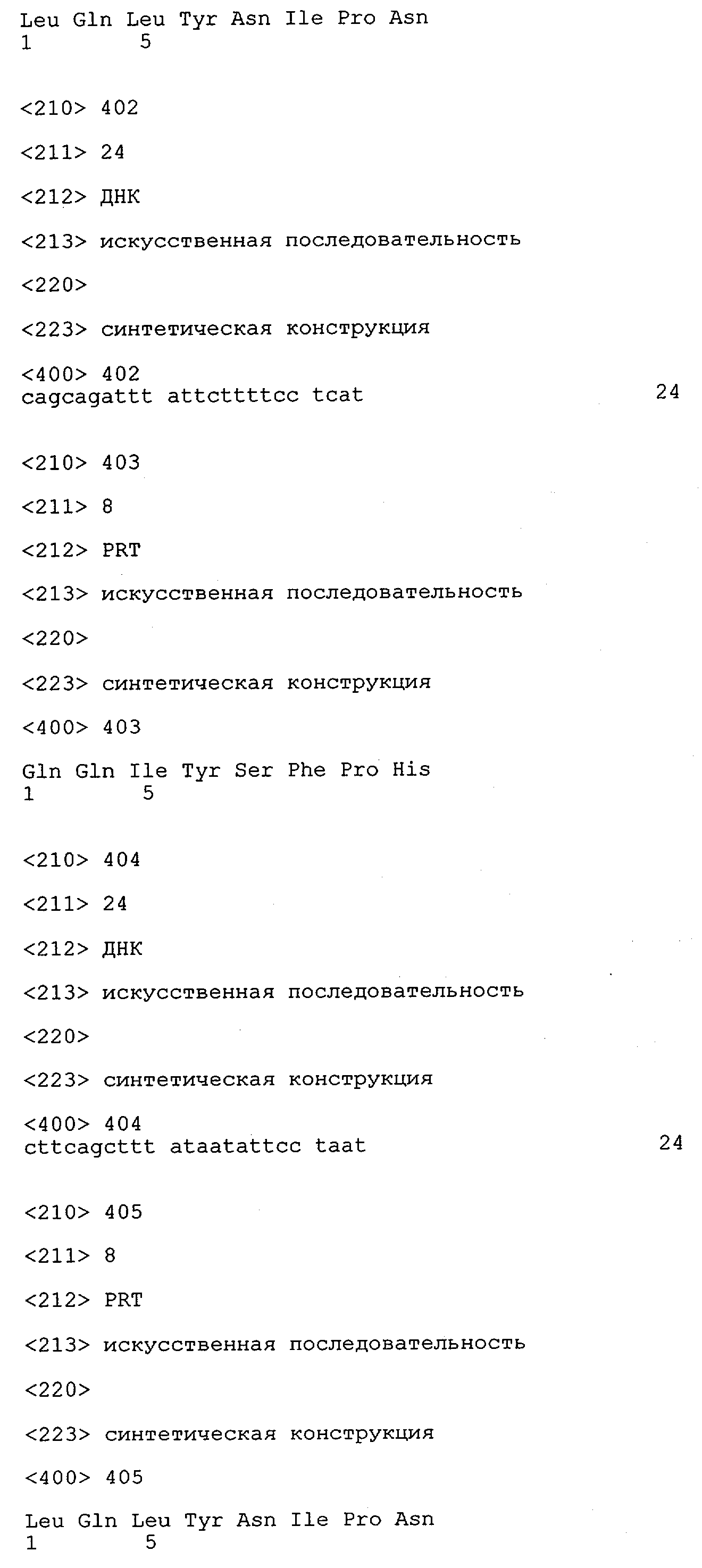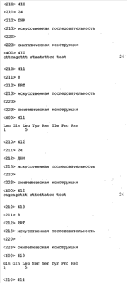 Контролирующие элементы, которые обеспечивают экспрессию в эукариотических и прокариотических клетках, хорошо известны специалистам в данной области. Как отмечено выше, они, как правило, включают регуляторные последовательности, которые обеспечивают инициацию транскрипции, и необязательно поли-А-сигналы, обеспечивающие терминацию транскрипции и стабилизацию транскрипта. Дополнительные регуляторные элементы могут представлять собой энхансеры транскрипции, а также трансляции и/или встречающиеся в естественных условиях или гетерологичные промоторные области. Возможные регуляторные элементы, которые обеспечивают экспрессию, например, в клетках-хозяевах, полученных из организма млекопитающих, представляют собой промотор тимидинкиназы CMV-HSV (цитомегаловирус-вирус простого герпеса), промотор ОВ40, RSV (вирус саркомы Рауса), промотор человеческого фактора 1 удлинения, индуцируемый глюкокортикоидом промотор MMTV (вирус мышиного лейкоза Молони), индуцируемые металлотионеином или тетрациклином промоторы, или энхансеры типа CMV-энханмера или ОВ40-энхансера. Для экспрессии в нейронах можно применять промоторы нейрофиламента, PGDF (тромбоцитарный фактор роста), NSE (нейрон-специфическая энолаза), РгР (обогащенный пролином протеин слюнных желез) или thy-1-промоторы. Такие промоторы хорошо известны в данной области и описаны среди прочего у Charron, J. Biol. Chem. 270, 1995, сс.25739-25745. Для экспрессии в прокариотических клетках описана группа промоторов, включающая, например, tac-lac-промотор или trp-промотор. Помимо элементов, ответственных за инициацию транскрипции, регуляторные элементы могут также представлять собой сигналы терминации транскрипции, такие как ОВ40-поли-А-сайт или tk-поли-А-сайт, расположенные по ходу транскрипции полинуклеотида. В этом контексте приемлемыми экспрессионными векторами являются известные в данной области векторы, такие как вектор для экспрессии кДНК Окаяма-Берга (Okayama-Berg) pcDVl (фирма Pharmacia), pRc/CMV, рсДНК1, рсДНК3 (фирма In-vitrogene), pSPORTI (фирма GIBCO BRL), рХ (Pagano, Science 255, 1992, сс.1144-1147), дрожжевые двухгибридные векторы, такие как pEG202 и dpJG4-5 (Gyuris, Cell 75, 1995, сс.791-803), или прокариотические экспрессионные векторы, такие как лямбда gtll или pGEX (фирма Amersham-Pharmacia). Помимо молекул нуклеиновых кислот, предлагаемых в настоящем изобретении, вектор может содержать также нуклеотидные последовательности, кодирующие сигналы секреции. Такие последовательности хорошо известны специалисту в данной области. Кроме того, в зависимости от применяемой системы экспрессии к кодирующим последовательностям молекул нуклеиновых кислот, предлагаемых в изобретении, можно добавлять лидерные последовательности, которые обладают способностью обеспечивать направленный перенос пептидов, предлагаемых в изобретении, в клеточные компартменты, и они хорошо известны в данной области. Лидерную(ые) последовательность(и) объединяют во время соответствующей фазы с трансляционными, инициирующими и терминирующими последовательностями, и предпочтительно лидерная последовательность обладает способностью обеспечивать секрецию транслируемого протеина или образовавшегося из него протеина в периплазматическое пространство или во внеклеточную среду. Необязательно гетерологичная последовательность может кодировать слитый протеин, который включает С- или N-концевой служащий для ид