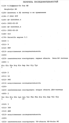 Согласно предпочтительному варианту осуществления изобретения молекула антитела, предлагаемая в изобретении, представляет собой молекулу антитела, где по меньшей мере две области -А4, специфически распознаваемые этим антителом, образуют конформационный эпитоп/структурный эпитоп или прерывистый эпитоп; см. у Geysen (1986), loc. cit.; Ghoshal, J. Neurochem. 77, 2001, сс.1372-1385; Hochleitner, J. Imm. 164, 2000, сс.4156-4161; Laver (1990), loc. cit. Понятие «прерывистый эпитоп» в контексте настоящего описания обозначает нелинейные эпитопы, состоящие из остатков из отдаленных друг от друга участков полипептидной цепи. Эти остатки появляются вместе на поверхности при укладке полипептидной цепи в трехмерную структуру для образования конформационного/структурного эпитопа. Настоящее изобретение относится к предпочтительным неизвестным ранее эпитопам в -А4, которые обеспечивают секрецию согласно изобретению специфических молекул антител, обладающих способностью взаимодействовать с этими эпитопами. Эти предлагаемые в изобретении антитела/молекулы антител являются основой для повышения эффективности и обладают пониженной способностью оказывать побочные действия. Как отмечалось выше, предлагаемые в изобретении антитела при этом обладают также способностью независимо взаимодействовать с каждой(ым) из указанных двух областей/эпитопов -А4, например, что установлено с помощью pepspot-анализов, описанных ниже в примерах.