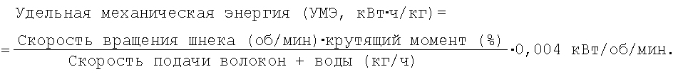 Овсяные волокна, произведенные фирмой Oat Bran Concentrate, Suomen Viljava Oy, Финляндия, экструдировали при помощи экструдера модели APV MPF 19/25, произведенного фирмой K-·Tron Ag, 95% овсяных волокон имели размер в диапазоне от 100 до 500 мкм. Волокна также содержали 17% -глюкана в расчете на сухой вес. Скорость подачи, скорость вращения шнека экструдера и крутящий момент записывались и использовались для расчета количества удельной энергии (кВт·ч/кг), потребляемой для измельчения овсяных волокон, в соответствии со следующим уравнением: