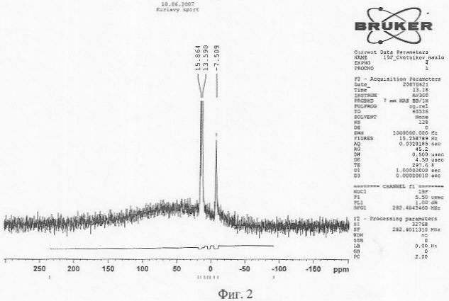 Наличие фторорганических групп в растворе подтверждается методом ЯМР. На фиг.2 приведен ЯМР-спектр спиртового раствора вещества, полученного деструкцией фторопласта в плазме электрического разряда. Спектр ЯМР содержит узкие линии со значениями химического сдвига, равными 15,864 м.д. (миллионных долей) и 13,590 м.д., которые находятся в областях, характерных для связей фтор-углерод, а также широкую фоновую линию от ядер фтора. Первое указывает на присутствие в растворе индивидуальных фторорганических молекул, то есть на то, что мы имеем дело с истинным раствором фторорганических соединений, второе на присутствие в растворе фторорганических соединений в твердом виде.