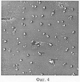 На фиг.4 показано АСМ изображение включающего изолированные наночастицы покрытия, образовавшегося после нанесения на поверхность спиртового раствора продуктов термодеструкции ПТФЭ и последующего испарения спирта. Площадь изображения 0,6×0,6 мкм.