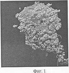 Твердые продукты термодеструкции политетрафторэтилена, оседающие на приемнике-собирателе (либо на стенках реактора), представляют собой агломераты частиц, которые по своим размерам, не превышающим 0,1 микрона, могут быть отнесены к нанодисперсным материалам. Вид осажденных твердых продуктов термодеструкции показан на фиг.1, который представляет собой снимок, полученный с помощью атомно-силового микроскопа (АСМ). (Площадь снимка 1,8×1,8 мкм).