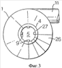 Фиг.3 изображает вид сверху первичного циклона 1, на котором иллюстрируется тангенциально расположенное входное отверстие, соединенное с трубопроводом (11), и уменьшающие завихрение перегородки (9) внутри трубопровода (4), которые просматриваются через отверстие (5). Также показан верхний край трубопровода (4), который представляет собой коническое отверстие (27).