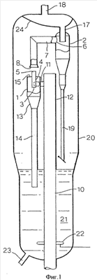 Фиг.1 представляет собой предпочтительное воплощение аппарата настоящего изобретения. На рассматриваемой Фиг.1 показан вертикальный реактор (10) процесса крекинга в псевдоожиженном слое катализатора, который гидравлически соединен через трубопровод (11) с первичным циклоном (1). В целях упрощения на Фиг.1 показан только один первичный циклонный сепаратор. Обычно более одного, как правило, два или три первичных циклонных сепаратора (1) могут быть гидравлически связаны с нижней частью (12) вертикального реактора (10). Первичный циклон (1) включает трубчатый корпус, снабженный тангенциально расположенным входным отверстием для приема суспензии частиц катализатора и паров углеводорода, которые выходят из вертикального реактора (10). Нижний конец трубчатого корпуса гидравлически соединен с помощью секции (13), имеющей усеченные конические стенки, с гидравлической трубой (dipleg) (14). Через элемент (14) большая часть частиц катализатора выгружается вниз. Верхняя часть трубчатого корпуса снабжена корпусом (15). Корпус (15) снабжен коническим кольцевым отверстием (16), через которое проходит трубопровод для выхода газа (4).