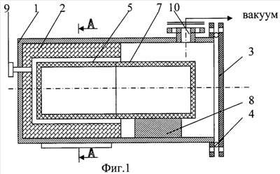 Реактор 1 снабжен патрубком 10 для создания вакуума и фланцами 11 для ввода электродов 6 и подключения к трансформатору.