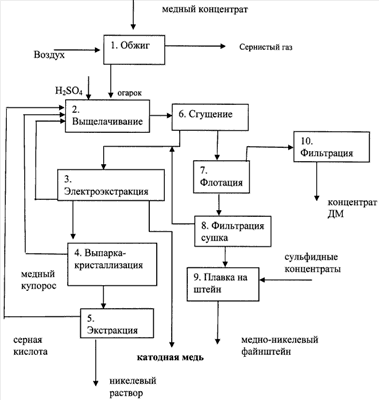 Окислительный обжиг медного концентрата обеспечивает минимальный переход в раствор железа и никеля в процессе выщелачивания оборотным электролитом, при этом нежелательные примеси, в первую очередь железо, остаются в остатке выщелачивания.
