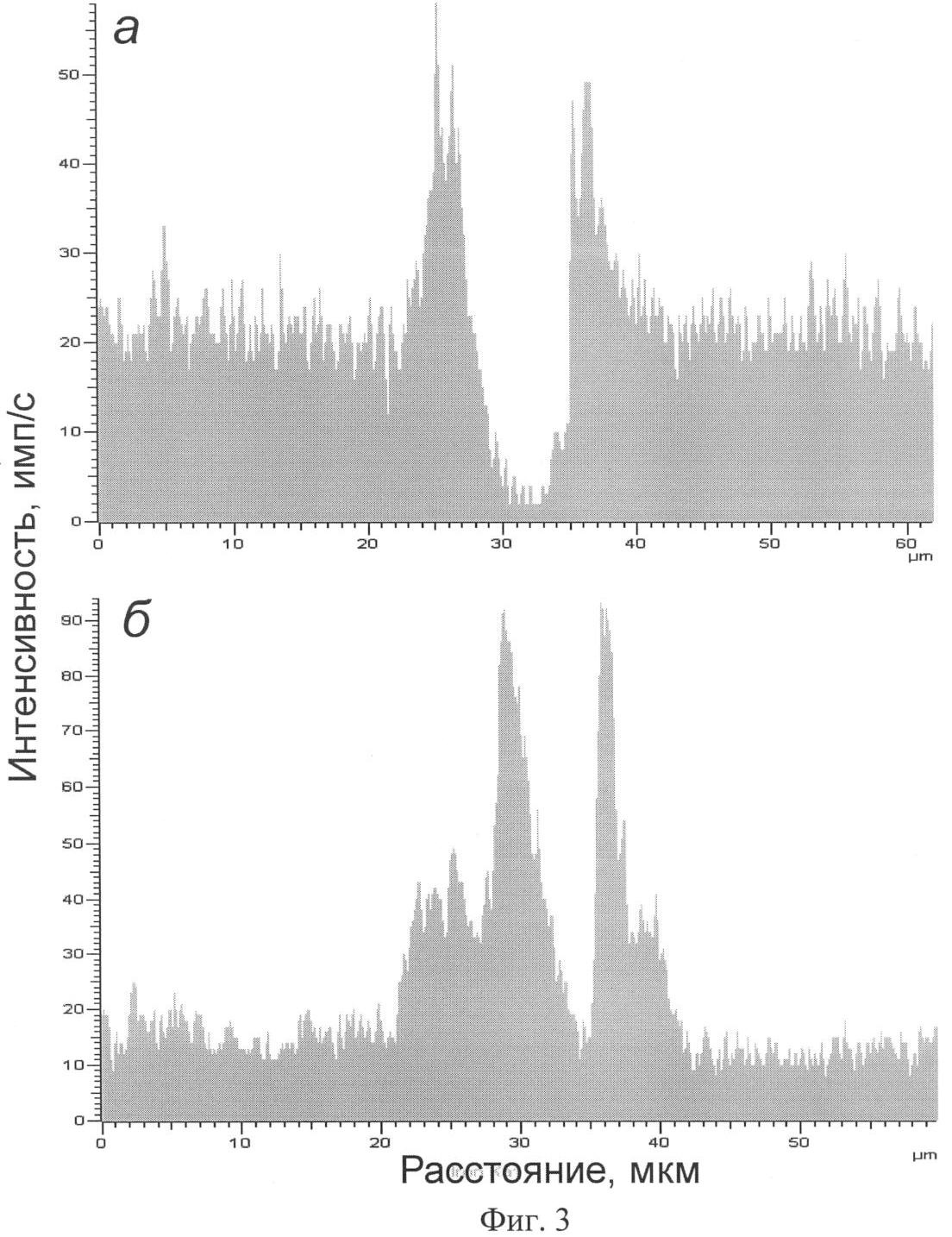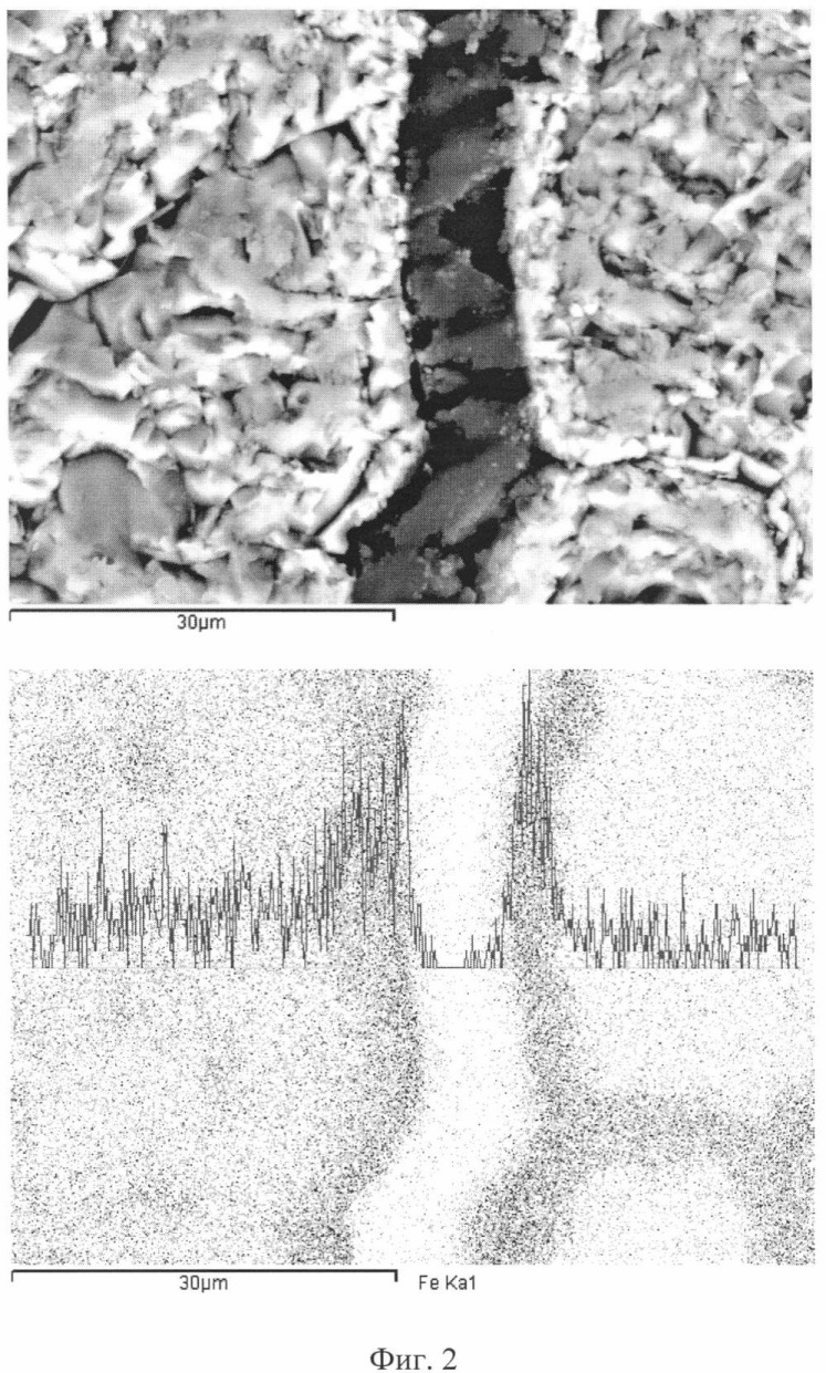 Сущность способа поясняется иллюстрациями, на которых на фиг.1 дана схема последовательности операций при выполнении способа; на фиг.2 показано концентрирование железа в хромитовой руде месторождения Рай-Из на границе хромита с вмещающей породой (магниевый силикат) после нагрева до 1000°С и изотермической выдержкой 180 минут; на фиг.3 – концентрирование железа на границе хромита с вмещающей породой в зависимости от времени выдержки при 1000°С: а) изотермическая выдержка 60 минут, б) изотермическая выдержка 240 минут.