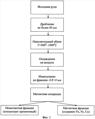 Способ обогащения магнезиальных хромитовых руд, включающий дробление руды, обжиг, охлаждение и магнитную сепарацию с получением хромитового железного концентрата и железосодержащего продукта, отличающийся тем, что дробление ведут до фракции не более 80 мм, обжиг осуществляют в окислительной атмосфере в интервале температур 900-1000°С и проводят выдержку в этом интервале температур в течение времени, определяемого необходимой степенью обогащения, охлаждение осуществляют на воздухе, а перед магнитной сепарацией проводят измельчение руды до фракции -0,8 мм.