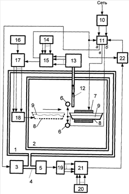 Изобретение относится к автоматическим технологическим средствам, а в частности – к средствам автоматической кристаллизации полупроводников в технологии микро- и нано- электронной аппаратуры. Установка кристаллизации расплава лейкосапфира содержит вакуумную камеру, в которой размещена теплоизолированная камера, вакуумный насос, соединенный патрубком с вакуумной камерой, источник тепловой энергии, лодочку с шихтой, размещенную на общей оси с источником тепловой энергии, датчик глубины вакуума, соединенный патрубком с вакуумной камерой, датчик температуры расплава, блок электрического питания, соединенный входом с электрической сетью, и блок управления, который первым выходом соединен со входом вакуумного насоса, вторым выходом – с источником тепловой энергии, при этом в установку введены канал оптической связи, проходящий через стенки теплоизолированной и вакуумной камер на внешнюю поверхность вакуумной камеры, и ориентированный максимумом диаграммы направленности излучения на содержимое лодочки, и соединенный выходом с оптическим входом датчика температуры расплава, электромеханический привод перемещения лодочки, соединенный выходом с лодочкой, электромагнит, расположенный на одной оси с источником тепловой энергии в теплоизолированной камере и гальванически соединенный с третьим выходом блока управления, первый задатчик – задатчик температуры содержимого лодочки, первый элемент сравнения, соединенный поразрядно первыми входами с выходами датчика температуры расплава, вторыми входами – с выходами первого задатчика, а первым выходом – с первым управляющим входом блока управления, генератор тактовых импульсов, распределитель импульсов, соединенный сигнальным входом с выходом генератора импульсов, управляющим входом – со вторым выходом первого элемента сравнения, а выходом – пофазно со входами электромеханического привода перемещения лодочки, аналого-цифровой преобразователь, соединенный входом с выходом датчика глубины вакуума, второй задатчик – задатчик глубины вакуума в вакуумной камере, второй элемент сравнения, соединенный поразрядно первыми входами с выходами второго задатчика, а вторыми входами – с выходами датчика глубины вакуума в вакуумной камере, и элемент ИЛИ, соединенный первым входом с выходом второго элемента сравнения, вторым входом – с первым выходом первого элемента сравнения, а выходом – со вторым управляющим входом блока управления, причем блок управления соединен силовыми входами с выходами блока питания, первым выходом со входом вакуумного насоса, а вторым выходом – со входом источника тепловой энергии, датчик глубины вакуума в вакуумной камере выполнен на инверсно-магнетронном вакуумметре, датчик температуры расплава – на многоканальном радиационном пирометре, а электромеханический привод перемещения лодочки – на шаговом двигателе. Установка обеспечивает улучшение свойств кристаллов лейкосапфира (диэлектрической проницаемости до =5,63, против =5,87, и твердости до N=9,23, против N=8,96) кристаллов лейкосапфира, а также расширение диапазонов технологических параметров, температуры и глубины вакуума, повышенную точность технологического процесса выращивания кристаллов лейкосапфира при одновременной минимизации временных и энергетических затрат. 1 ил.