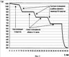 Из диаграммы, изображенной на фиг.1, следует, что в бинарном соединении, например CdTe, при переходе первого рода в случае медленного охлаждения происходит изменение составов фаз вдоль линий солидус, ограничивающих двухфазные области (области (I+II), (II+III), фиг.1). При быстром охлаждении кристалла в области температур фазового перехода, состав низкотемпературной фазы не успевает измениться и фазовый переход протекает, как в однокомпонентной системе, т.е. без изменения состава кристалла или, как квазиунарный переход [3]. Такой процесс протекает через промежуточные состояния очень высокого разупорядочения, сопровождающегося, например, переходами атомов Cd и Те в междоузлия, которые могут быть частично заморожены. Отсюда вытекает необходимость приведения кристалла в равновесное состояние путем его выдержки в течение достаточно длительного времени при температуре, которая соответствует его монофазному состоянию и находится ниже температуры фазового перехода. Для реализации изложенных положений процесс формирования электрофизических и структурных параметров кристалла необходимо вести ступенчатым образом, чередуя процессы быстрого охлаждения периодами выдержки кристалла в течение определенного периода времени, как показано на фиг.2.