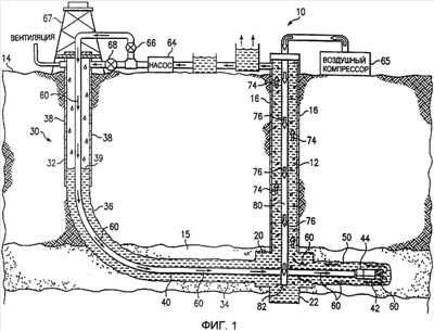 Буровой раствор, закачиваемый через сочлененную скважину 30 снаружи сочлененной бурильной трубы 40, может быть также смешан с газом, чтобы образовать жидкую смесь, поднимающуюся к поверхности по существенно вертикальной скважине 12 снаружи трубопровода 80.