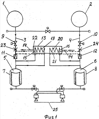 По второму варианту при использовании воздуха или азота после дроссельных устройств 23, 24 газообразное вещество с давлением порядка 30 кГс/см2 поступает в каналы 18 змеевиков 19 и 20, где подогревается до заданной температуры от теплоносителя бортовой СТР 14, прокачиваемого через межтрубную полость 21 теплобменника 15. Далее подогретый газ (подогрев газа улучшает работу газовых редукторов) поступает в газовые редукторы 11, 12, которые понижают давление газа до 10 кГс/см2. При таком перепаде (с 30 до 10 кГс/см2) давления понижение температуры предварительно подогретого газа практически не происходит. После газовых редукторов 11, 12 газ при давлении 10 кГс/см2 подается в газовые полости 5, 6 топливных баков 7, 8, откуда производится выдавливание и подача топлива к потребителю, например к РД 25.