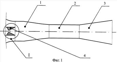 Предлагаемое изобретение иллюстрируется чертежами, на которых изображены: на фиг.1 – схема газового эжектора, на фиг.2 – вид сверхзвукового сопла с табами в увеличенном масштабе.