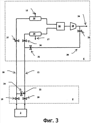 Как указывалось выше, газ добывается из пласта 2 и пропускается через добывающую установку 4 в один или оба трубопровода 10, 12 для транспортировки в обрабатывающую установку 6. В обрабатывающей установке жидкость отделяется от газа в первой ловушке для конденсата и входном сепараторе 14, во второй ловушке для конденсата и входном сепараторе 16, которые сами по себе известны, и отделенная жидкость выпускается известным образом через соответствующие выходы 15, 17. Затем газ обрабатывается далее в обрабатывающем оборудовании 26 перед прохождением в экспортный компрессор 28 для дальнейшей транспортировки через экспортный трубопровод 34. Обработка в первой ловушке для конденсата и входном сепараторе 14, во второй ловушке для конденсата и входном сепараторе 16 и обрабатывающем блоке 28 соответствует уровню техники и не включается в изобретение. На фиг.3 показаны также несколько клапанов, описание функций которых будет приведено ниже. Следует также отметить, что показаны лишь компоненты, которые необходимы или целесообразны для описания изобретения.