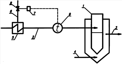 Способ состоит из следующих операций. Исходную воду нагревают до заданной температуры с помощью подогревателя исходной воды 5. От датчика 9 температуры исходной воды подают сигнал на регулятор 7 температуры. При отклонении температуры от заданной оптимальной величины от регулятора 7 температуры подают сигнал на регулирующий орган 8. С помощью регулирующего органа 8 изменяется расход греющего агента, подаваемого по трубопроводу 6 греющего агента, и тем самым восстанавливают температуру исходной воды до величины, необходимой и достаточной для поддержания слоя взвешенного осадка в спокойном состоянии. Во всех режимах работы, независимо от расхода воды, с помощью регулятора 7 температуры поддерживают заданную температуру воды, которую определяют исходя из состава исходной воды и технико-экономических соображений: так, в ряде случаев для эффективного и экономичного осветления поддерживают заданную температуру исходной воды 20±1°С, а в других случаях – 35±1°С.