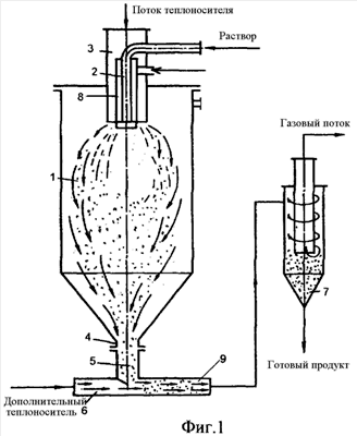 Установка содержит камеру 1, акустическую пневматическую форсунку 2 для распыливания маточного раствора гипохлорита кальция, трубопровод 3 для подачи инертного газообразного теплоносителя, патрубок 4 разгрузки сухого материала, соединенный с трубопроводом 5, в котором осуществляется пневмотранспорт высушенного материала, патрубок 6 для подвода к трубопроводу 5 потока дополнительного теплоносителя. Для подачи распыливающего агента (воздуха) служит патрубок с коаксиальной обоймой 8. Трубопровод 5 другим концом 9 подключен к системе пылеочистки 7. В качестве распылителя используется акустическая форсунка (фиг.2), которая содержит полый корпус 10 с размещенным внутри генератором ультразвуковых колебаний в виде сопла 12 и кольцевого объемного резонатора 14. Корпус 10 выполнен в виде вертикально расположенной цилиндрической втулки, в верхней части которой расположена трубка 16 для подвода воздуха, перпендикулярно ее оси расположена трубка 17 для подвода раствора. Внутри корпуса 10, соосно ему, жестко закреплена втулка 23 с фланцами 11 и 15 верхним и нижним, причем нижний фланец 15 жестко зафиксирован в проточке, выполненной в корпусе 10. Внутри втулки, соосно ей, расположен кольцевой объемный резонатор 14, выполненной в виде чашки 18 с конической поверхностью 20.