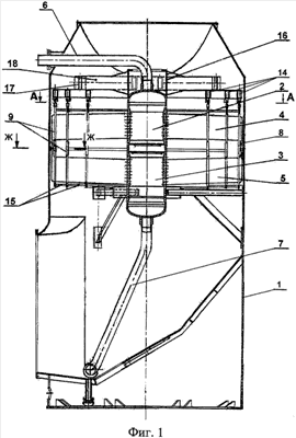 На чертеже показано, что устройства 9 верхними концами посредством верхних шарниров 13 соединены с опорно-кольцевыми горизонтальными балками 14, которые расположены над пучком ширм. При этом кольца 15 расположены под пучком ширм. Таким образом, реализуется подвесной вариант крепления пучка в теплообменнике.
