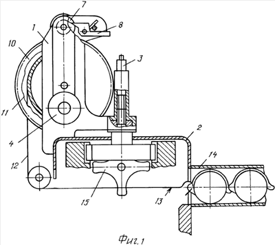 Подача патронов в приемник при заряжании оружия происходит следующим образом. Корпус 1 устройства устанавливают на приемник 2 и закрепляют винтом 3. Трос 12 пропускают внутри гибкого рукава 14 и с помощью зацепа 13 фиксируют на патронной ленте. Вращением рукоятки 4 патронная лента подтягивается к приемному окну приемника 2. Для предотвращения обратного движения патронной ленты под собственным весом при отпускании рукоятки 4, служит храповое колесо 7 с подпружиненной собачкой 8. После вхождения патрона в приемное окно приемника 2 до упора в звездочку механизма 15, корпус 1 устройства отстыковывается от приемника 2 оружия и производится досылание патрона в патронник ствола.