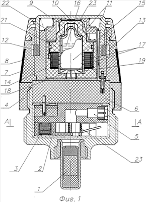 Сверху ампула 15 через демпфирующий кожух 20 нагружена массивной втулкой 21, в центральном окне которой помещен контактный выступ 10 крышки 9 и металлический колпачок 22 кожуха 20.