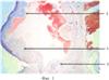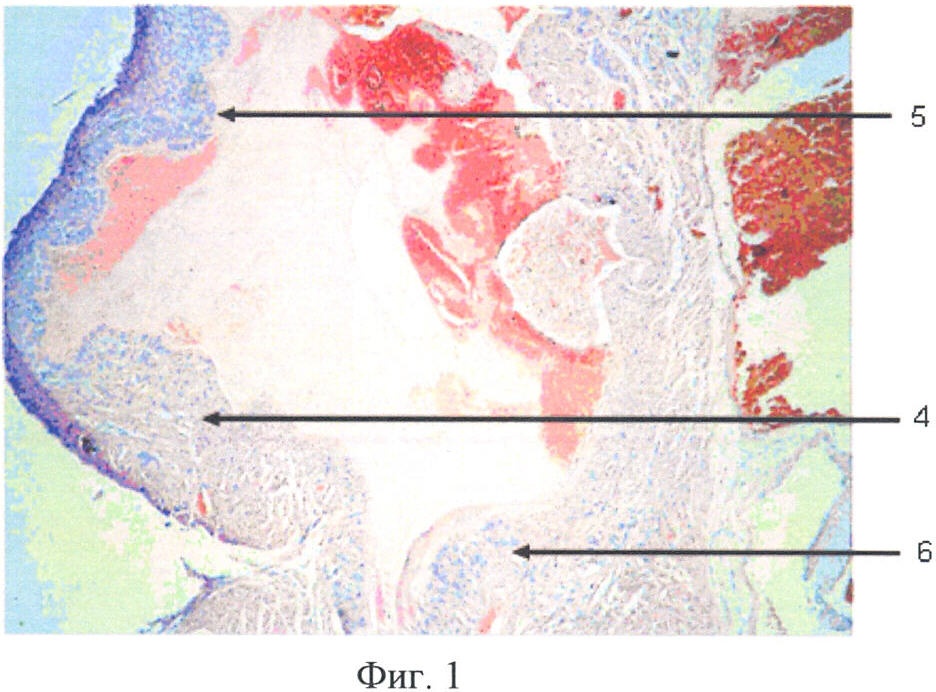 На фиг.1 представлен гистологический срез правого предсердия, на фиг.2 – гистологический срез на уровне трикуспидального клапана, где 1 – створка клапана, 2 – эндотелий, 3 – тромботические наложения, 4 – стенка правого предсердия, 5 – эндокард с продуктивным воспалением и тромботическими массами, 6 – створка клапана с продуктивным воспалением и тромботическими массами.