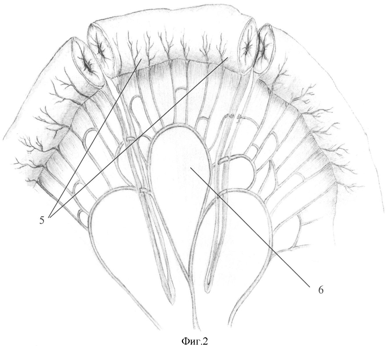 Строго по противобрыжеечному краю выкроенного сегмента тонкой кишки продольно иссекают участок кишечной стенки, оставляя лоскуты шириной 0,5 см от краев брыжейки. При сильном кровотечении из сосудов подслизистого слоя их лигируют. Свободные края кишечной стенки сшивают между собой однорядными серозно-мышечно-подслизистыми узловыми швами монофиламентной нитью. Таким образом формируют тонкую (внешним диаметром до 1 см) трубочку из кишки на участке брыжейки (фиг.3-5).