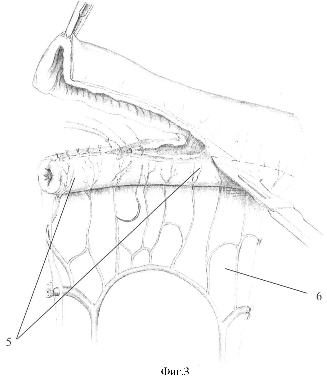 Далее приступают к формированию анастомоза с двенадцатиперстной кишкой. При этом трансплантат располагают вдоль нисходящей ветви двенадцатиперстной кишки. Анастомоз формируют на границе ее средней и нижней трети. Предварительно брыжейку трансплантата в бессосудистых зонах за листки брюшины фиксируют несколькими швами к стенке двенадцатиперстной кишки. Отверстие в стенке двенадцатиперстной кишки проделывают следующим образом: серозную оболочку рассекают на протяжении не более 5 мм, а слизистую вскрывают проколом, т.к. отверстие в стенке кишки легко растяжимо, что позволяет сформировать надежный анастомоз, просвет которого будет в последующем легко смыкаться. Формируют прецизионный однорядный анастомоз узловыми серозно-мышечно-подслизистыми швами рассасывающимся монофиламентным синтетическим шовным материалом 6/0 узлами наружу. При этом конец «скрытого» дренажа пропускают в просвет двенадцатиперстной кишки. С помощью 4-6 серо-серозных швов линию швов анастомоза погружают в складку стенки двенадцатиперстной кишки, таким образом усиливая арефлюксные свойства формируемого соустья. Швы располагают в межсосудистых промежутках для исключения нарушения кровоснабжения в анастомозированных стенках.