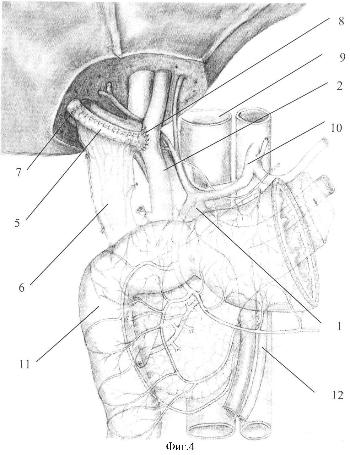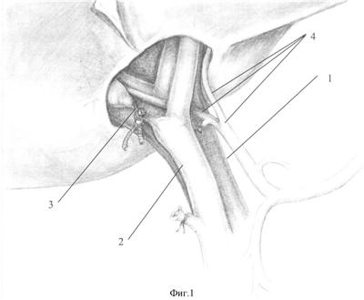 Используя ультразвуковой скальпель (или аппараты, подобные ему), производят резекцию паренхимы печени в области ее ворот, выделяя магистральные трубчатые структуры (воротную вену фиг.1-1, печеночную артерию и их ветви фиг.1-4, общий печеночный проток фиг.1-2, конфлюэкс печеночных протоков и долевые протоки). Выделяют область стриктуры долевого печеночного протока (фиг.1-3) и его проксимальную неизмененную часть (фиг.1). Резецируют рубцово-измененные стенки долевого протока и концы готовят к анастомозированию.