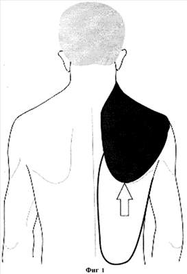 – выкраивают торакодорзальный лоскут, включающий всю широчайшую мышцу спины и обширный участок кожи и подкожной клетчатки над ней, без пересечения питающей сосудистой ножки, что обеспечивает получение полноценного торакодорзального лоскута для одновременного закрытия обширных дефектов кожи и мягких тканей надплечья и лопаточной области любого обьема и площади, который является хорошо кровоснабжаемым комплексом тканей;