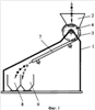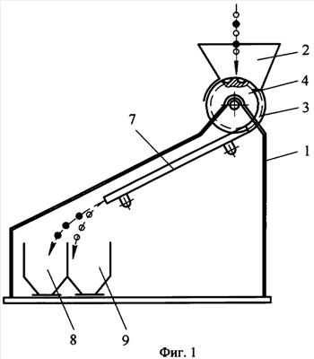 Фрикционный сепаратор работает следующим образом. Исходный продукт, представляющий собой смесь компонентов, частицы которых имеют различие по форме и свойствам поверхности, подается пунктирно из загрузочного приспособления 2 посредством питающего валика 4 в каналы неподвижной плоской гофрированной рабочей поверхности 7. Частицы, двигаясь изолированно по гофрированным каналам вследствие различия фрикционных свойств, приобретают разную скорость в конце рабочей поверхности и поступают в сборники 8 и 9. Частицы с меньшим коэффициентом трения поступают в сборник 8, а с большим – в сборник 9.