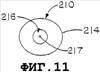 В еще одном варианте реализации настоящего изобретения применяется режущий элемент или лезвие 210 для удаления пленки с наружной поверхности трубы, имеющий криволинейную или закругленную режущую кромку 212 на, по меньшей мере, одном сегменте поверхности режущей кромки лезвия (см. фиг.6). Как здесь описано, в дополнение к тому, чтобы приспособиться к фрезерованию и удалению трубного материала с наружной поверхности трубы, режущее лезвие 210 может удалять мембрану и/или сварочную наплавку и т.п. в случае их присутствия на наружной поверхности трубы. На фиг.6 режущее лезвие 210 включает в себя режущую поверхность, имеющую кольцевую кромку 212. В предпочтительном варианте реализации режущее лезвие 210 имеет режущую кромку, составляющую, по меньшей мере, 1/8 кругового сегмента круга, желательно по меньшей мере 1/4 или 1/2 кругового сегмента круга, и предпочтительно является кольцевой или круговой. С другой стороны, режущее лезвие 210 снабжено криволинейной режущей кромкой 214, имеющей неодинаковые радиусы от определенной точки, такой как центр 217 канала, как показано на фиг.11. Таким образом, в одном варианте реализации режущая кромка 210 имеет овальную или яйцевидную форму.