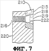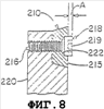 Криволинейное режущее лезвие 210 включает в себя отверстие или канал 216, который может вмещать в себя соединительный или крепежный элемент 218 так, что лезвие может быть прикреплено к опоре 220 режущего лезвия. В одном варианте реализации лицевая поверхность криволинейного режущего лезвия имеет коническую зенковку или выемку 222 вокруг канала 216. Предпочтительно, головка 219 соединительного элемента 218 в установленном или затянутом положении находится по существу заподлицо с поверхностью режущего лезвия 210 и располагается внутри конической зенковки 222, как показано на фиг.7.