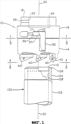 На фиг.1 показан вид в вертикальной проекции фрезерной головки 10 согласно настоящему изобретению, помещенной над заготовкой 100, которая в этом случае является трубой. Заготовка 100 обычно изготовлена из стали, хотя понятно, что для выполнения заготовки могут быть использованы другие металлы, полимеры или их сочетания. Фрезерная головка 10 согласно настоящему изобретению может быть прикреплена к механизированному инструменту 90, как показано на фиг.5, и используется для выполнения операции фрезерования заготовки 100. Фрезерная головка 10 согласно настоящему изобретению используется для, по меньшей мере, удаления материала трубы из внутренней части или поперечника заготовки 100, предпочтительно на участке, отходящем от концевой части трубы. Труба 100, которая показана на фиг.1, подвергается фрезеровке с использованием фрезерной головки 10 согласно настоящему изобретению. Как показано, заготовка 100 является по существу цилиндрической вдоль центральной оси 20. Как показано на чертеже, верхний подвергнутый фрезерованию конец заготовки 100 имеет наружный подвергнутый фрезерованию сегмент 110, расположенный на внутренней поверхности 108. В каждом месте на конце дорожек фрезерования внутреннего и наружного элементов 30, 40 фрезерования создается наклонный уступ. Углы наклона уступа могут изменяться, могут быть постепенными или четко выраженными и обычно зависят от потребностей или желаний конечного пользователя. Наружный уступ может иметь угол, который обычно составляет от приблизительно 0° до приблизительно 85°, желательно от 5° до приблизительно 60°, с предпочтительными углами от приблизительно 10° до приблизительно 45° относительно оси, перпендикулярной центральной оси 20. Угол наружного уступа может быть получен путем фиксации режущей кромки 45 наружного элемента 40 фрезерования трубы под одним из указанных выше углов. На фиг.1 показан угол режущей кромки 45°.