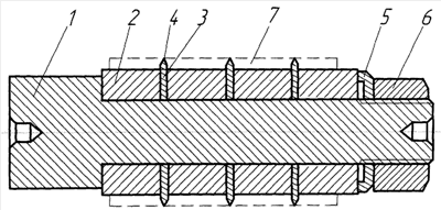 На цилиндрической оправке 1 установлены наплавляемые образцы 2 и твердосплавные диски 3 с режущими кромками 4, поджатые пружиной 5 и гайкой 6. На образцы приварено металлопокрытие 7.