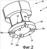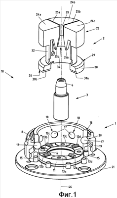 Передняя часть 23 цангового элемента 2 снабжена сужающимся по конусу углублением 34, расположенным у ее задней стороны. Это углубление 34 проходит внутри стержневой части 32 от задней стороны передней части 23 цангового элемента 2 к отверстию 26. Углубление 34 ограничено выступающими коническими расширяющимися стеночными частями 35а и 35b. Стеночные части 35а и 35b подразделены посредством прорезей 25а, 25b в передней части 23 цангового элемента 2. Таким образом, в целом имеются четыре стеночные части, отделенные друг от друга прорезями 25а, 25b. Как только приводной палец 3 заталкивается в углубление 34, зажимные захваты 24а, 24b, 24с (а также четвертый зажимной захват, который на фиг.1 не показан) принудительно отходят друг от друга в радиальном направлении.