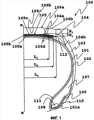 Шина для грузового автомобиля в соответствии с изобретением (подобная показанной на фиг.1), размер 295/80R22,5, была изготовлена посредством использования эластомерной композиции в соответствии с примером 1 для вставки (104).
