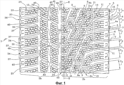 На указанных выше чертежах ссылочной позицией 1 обозначен в целом протекторный браслет шины, выполненный в соответствии с настоящим изобретением; остальные части шины не показаны, поскольку они могут быть выполнены любым способом, удобным для специалиста в данной области техники.