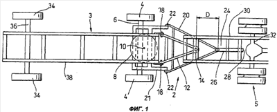 При установке сцепного устройства 2 поворотную плиту 8 присоединяют к шасси 38 прицепа 3 на его переднем конце. Прицеп 3 на своем заднем конце имеет заднюю ось 36, на которую установлены задние левое и правое колеса 34. Направляющая 26 скольжения находится в задней части шасси 30 тягача 5, так что ее открытый конец обращен к заднему краю тягача 5. Направляющая 26 скольжения закреплена непосредственно позади задней оси 32 тягача.