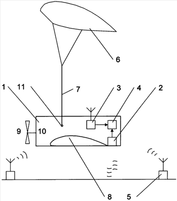 Силовая установка 10 создает горизонтальную тягу, парашютное крыло 6 создает основную подъемную силу и посредством строп 7 передает ее к точке подвеса 11 гондолы 8. Гондола 8 с грузом создает дополнительную подъемную силу, величина которой зависит от угла атаки набегающего воздушного потока. Вес груза, мотора, тяга пропеллера, подъемная сила и сила сопротивления гондолы взаимно уравновешены. При уменьшении веса груза гондола 8 поворачивается относительно точки подвеса 11 таким образом, что угол атаки уменьшается и при полном отсутствии груза становится близок к углу атаки при нулевой подъемной силе. Выполнение гондолы в виде жесткого крыла позволяет повысить взлетный вес летательного аппарата, а изменение подъемной силы при уменьшении веса груза позволяет поддерживать более постоянную нагрузку на парашютное крыло и характеристики его работы.